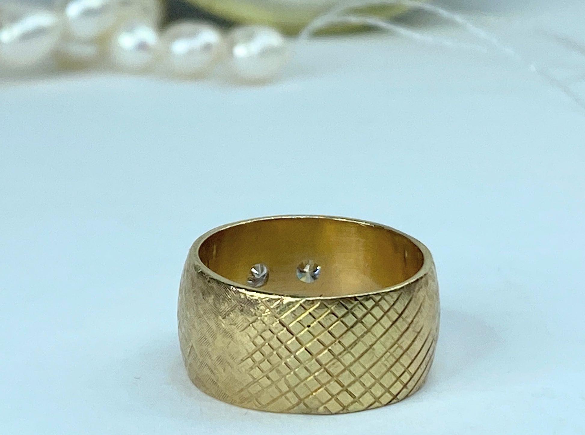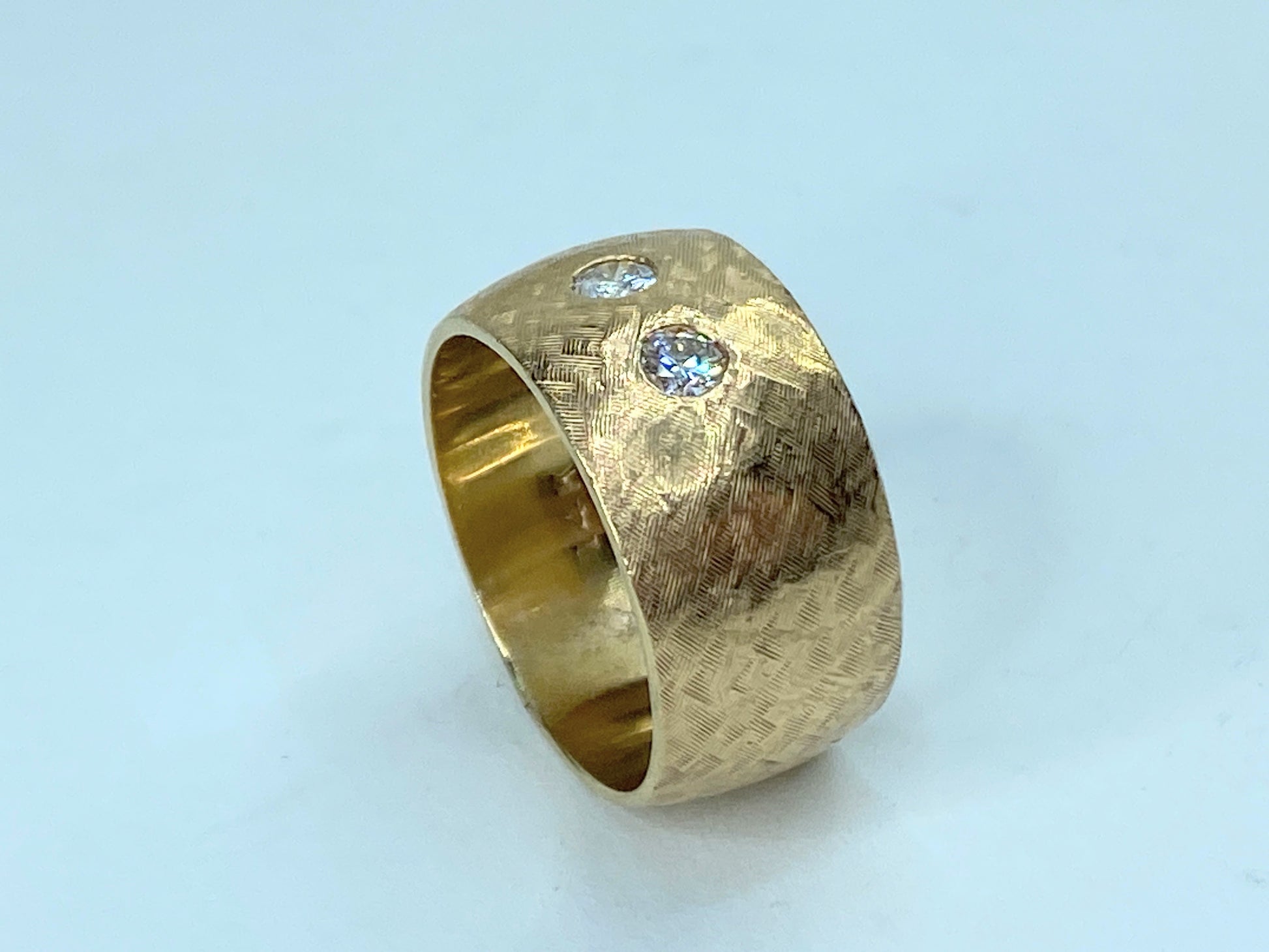 A bold, heavy 14K yellow gold men’s ring featuring a half-circle band and a distinctive hand-hammered finish. The substantial 11.5 mm wideband delivers a confident presence, while two flush-set round brilliant diamonds add refined sparkle. The diamonds measure approximately 3.5 mm and 2.6 mm, combining for about 0.35 carats. Colors range G–H with VS1–VS2 clarity, ensuring bright, near-colourless sparkle that remains masculine and versatile for daily wear or special occasions. The ring is size 9, weighs 11.9 g, and bears a 14K hallmark. A secure flush setting and rugged, artisanal texture make this piece a standout statement of craftsmanship and style.