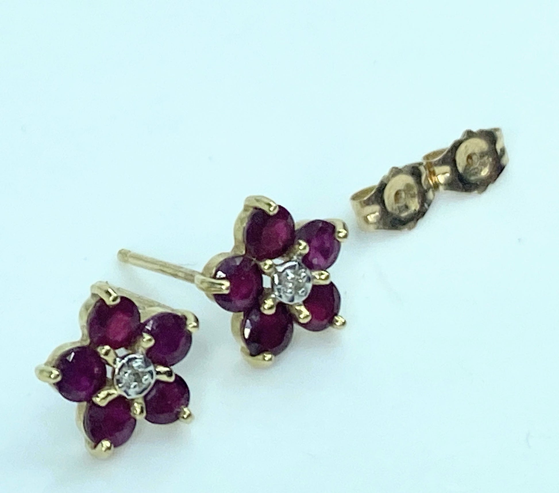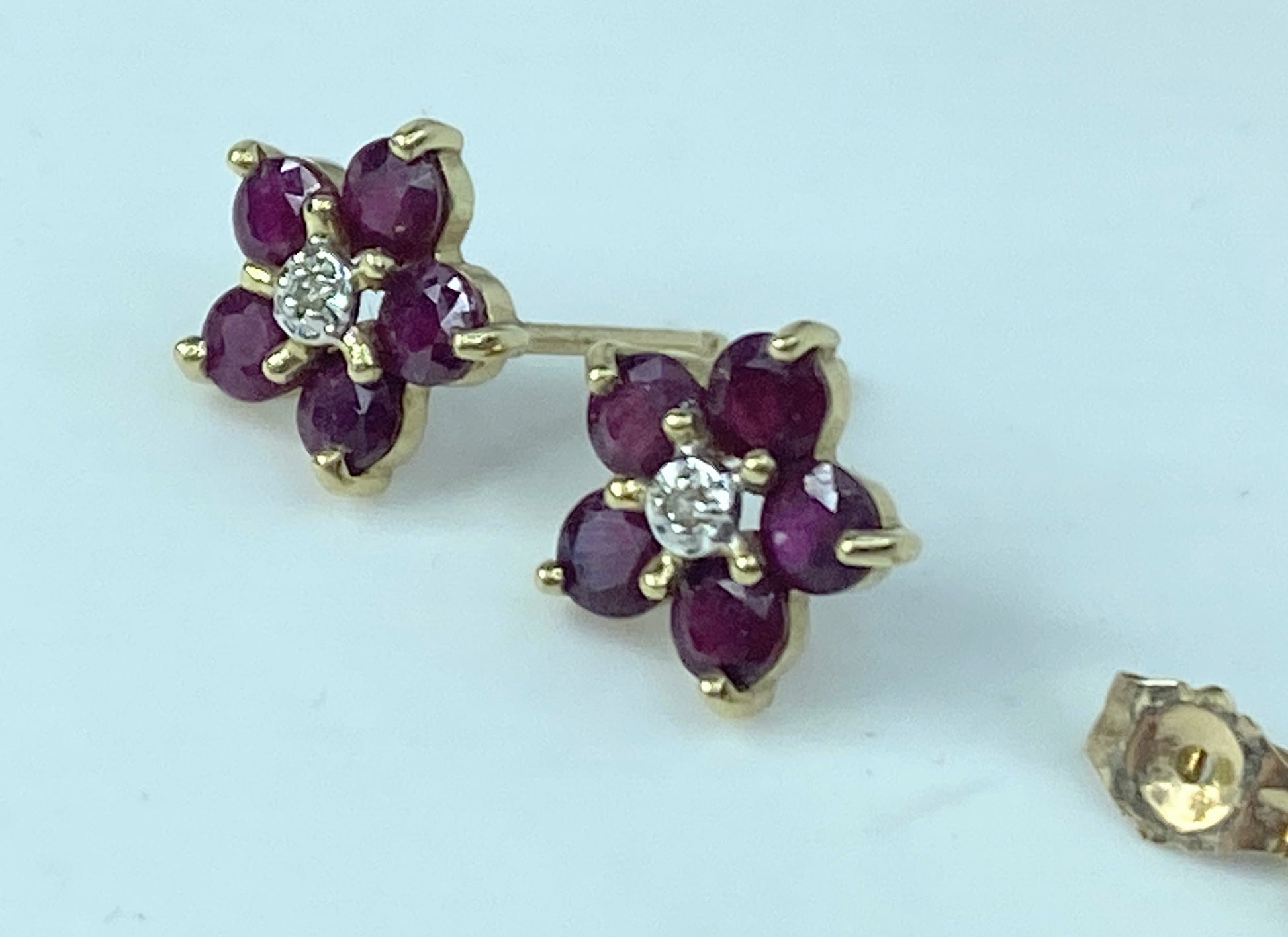 14K yellow gold 1.0ct natural Ruby Diamond Floral post earrings. It features five rubies, 3.0mm each, with a diamond in a flower design, with a total ruby weight of approximately [insert weight]. 1.0ct. The earring top is 10.0mm, and the earrings have a pair of matching post clutch ear nuts. Weight 1.6 grams, hallmark 14K
