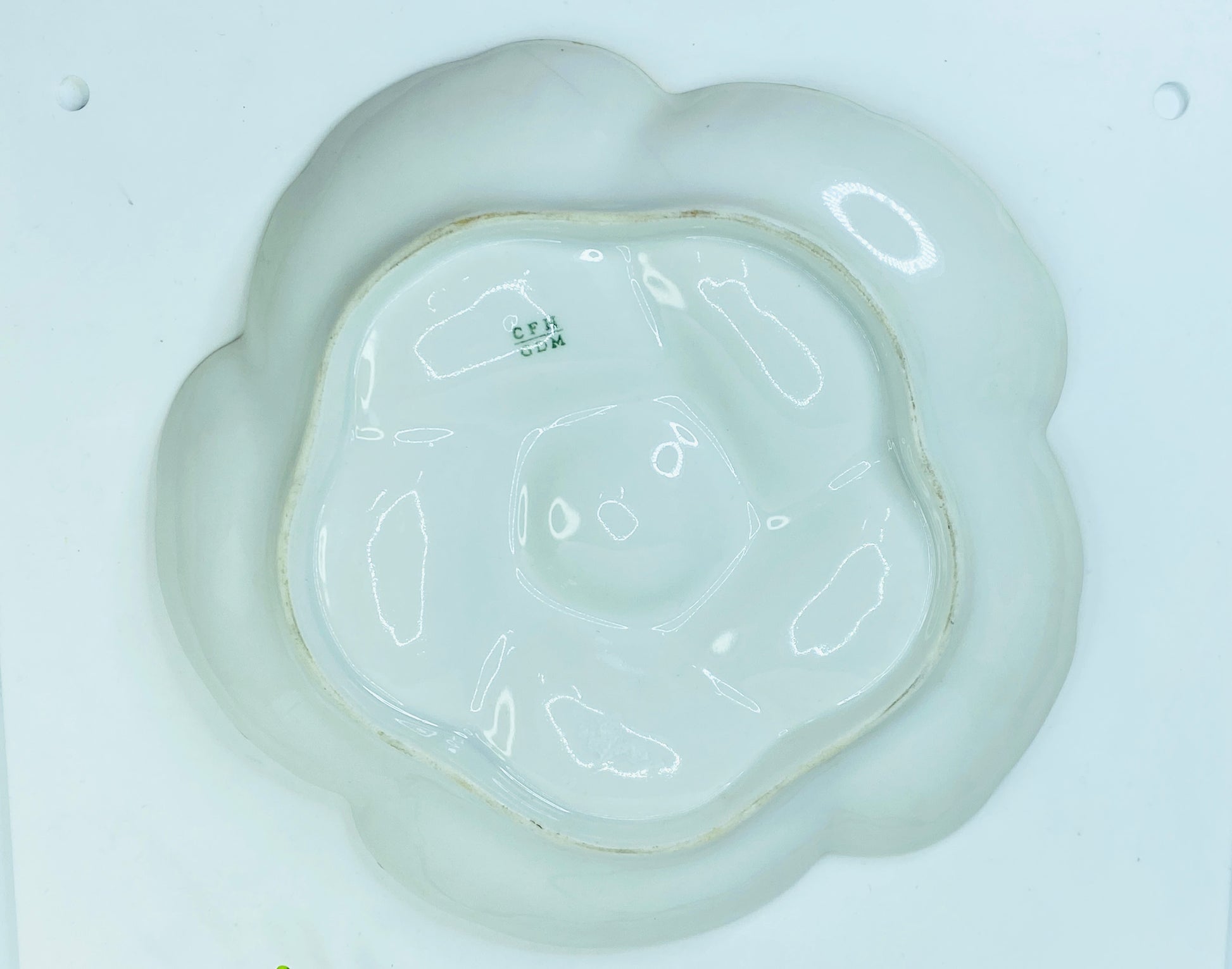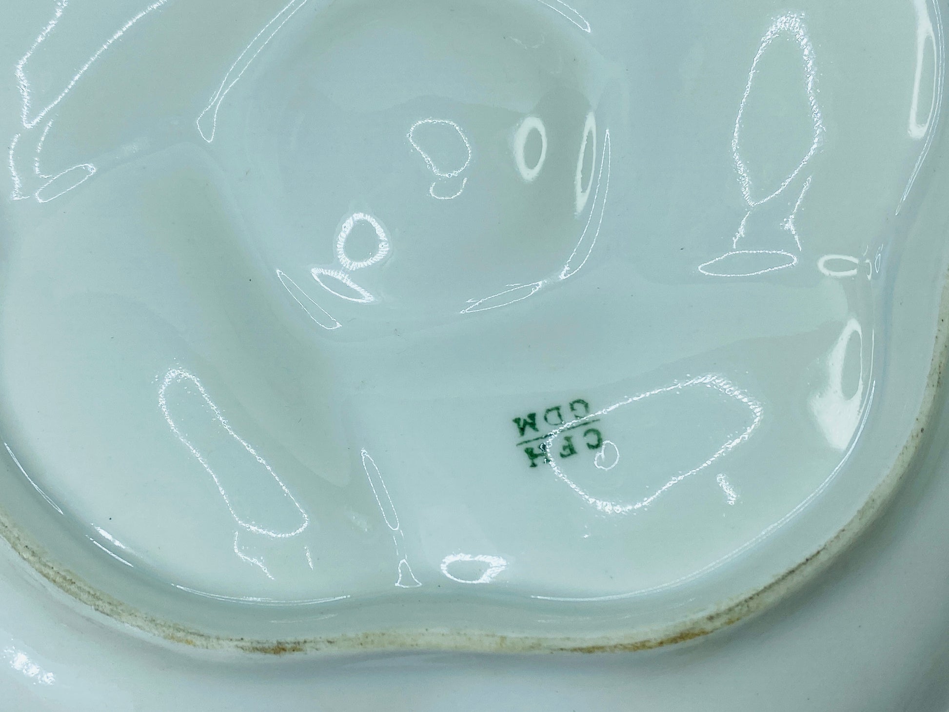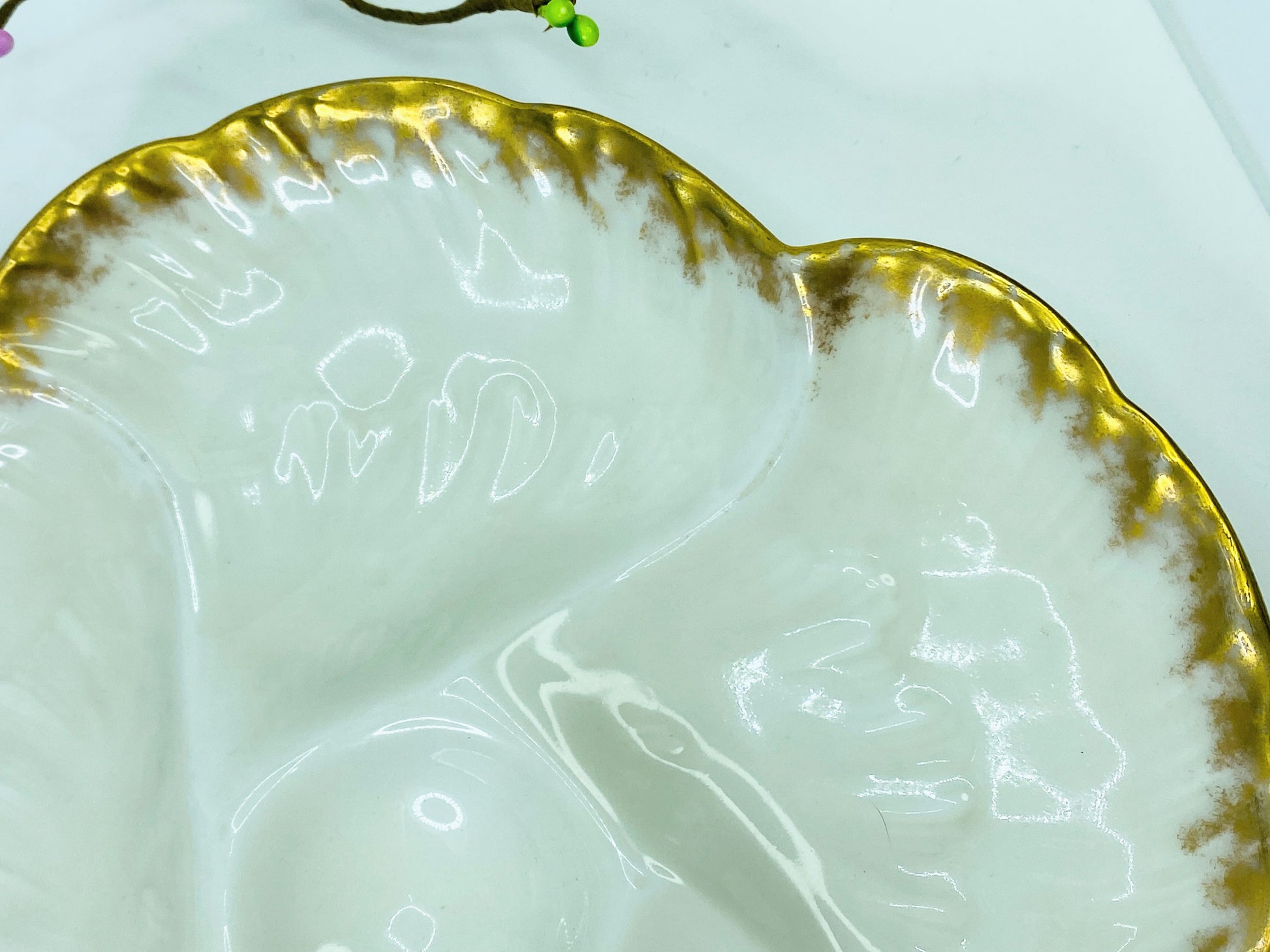 This antique porcelain oyster plate was made between approximately 1882 and 1890, based on the stamp mark. The mark "CFH/GDM" on the porcelain is Charles Field Haviland, Gerard, Dufraisseix & Morel, a company that produced Limoges porcelain in France. The plate has 5 well with sauce or citric in the center, gold trim with tassel. It measures 8 5/8" x 1.0", no chips, cracks, or repairs.