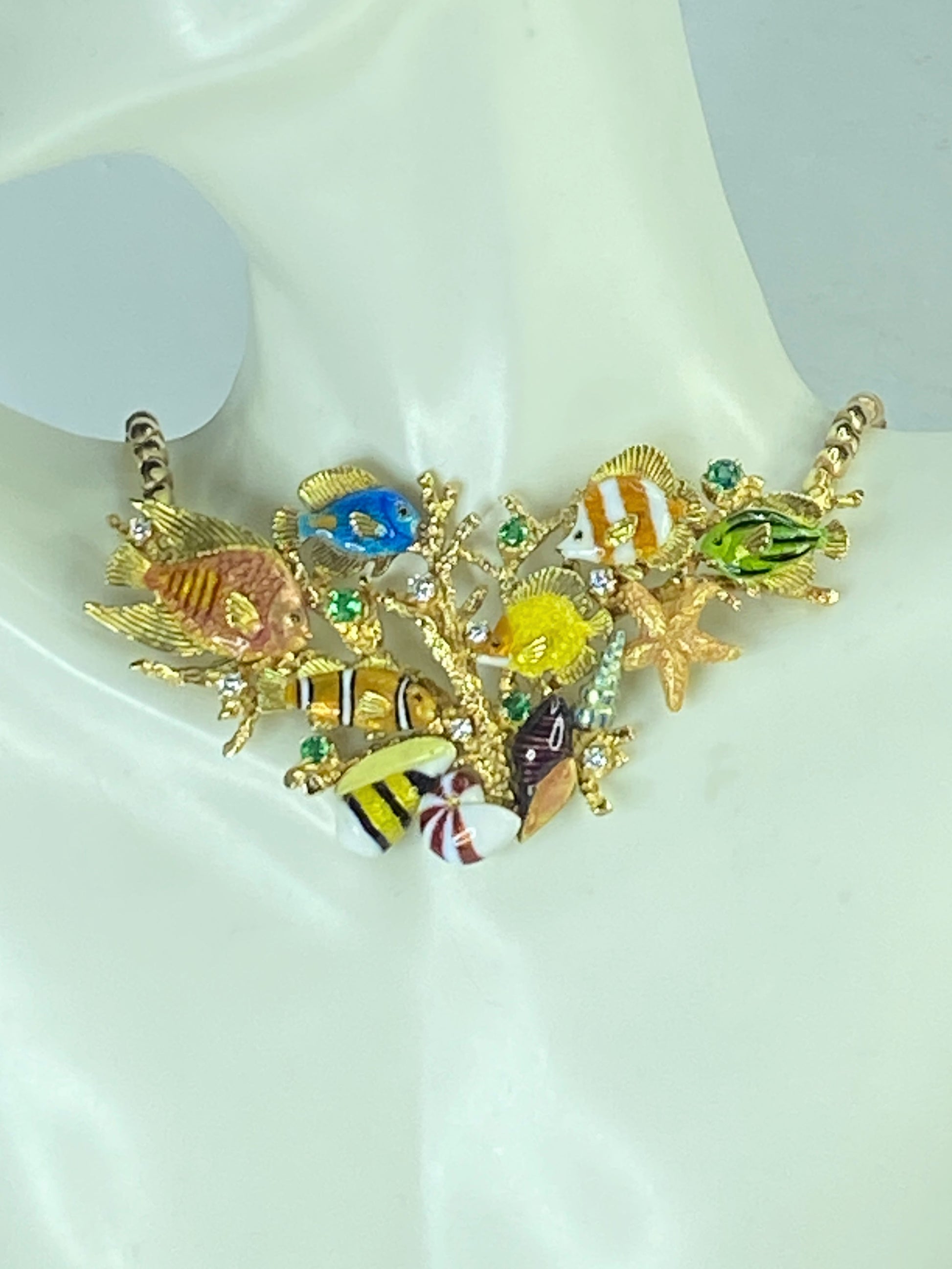 Colorful enamel fish swim around a variety of shells, alongside starfish and coral, in this most unusual 18-karat gold necklace by Kabali. It measures 7 inches from the clasp to the start of the fish medallion and return. Each element is a different color, among them, it is embellished with natural gemstones, they are verdant Emerald and Diamond, all in perfect condition, enamel. The chain is a chunky, floral-shaped bead link. The pictorial aspect of the necklace is three-dimensional.