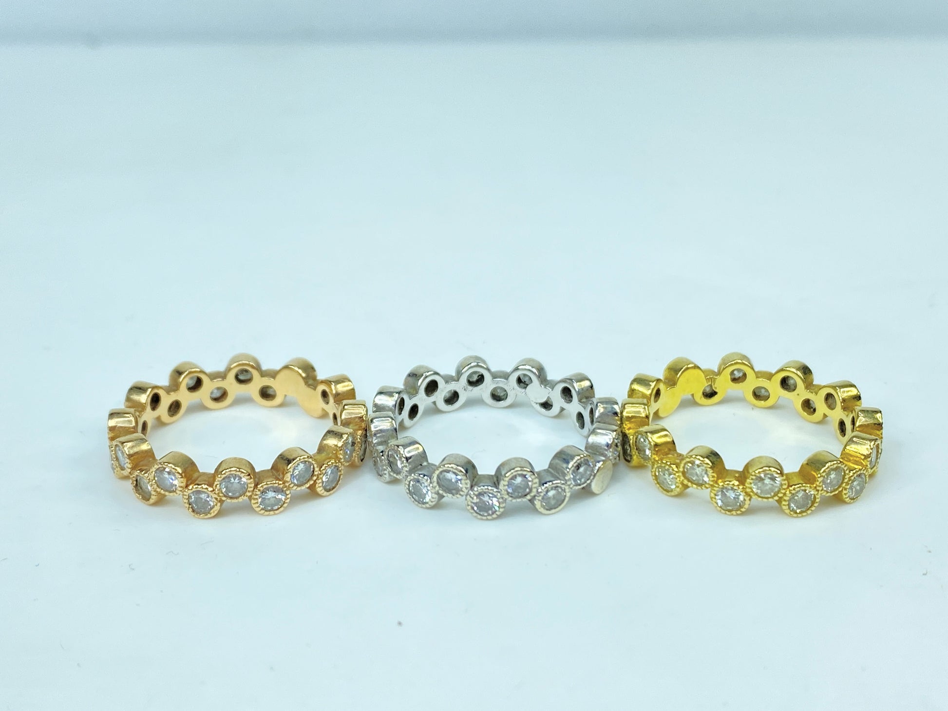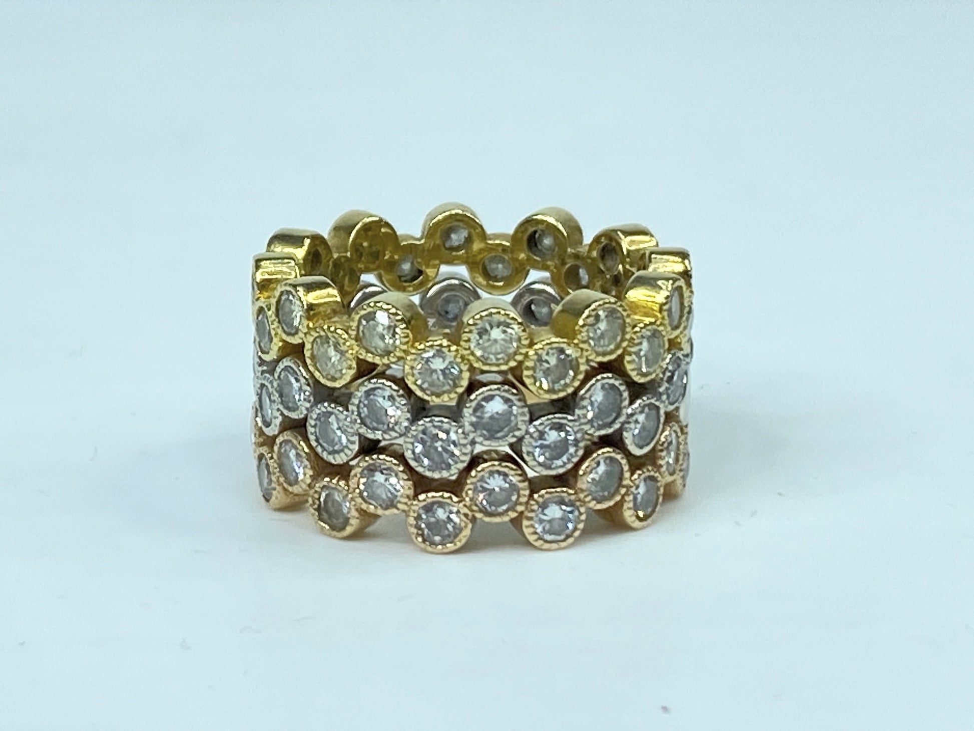 This is a lovely set of 18K tricolour stackable eternity bands. Each band bezel set twenty-three round brilliant diamonds, H/Si1-Si2, with migraine etching on each bezel. The ring band is available in yellow, rose, and white. The diamond approx. 2.0-2.12mm, combine approx. 2.07ct. The band is 4.8mm wide, size 6.5, and weighs 11.8 grams. No hallmark tested for 18K gold.