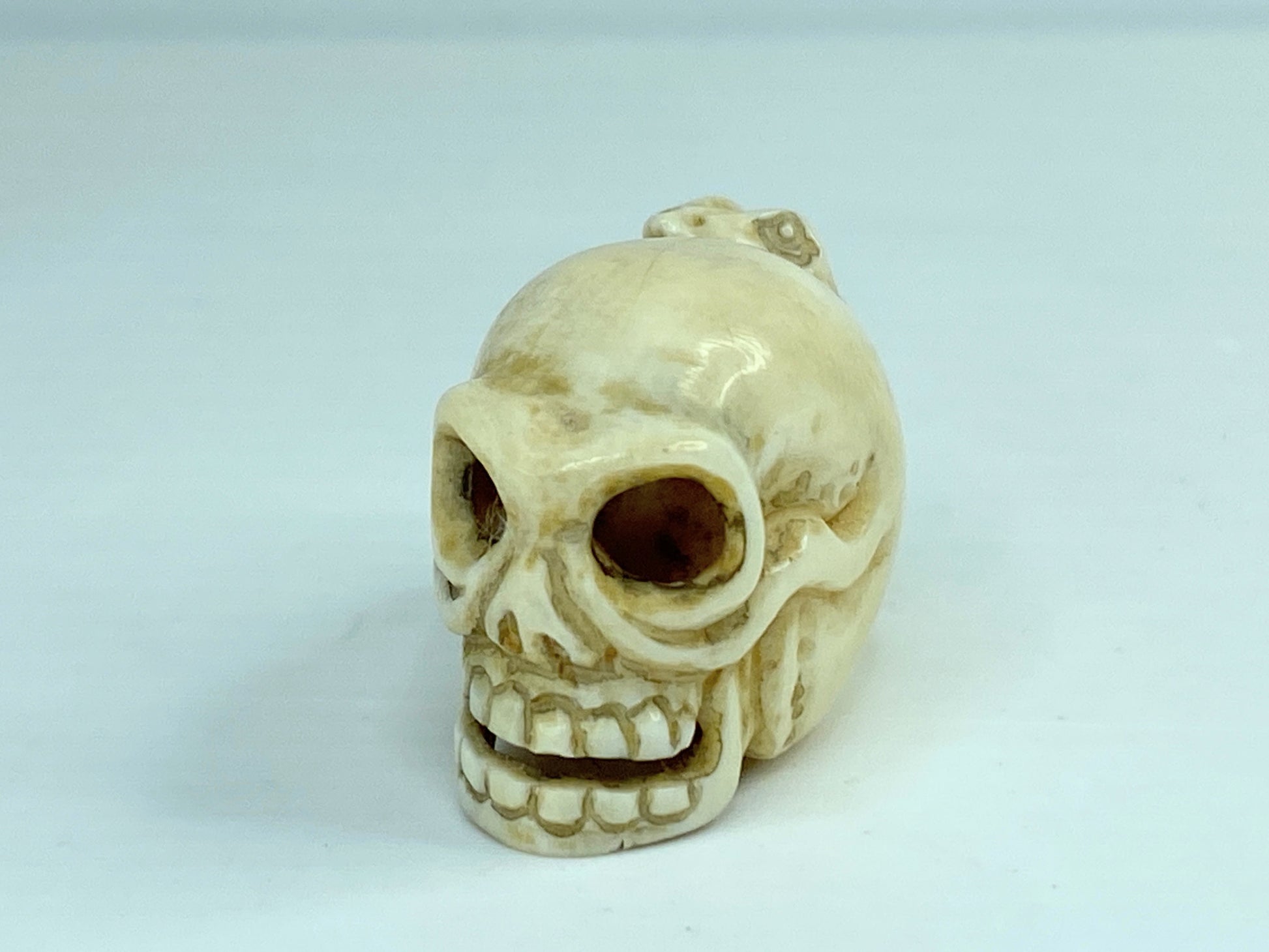 19th C Japanese carved Resin Netsuke Skull and frog Japanese carved resin netsuke, 19th C., of a human skull with a perched rat. Signature on the base of the skull.