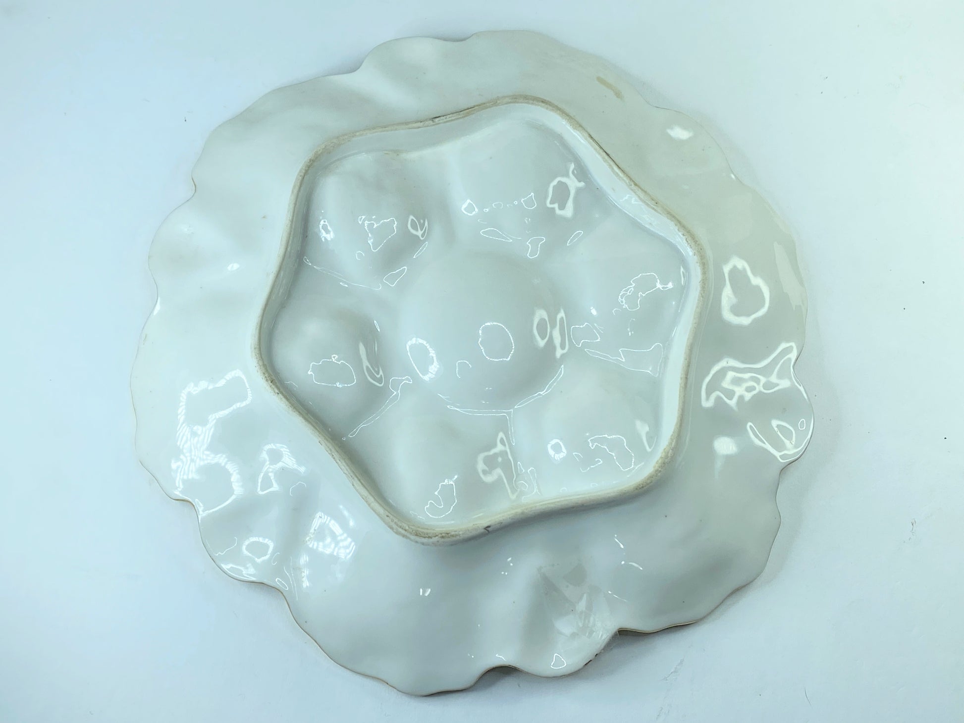 19th-century gold monogram & gild leaf-like deco LP 6 well oyster plates, made in France. It features six wells, with a center well for lemon, clam, and shell embossing on the side and edge, gold trim, and some gold lost due to age. We have 2 in stock, This one is damaged, which we will sell at half price (see the last two photos). 9.5" wide.