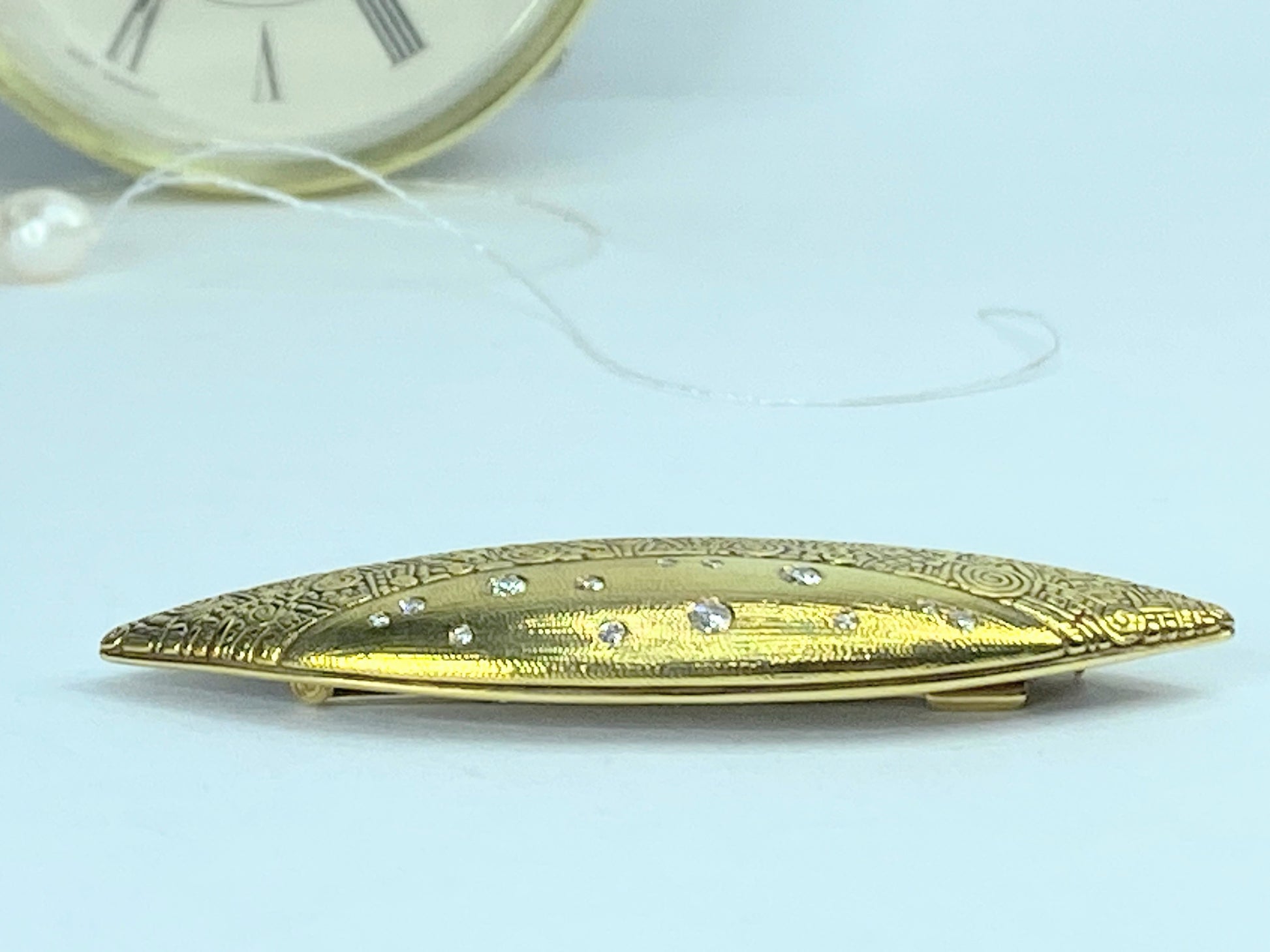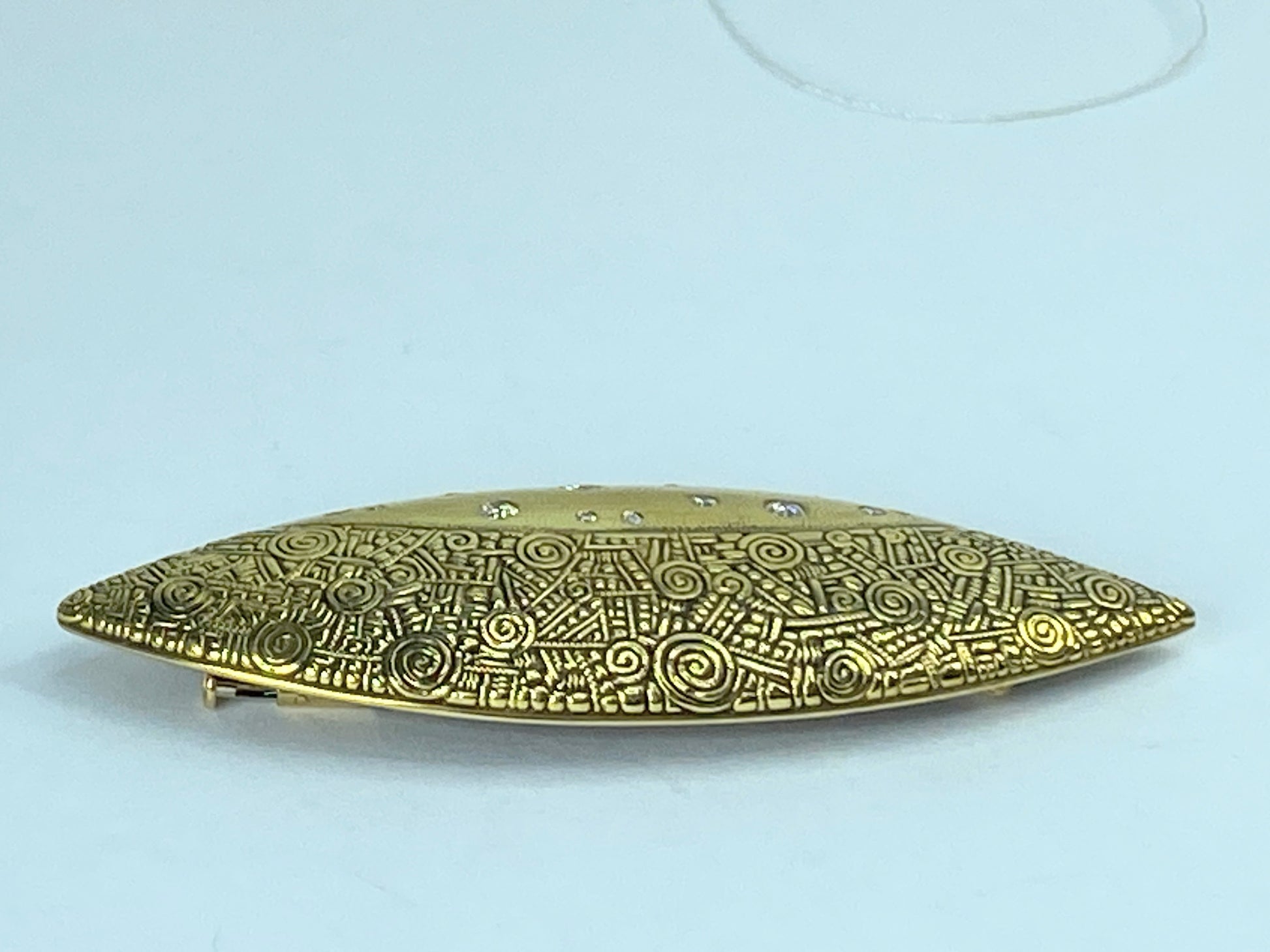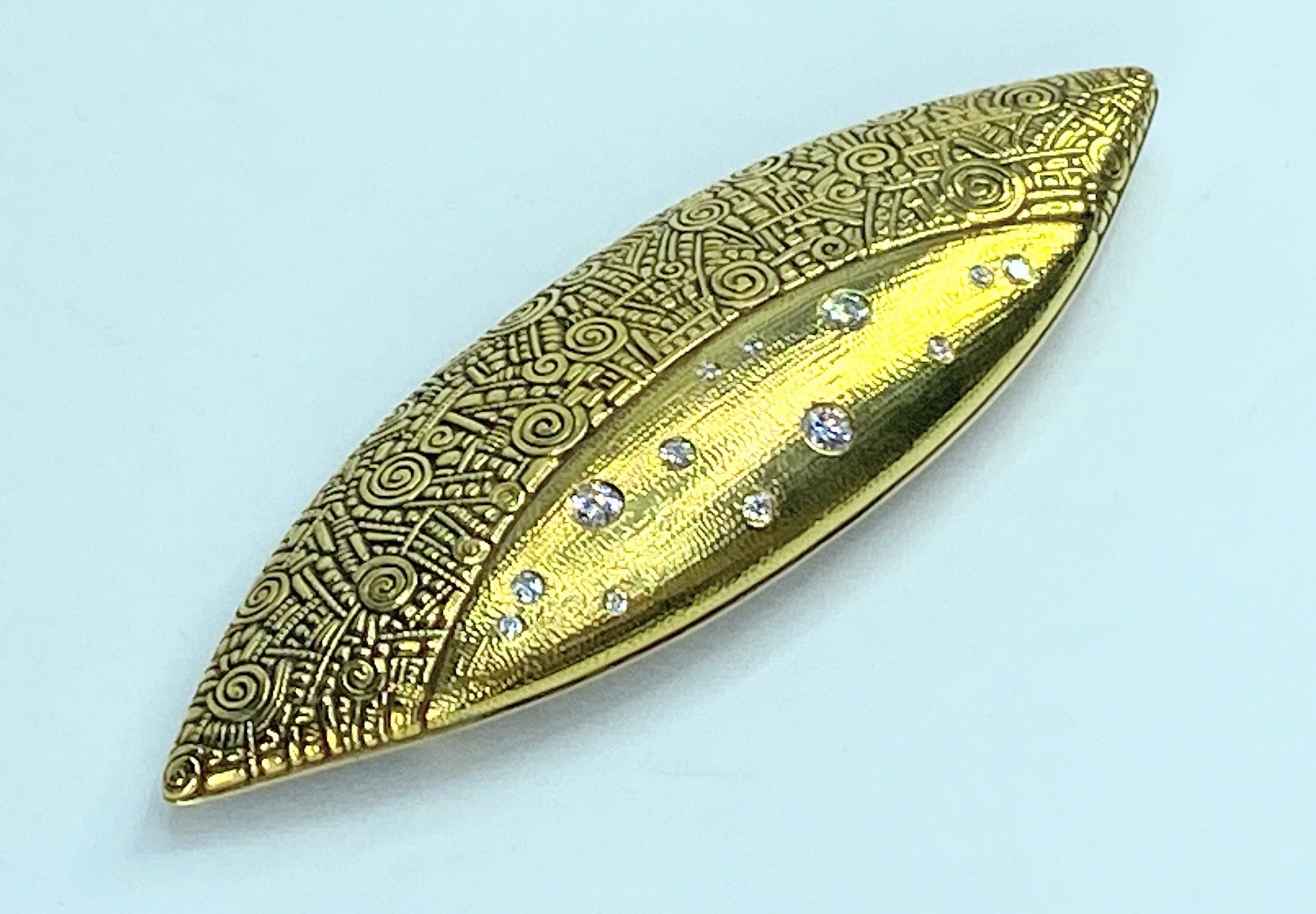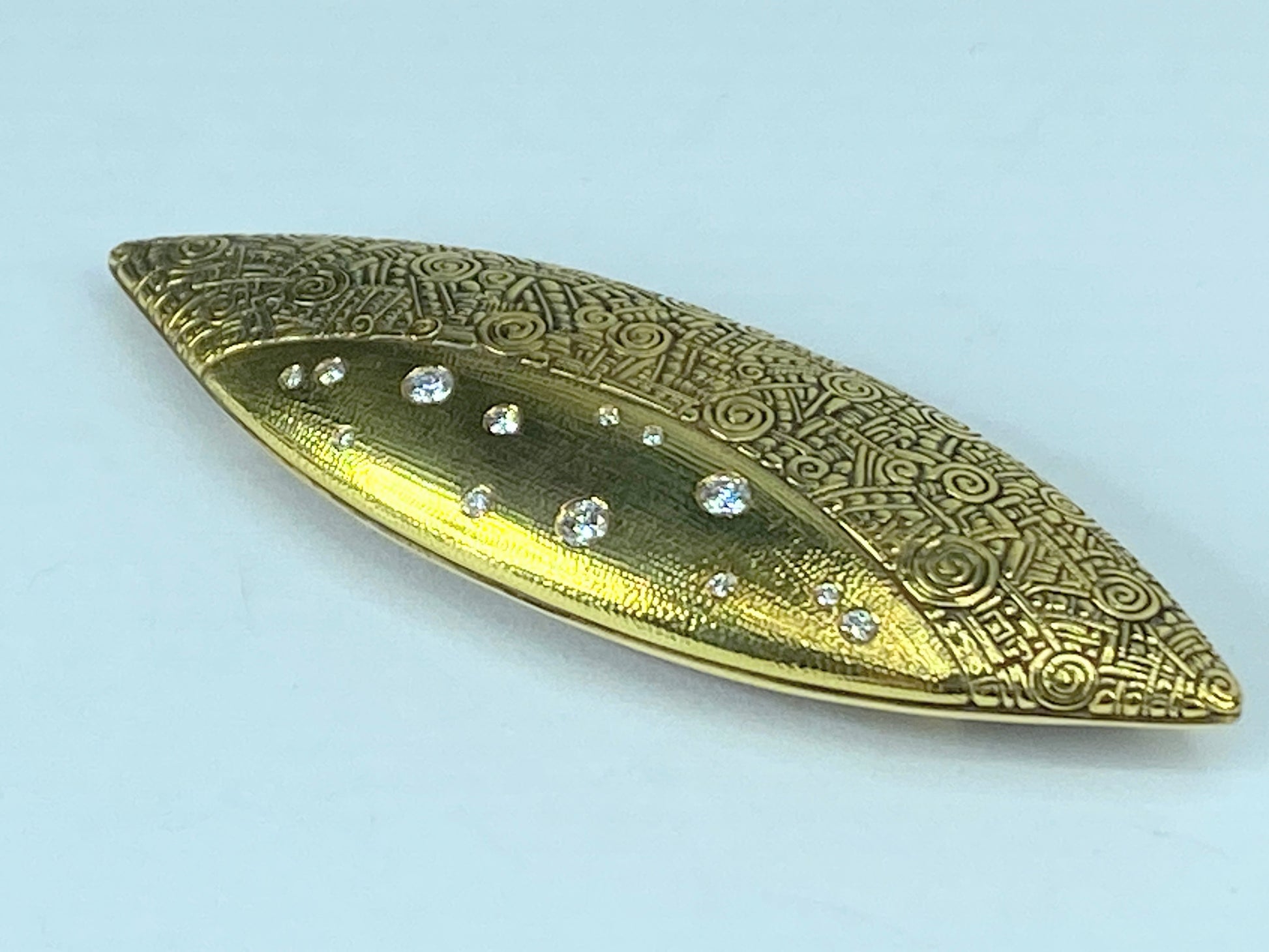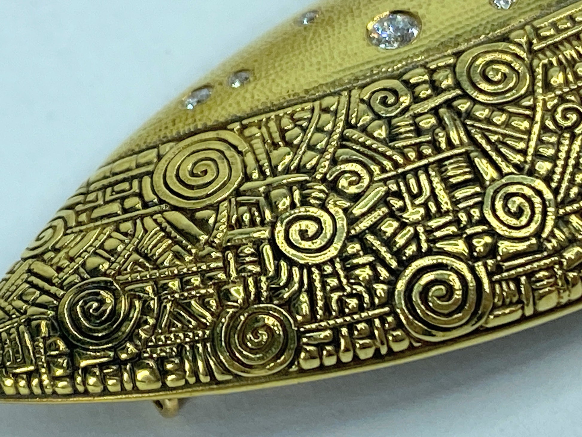 The Shield Brooch is a striking expression of Alex Sepkus’s trademark artistry: microscopic detailing, intricate texture, and a whimsical yet timeless design. This piece showcases a shield motif rendered in precious metal with 13 flush-set round diamonds that float within the engine-turned surface, creating a refined balance between sparkle and texture. The result is a statement accessory that reads as both jewelry and sculpture.