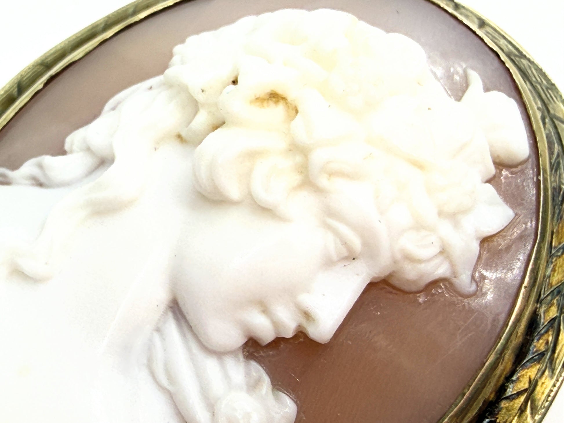 A finely hand-carved shell cameo depicting a classical female profile with elaborate flowing hair and delicate facial detail, set within a 14K gold engraved oval frame. The relief carving is crisp and dimensional, resting against its natural warm shell ground. The back reveals a traditional open mount with early hinge and clasp construction, consistent with 19th century workmanship. Tested for 14K gold. A timeless heirloom example of Victorian cameo artistry.