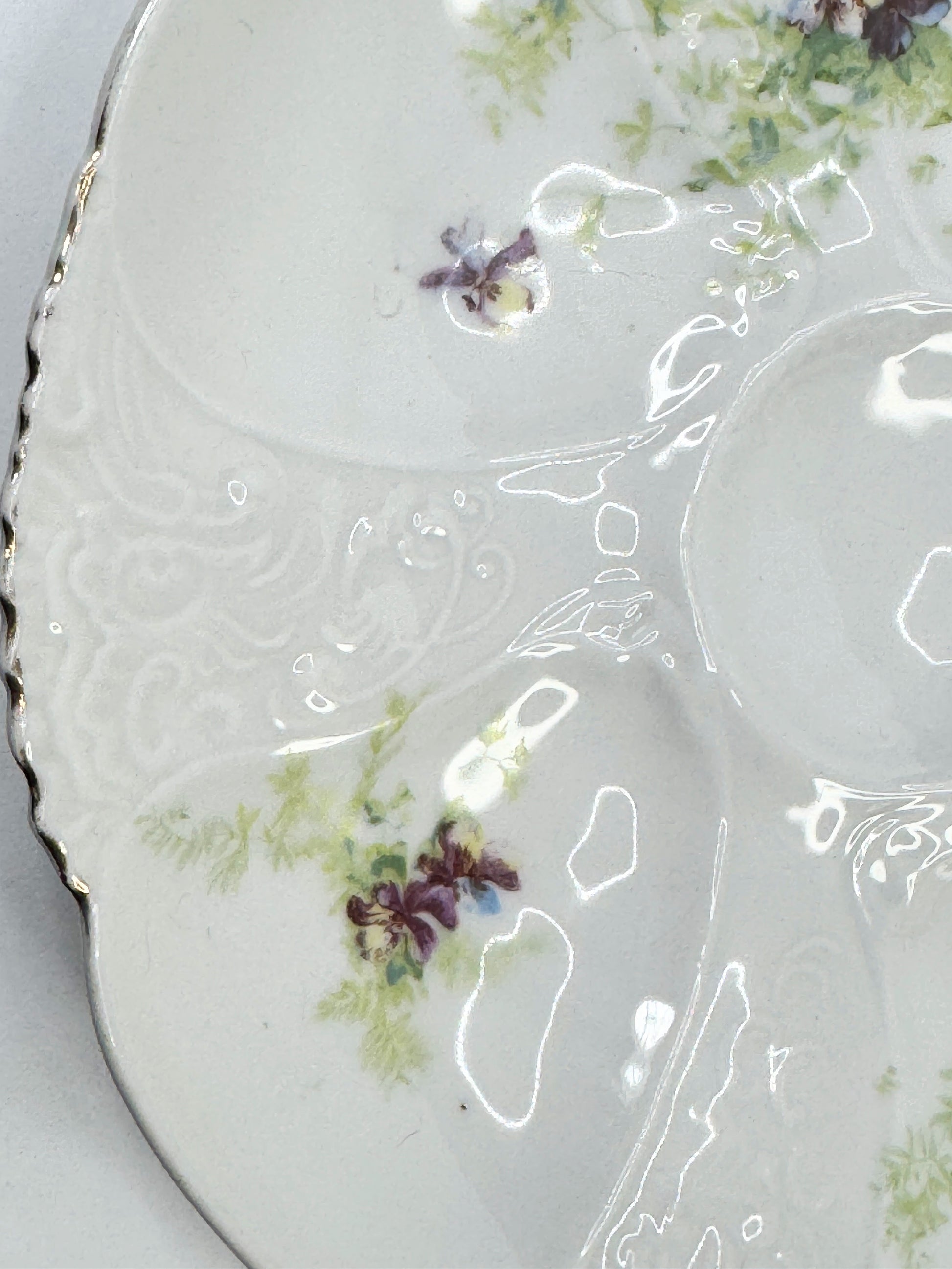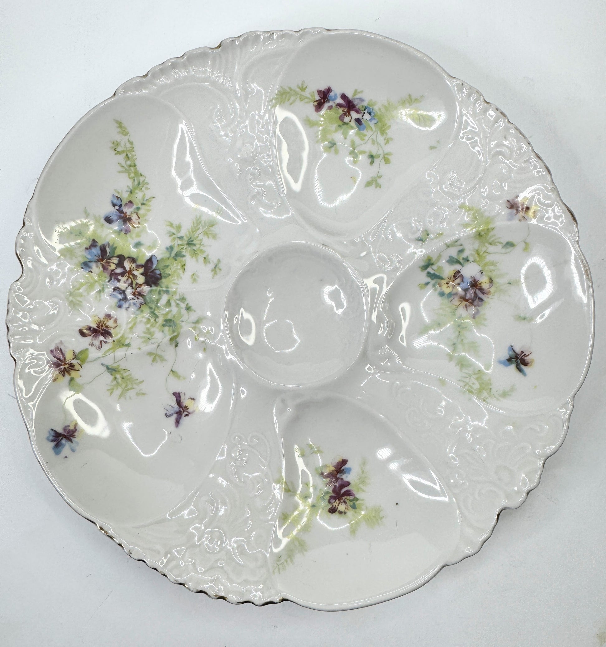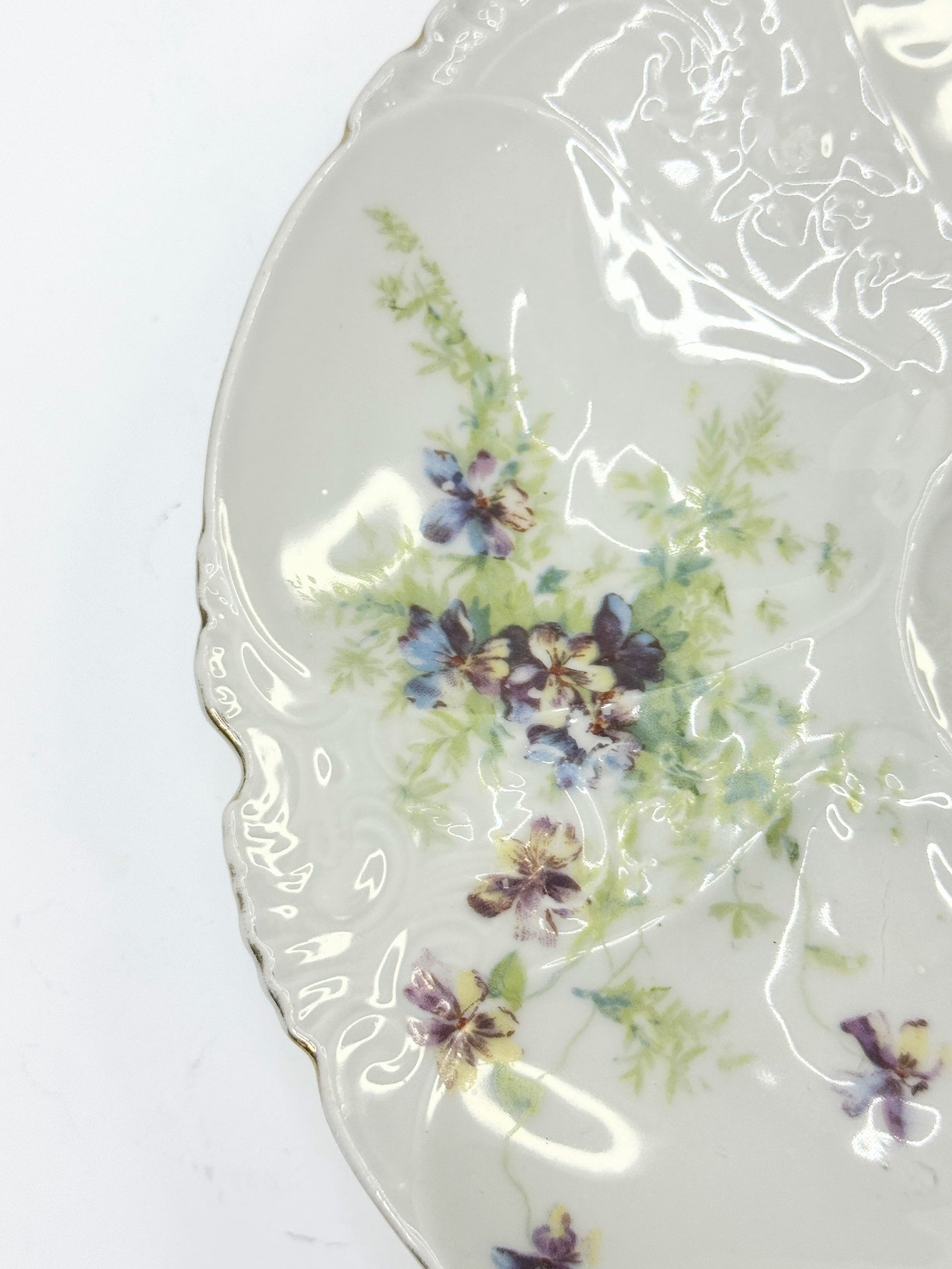 Features: The plate has five raised oyster wells and a center well. It is decorated with floral designs.
