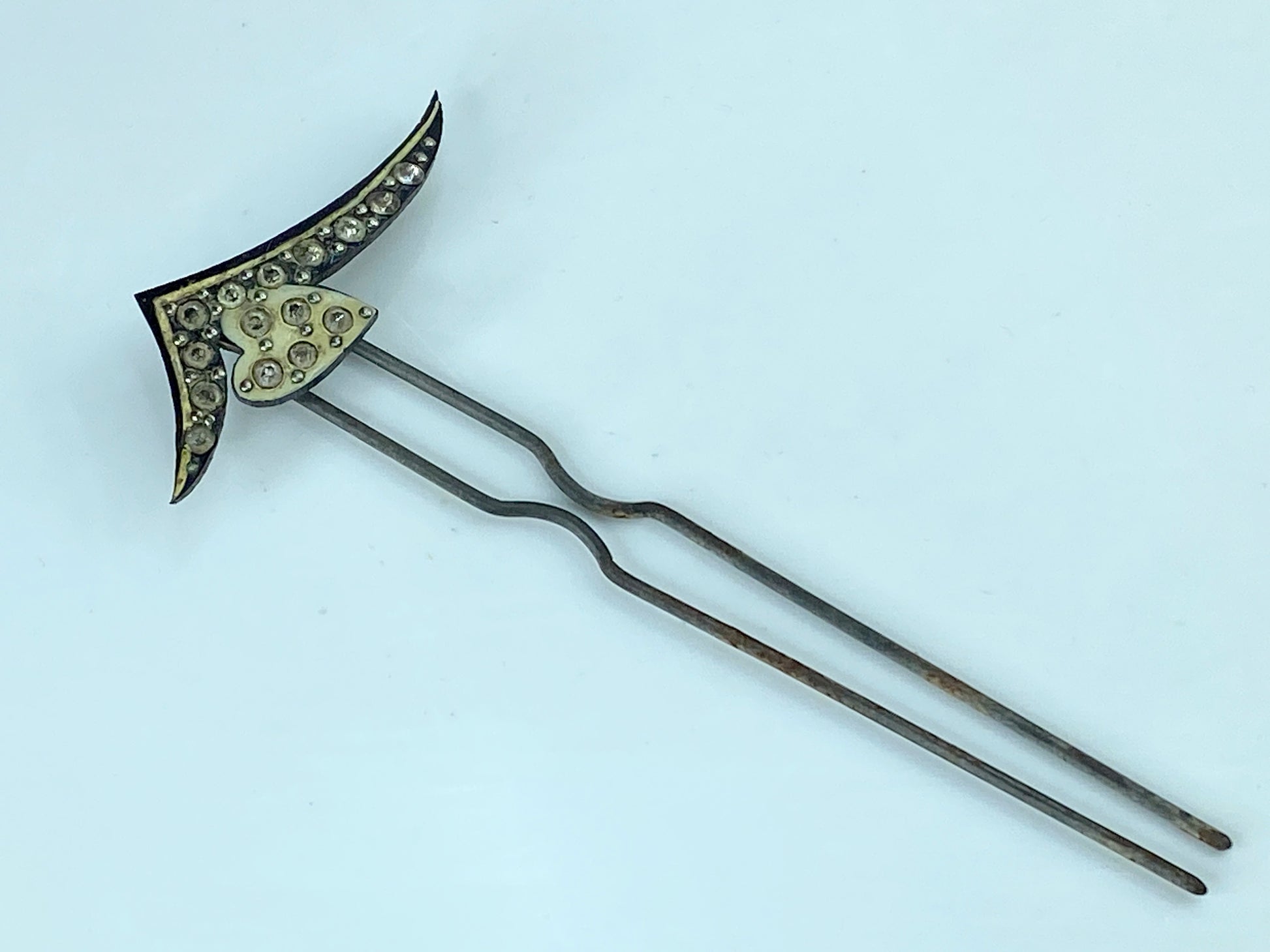 Antique hair comb with an exquisite floral design. This hairpin, dating to the late 19th century, is designed in metal. This piece flares out at the top, in a scrolling design, to match the floral pattern etched into it. The design heart under an umbrella, both embellished with rhinestones, has a black enamel background. This lovely piece would be great to accent an up-do. Circa 1870s - 1890s. Weight 4.6 grams, 2.0" x 4 1/4"