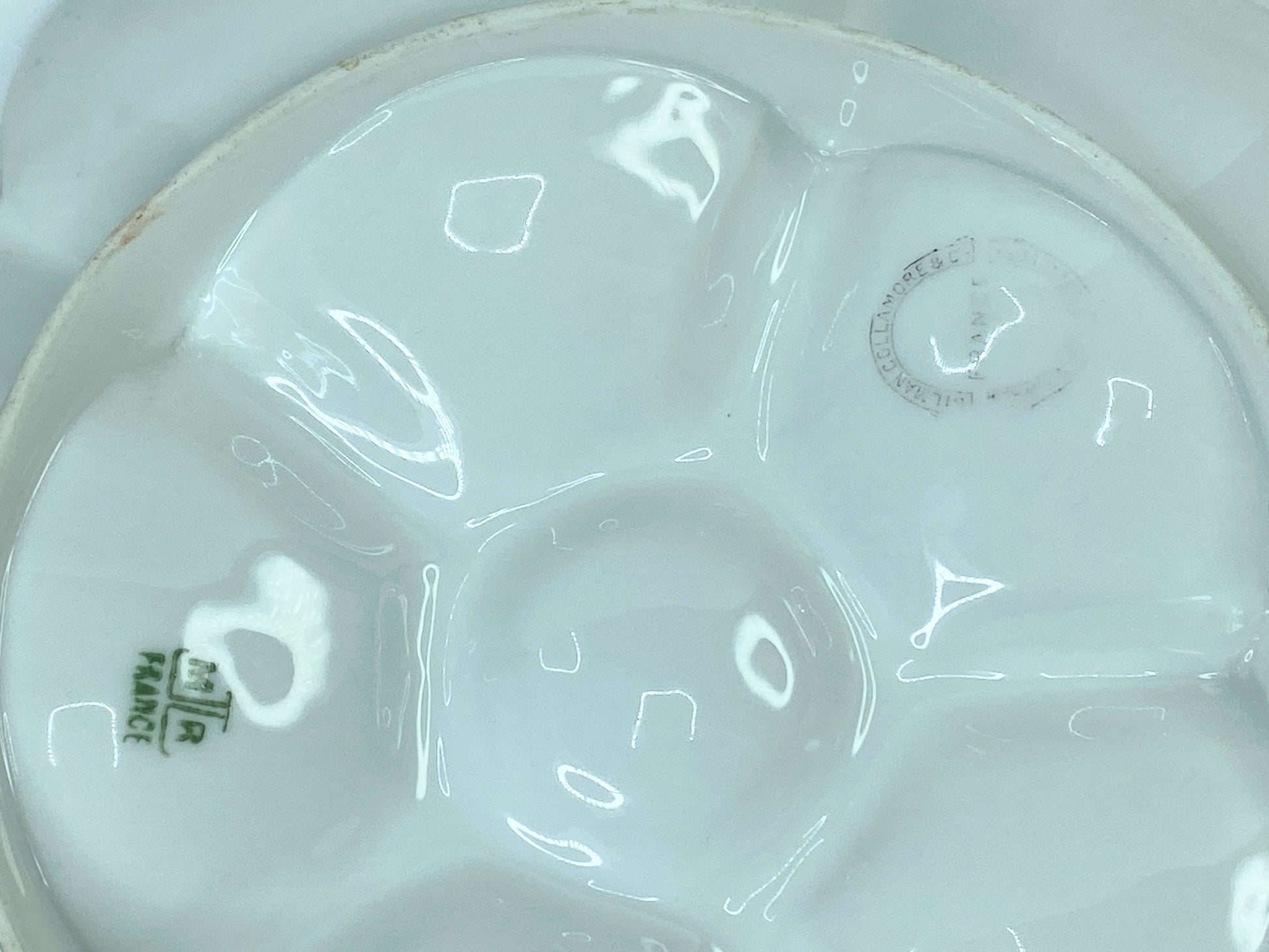 Antique French hand-painted Limoges porcelain oyster plate made by "M. Redon," for "Gilman Collamore & Co.," of 5th Avenue, New York, circa 1870-1880. Features a scalloped 5-section plate with a central well for dipping. Embellished with gold accents against a crisp white ground. Measures 8". Signed ~ stamped with the MR France mark and bears the retailer's name in red ink, below.