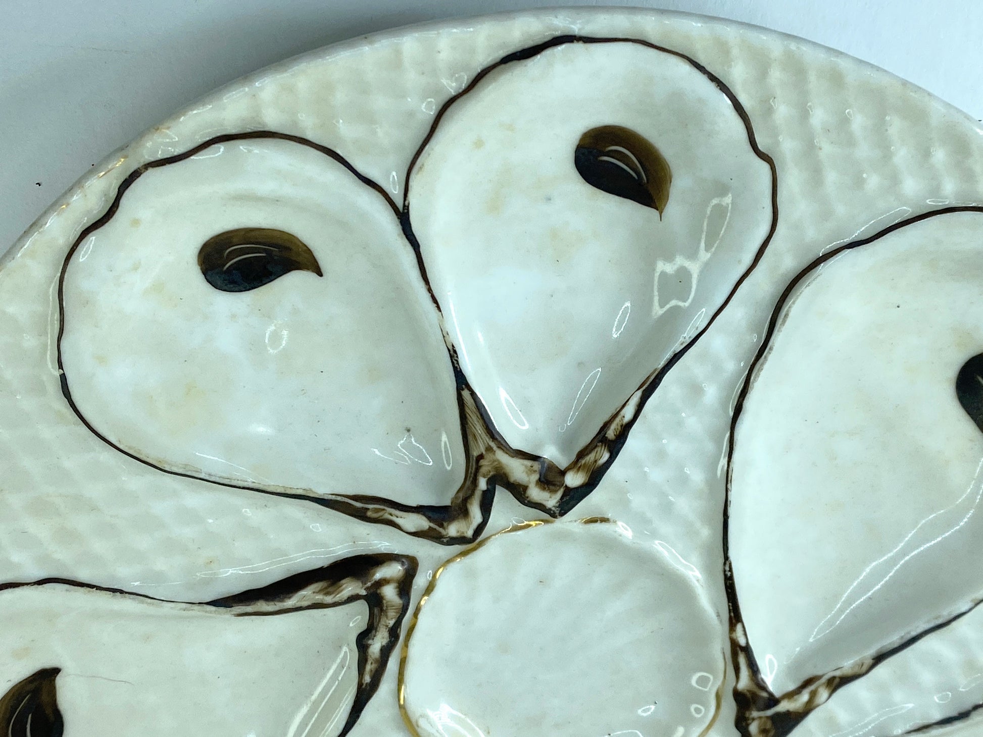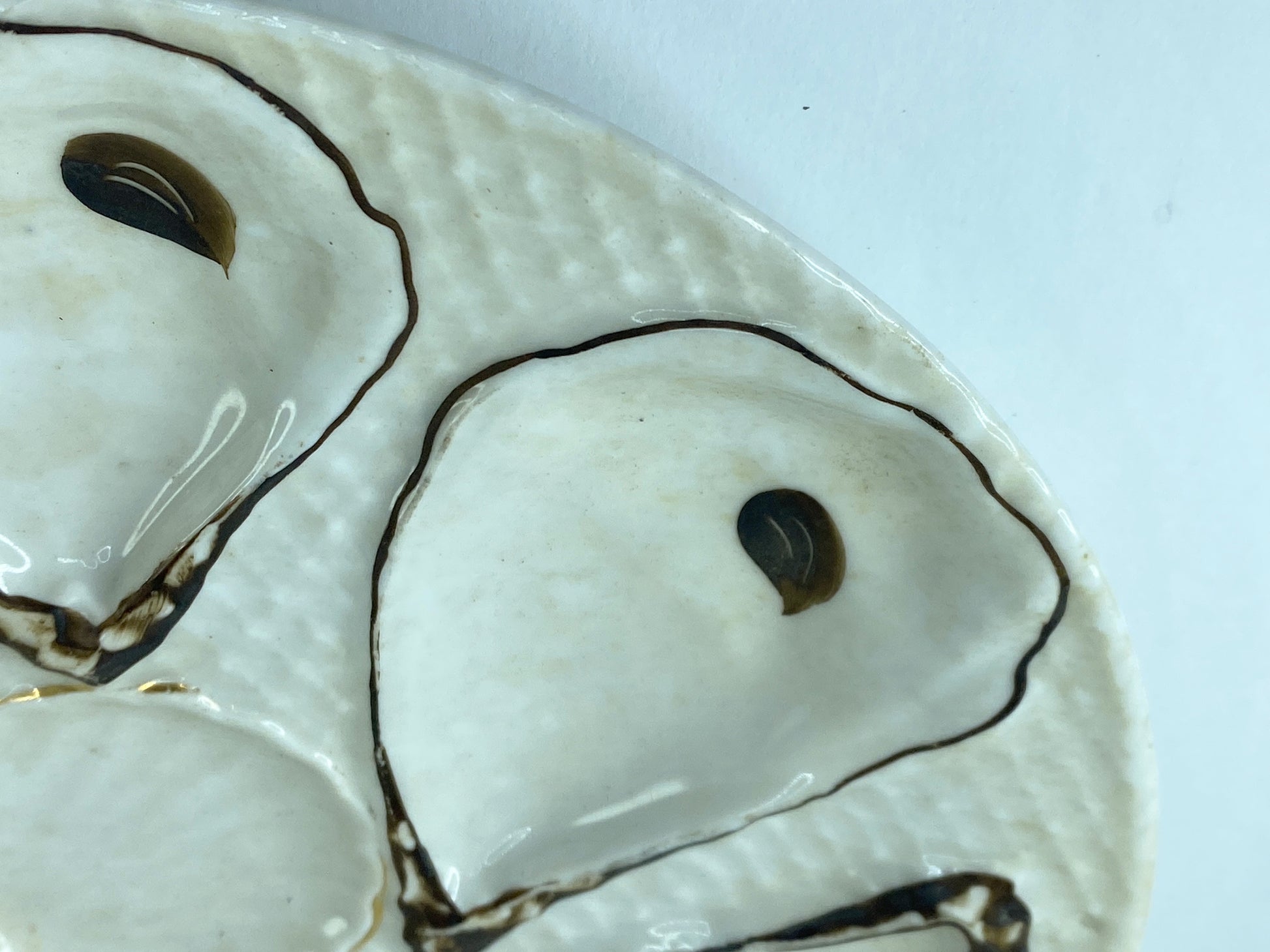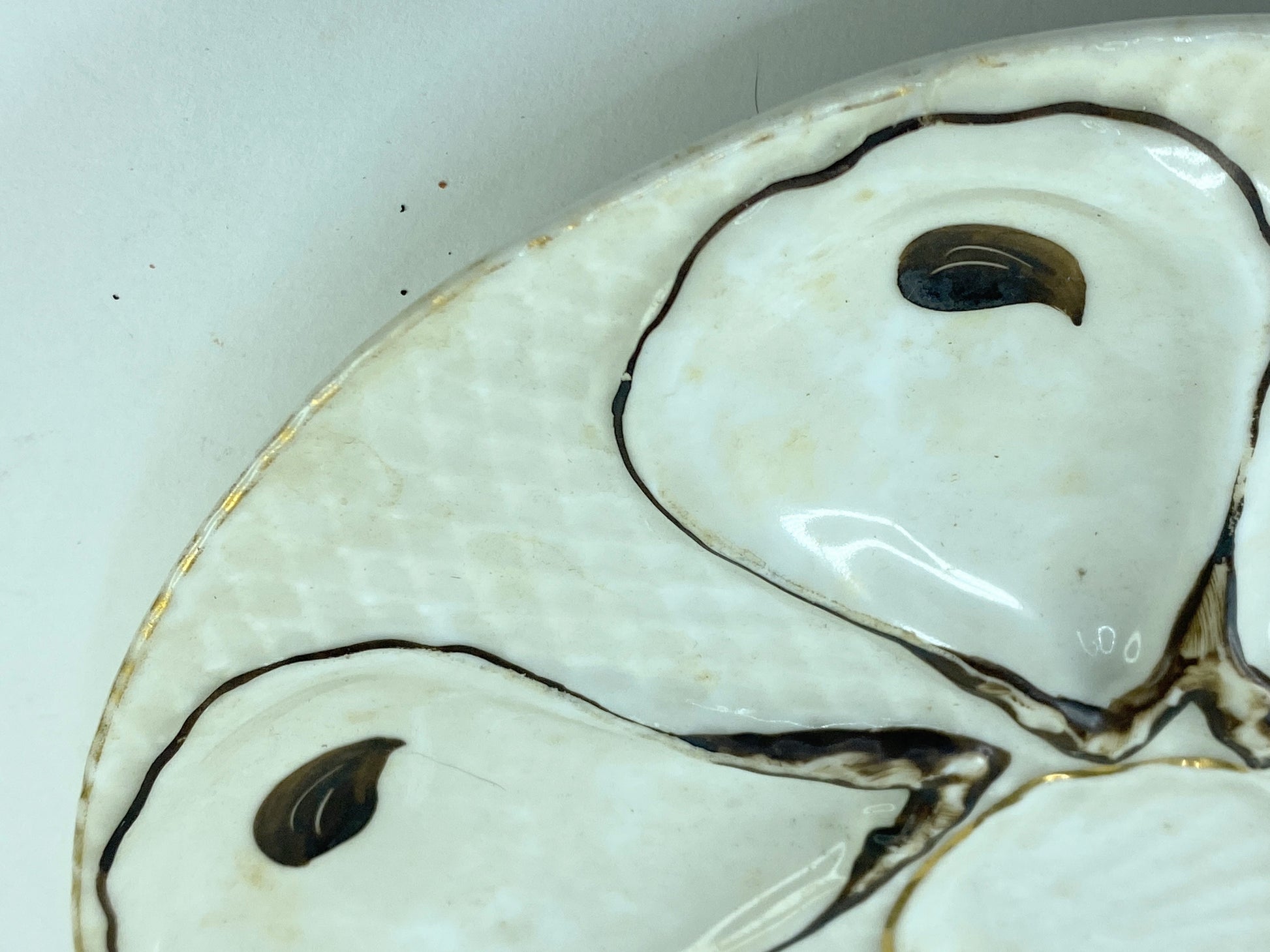 Offered here is a "Napkin", 6 6-well oyster plate. It is an example of what is known as Trompe L’oeil, which is a French term meaning to "fool the eye" or create an illusion. In this case, six empty oyster shells appear to be lying on a cloth napkin, and two of the shells appear to be partially covered by the napkin. The brown comma shapes are thought to have been the attachment point of the oyster to the shell. Gold gilt on the rim, part of the gold lost. The translucent, porcelain plate is pale blue-gray, 8.5" in diameter, and in excellent condition with no cracks, chips, crazing, or repairs. Please enlarge and review the photos as they are part of the description. There is no maker's mark on the plate, only the number 0292. We have seen this plate described as being French or German, but without any conclusive evidence of its origin or production.