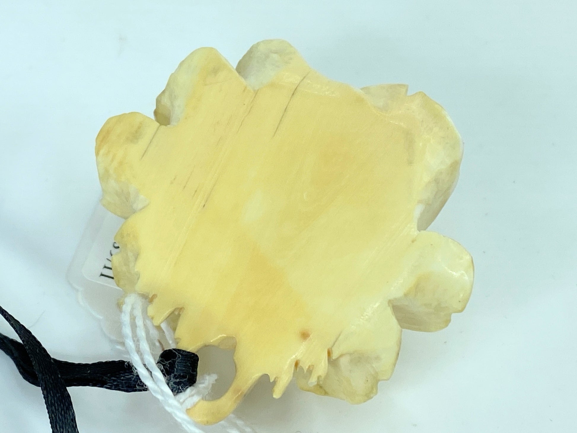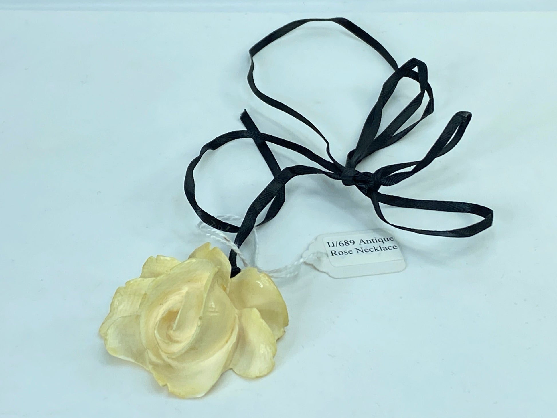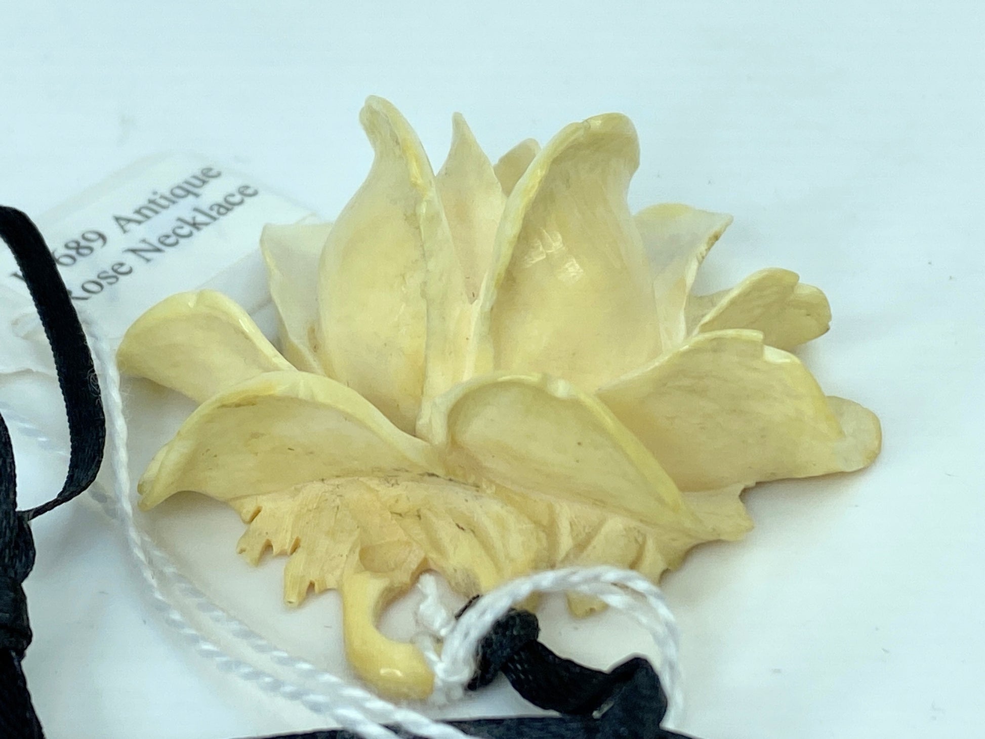 Beautiful, deep-carved resin/bone large Rose head pendant, 55.0 x 50.0 x 23.3mm in size, it suspends in a black silk ribbon. Weight 14.4 grams, no damage, and in excellent condition.