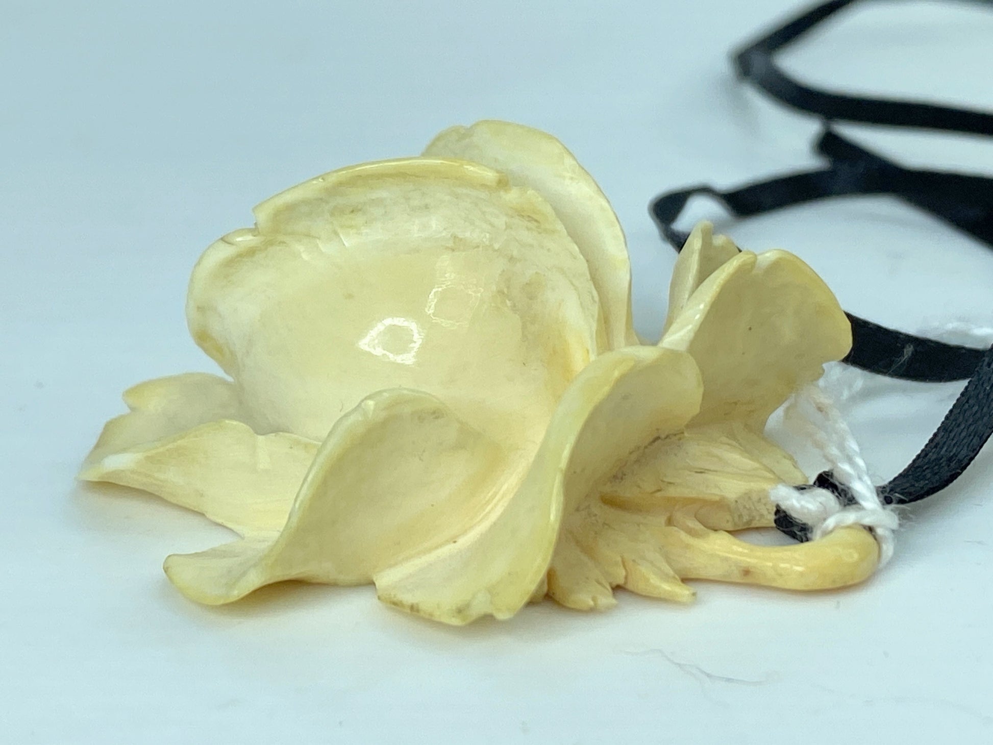 Art Deco carved large Resin/Bone 3D Rose pendant on silk black ribbon 15g GS648