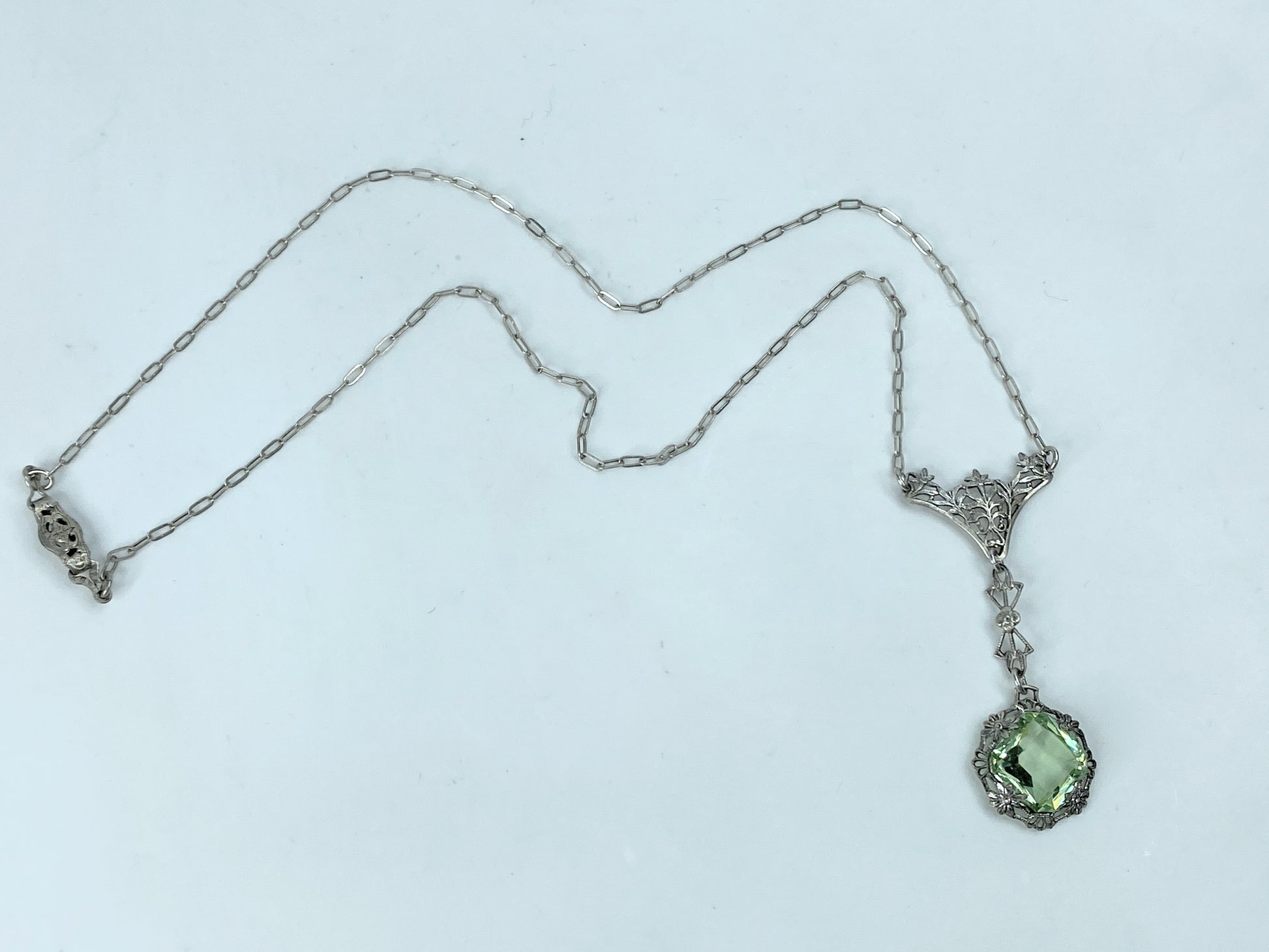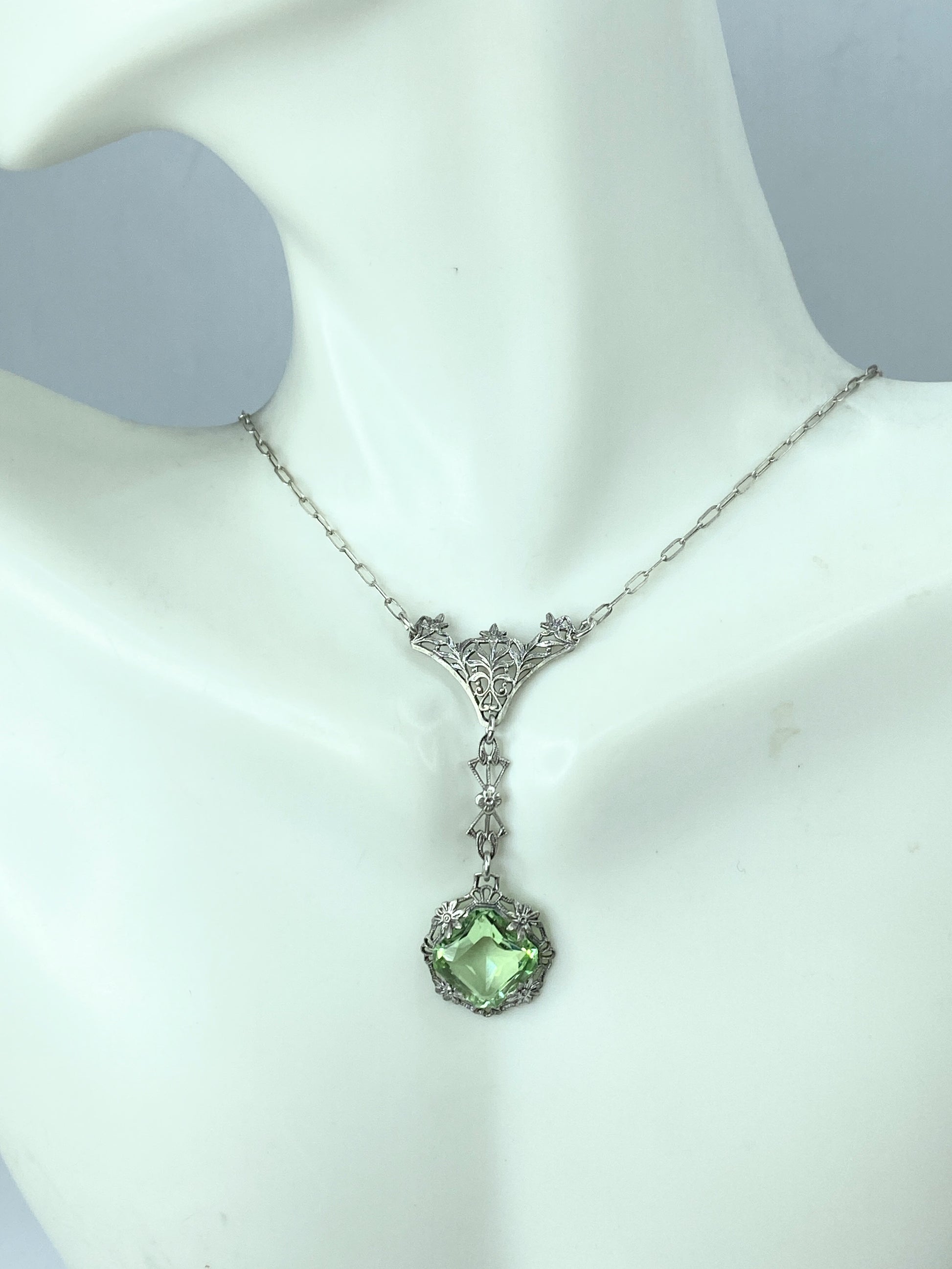 Ary Deco-inspired necklace featuring a vivid green faceted camphor glass pendant centered in an intricate filigree setting. A crystal stone accents the centerpiece, with fine etching and delicate cutouts that enhance the vintage-inspired elegance. The pendant hangs from a 15-inch cable link chain and closes securely with a classic push slide clasp, delivering a comfortable fit and a clean, timeless silhouette. This piece pairs beautifully with both vintage-inspired outfits and modern outfits looking for a touch of period glamour.