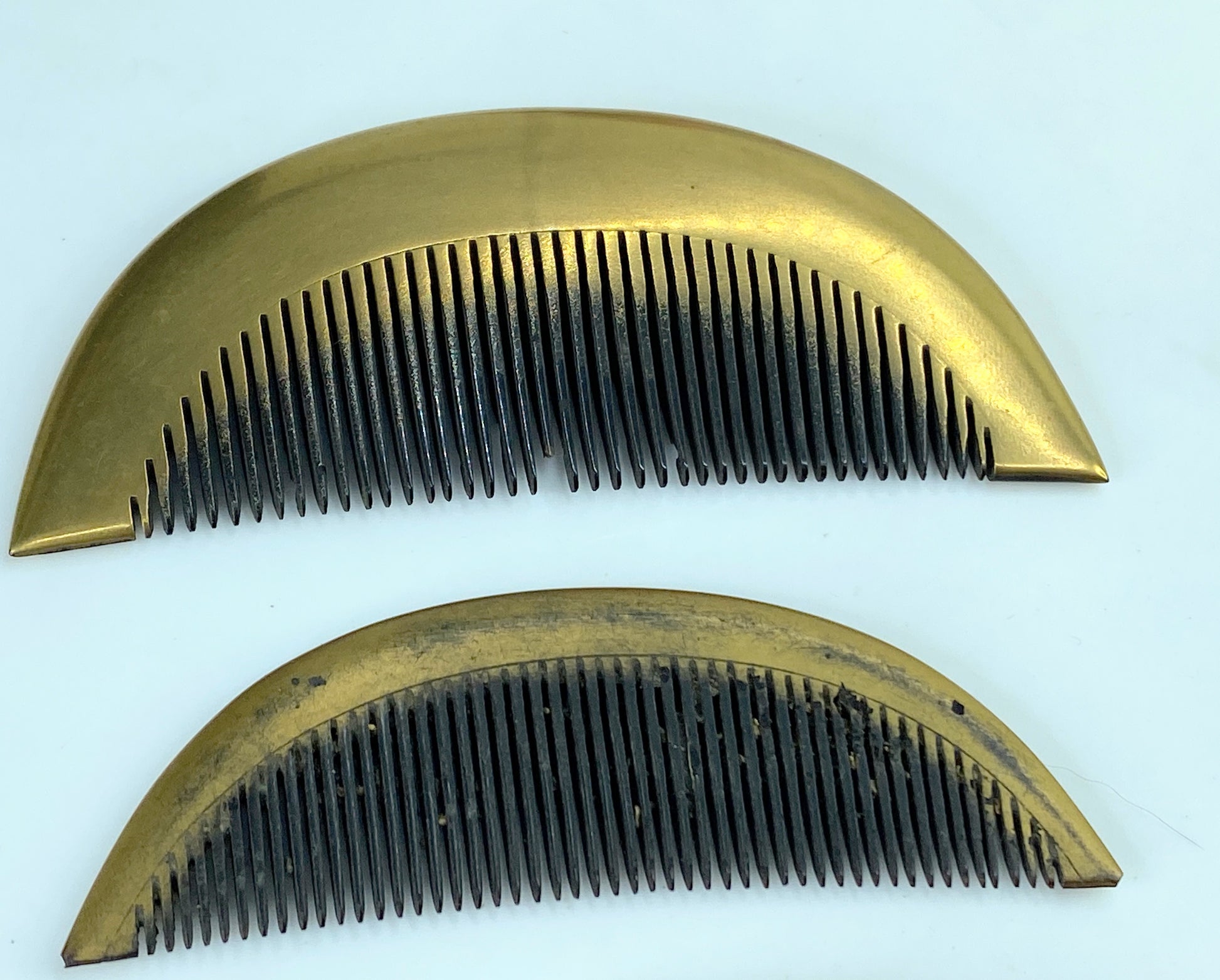 This special comb is made of genuine bekko covered with gold makie lacquer (raised gold). Set of three, fair condition. Two with half-circle and one with an arch shape. The sizes are 3 1/4" x 1 1/8", 2 3/4" x 1 1/8", and 3 1/4" x 1 1/2.