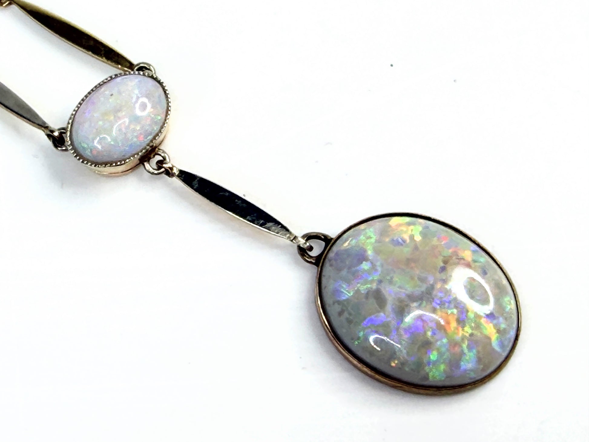 An early 20th-century Art Deco necklace set with two natural oval opals exhibiting strong spectral play-of-color across the surface. The principal stone measures 15.7 x 12 mm, joined by a secondary 8.8 x 7 mm opal above, both mounted in platinum bezels with fine milgrain edges. The articulated connectors emphasize the geometric restraint typical of the period. The chain is marked 15K, providing structural warmth against the platinum mountings. The overall drop measures 1 9/16", allowing fluid movement while maintaining delicate scale. A sophisticated example of transitional craftsmanship between Victorian romanticism and emerging Deco modernity.