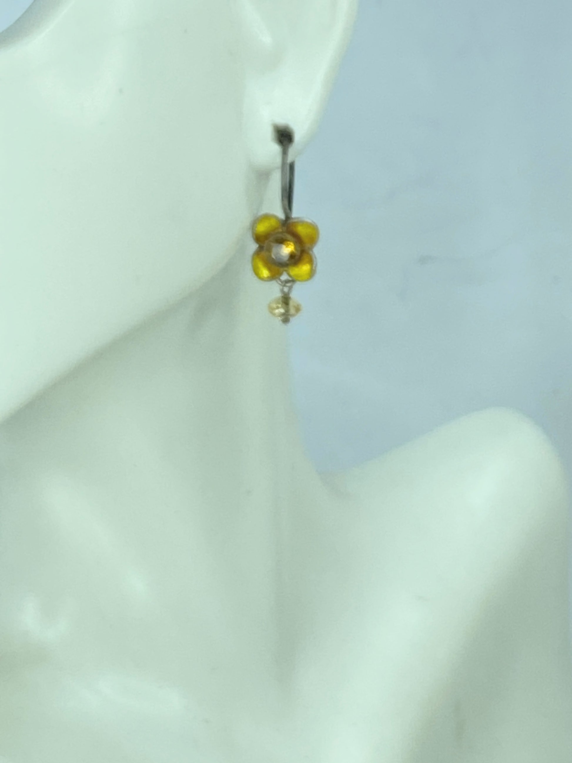 A lovely pair of Art Deco dangling earrings, circa 1930-1940, features a beautiful flower bezel set with one 4.0mm Citrine, the petals inlayed with yellow enamels, and it dangles down one yellow rondelle crystal. Fish hook earring back, hanging back 1.0" 9.5mm wide, no hallmark, and tested for sterling silver.