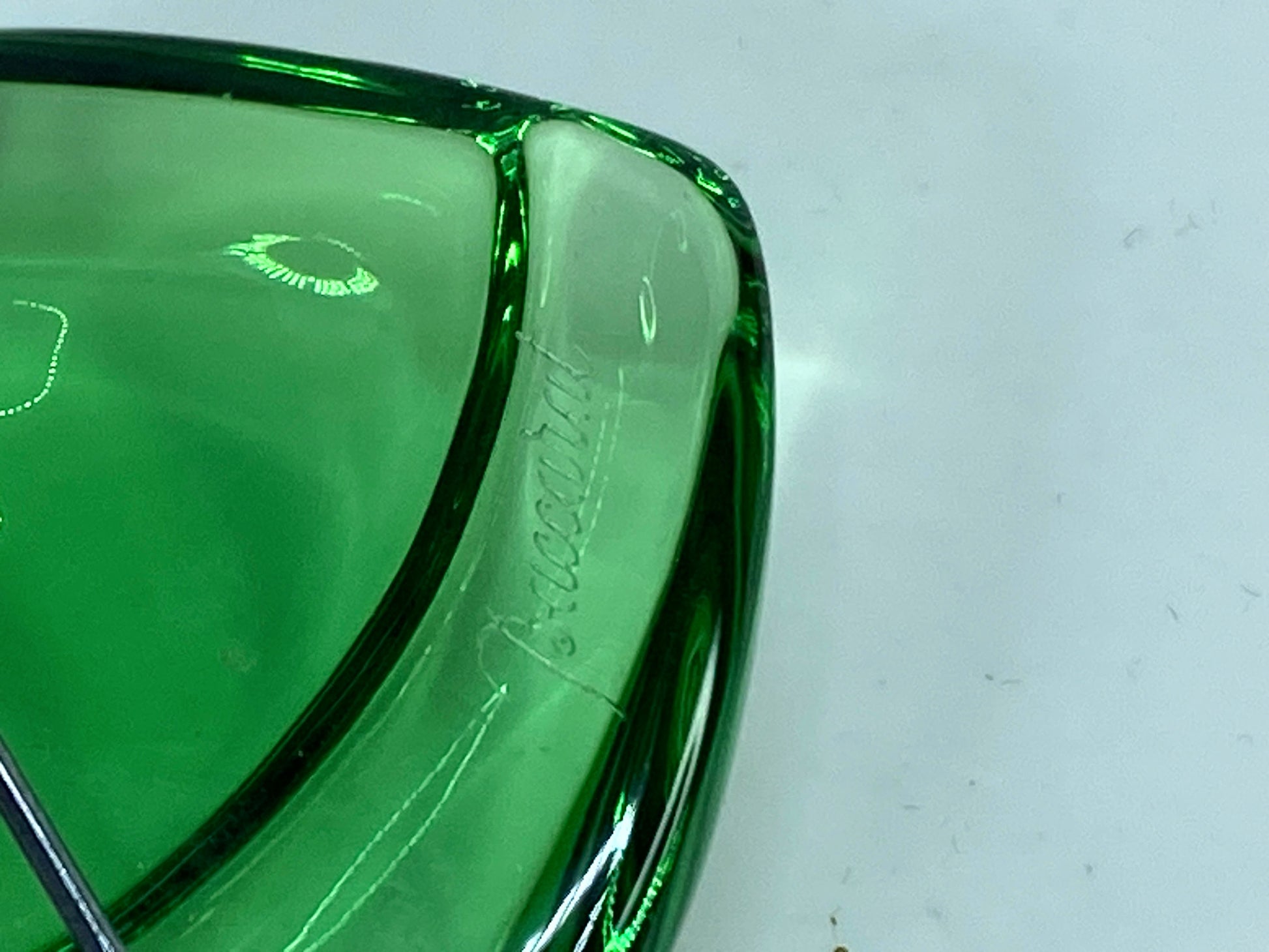 This is a rare light green (jade) color crystal pin, and it is crafted to perfection in the most sparkling clarity of hand-blown full lead crystal on a sterling silver mounting. The heart pin measures about 1.5 inches (4 cm) wide and tall. Condition is previously owned with slight tarnish as shown. The signature script Baccarat is etched on the front side edge. • Full-lead crystal. • Made in France. The crystal pin brooch is just lovely to hold and so trendy to wear! It comes with an original velvet red pouch