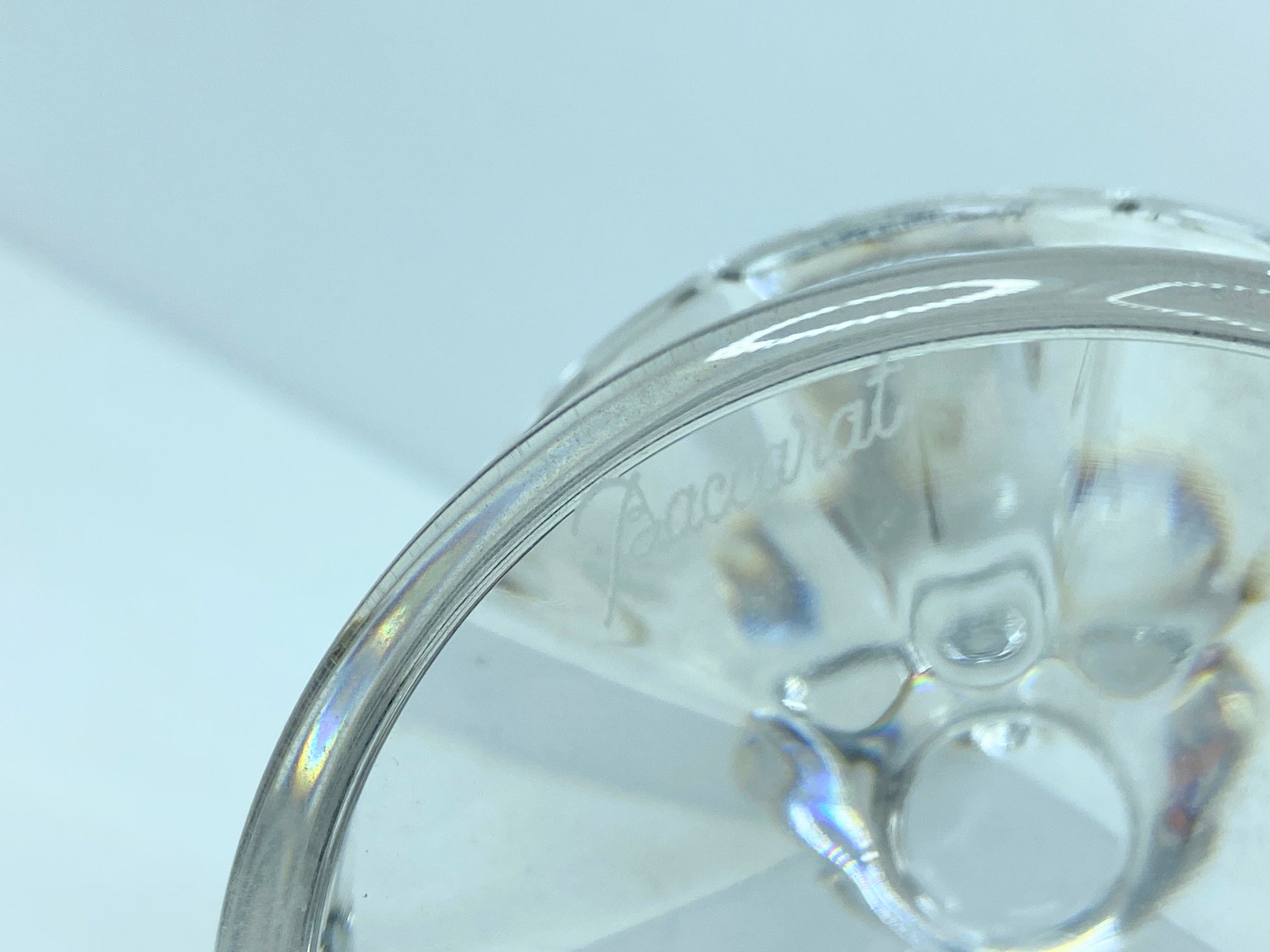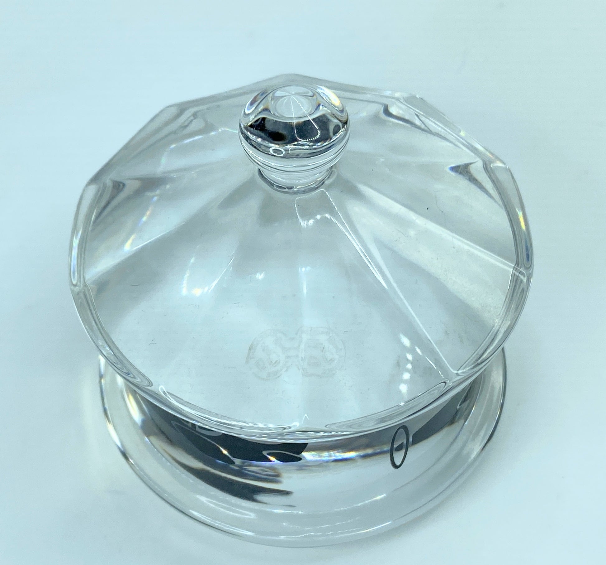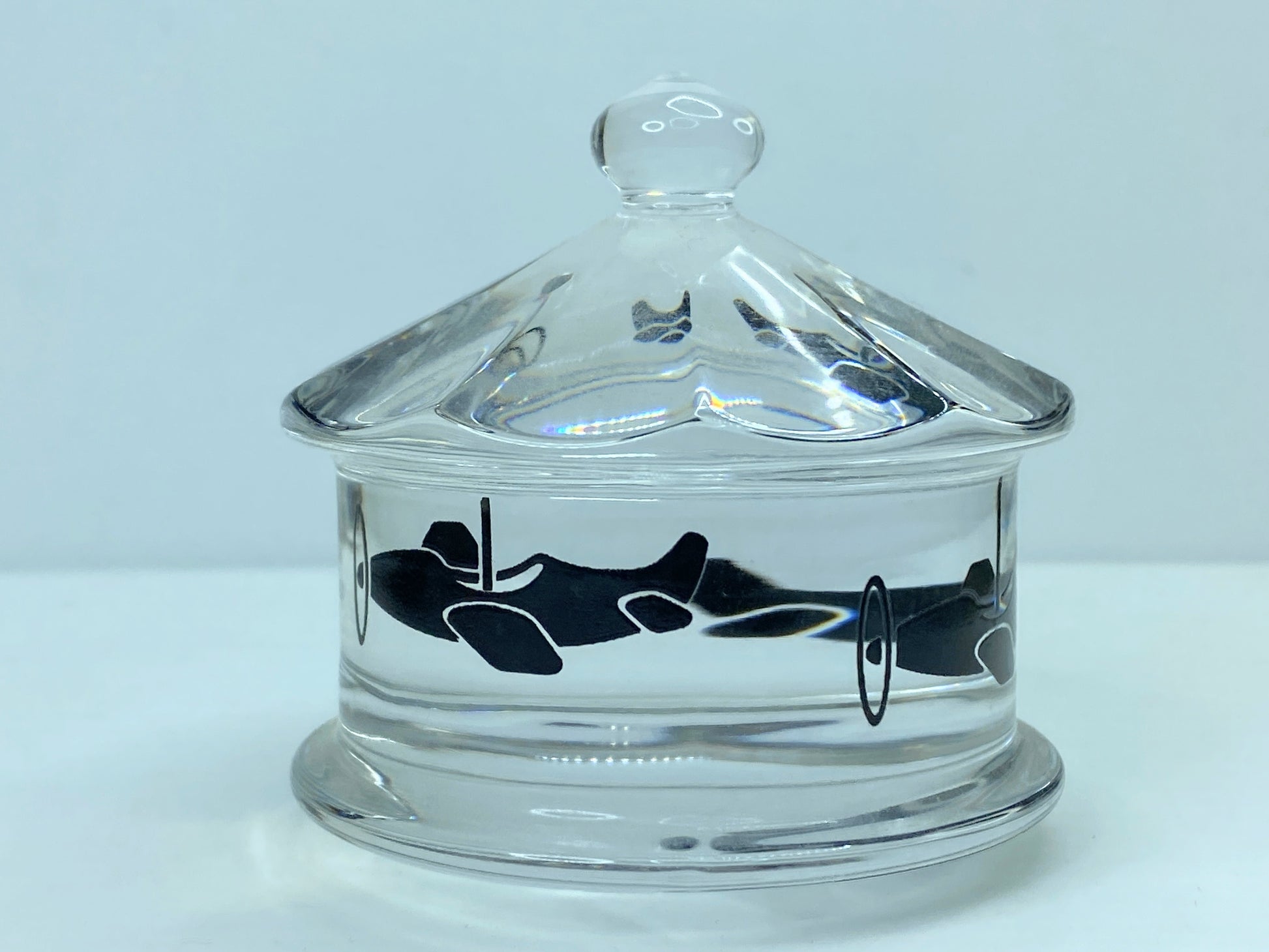 A crystal paperweight in the shape of a carousel. It is accented with vintage cars and “spins like a top”. The base is etched with the word BACCARAT and three trademarks.
