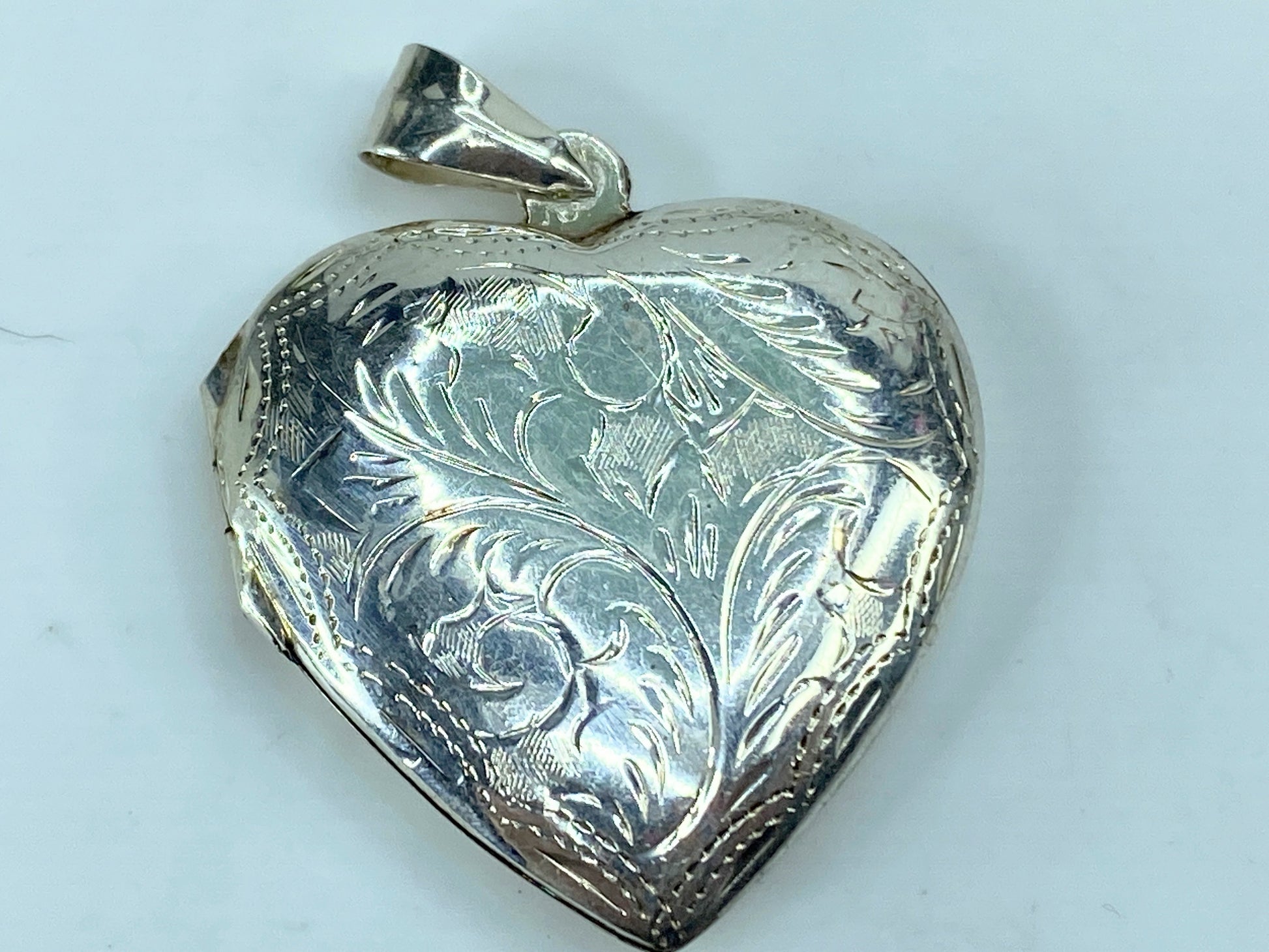 Beautiful sterling 925 etched heart sharp locket LOVE theme pendant. It looks great when worn with a collar necklace. Hand-chased, reversible, floral design. Hanging length is 1 3/4" x 1 1/4" x 6.3mm, weight 7.0 gram, hallmark 925