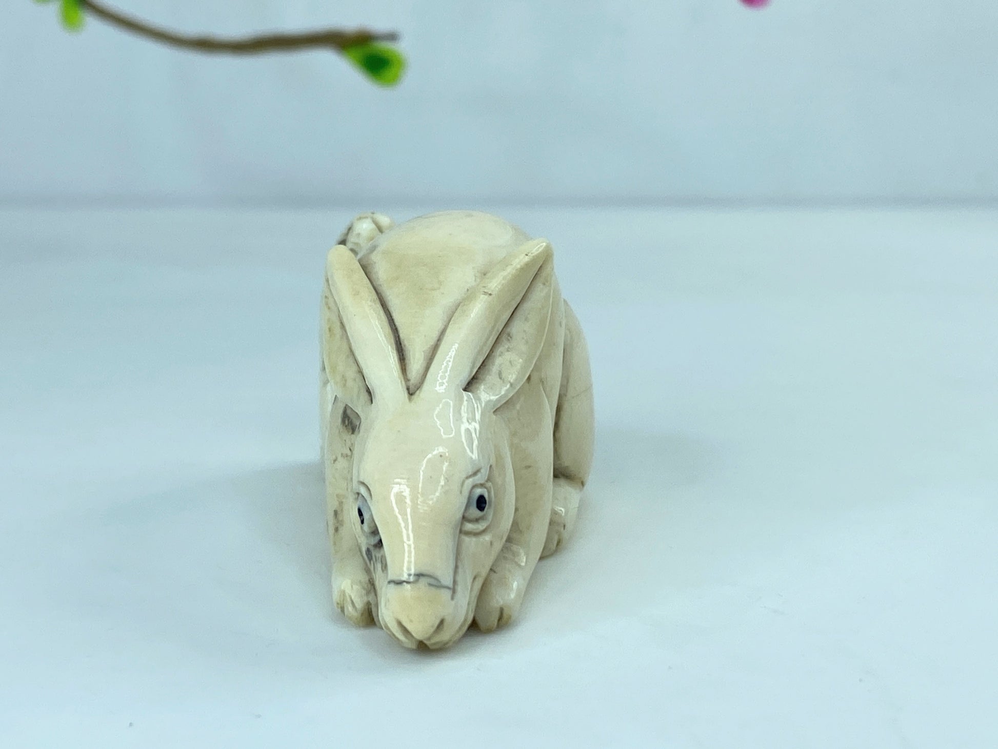 A whimsical c1950s hand-carved Japanese Resin/faux ivory netsuke figurine. It depicts two nesting bunnies. This symbolism stems largely from the popular tale of the Moon Rabbit. In Japanese culture, a netsuke with small and large rabbits together could be interpreted as a charm for a long, prosperous, and fruitful life, potentially with a large and thriving family, and signifying continuous progress and development in one's endeavors.
