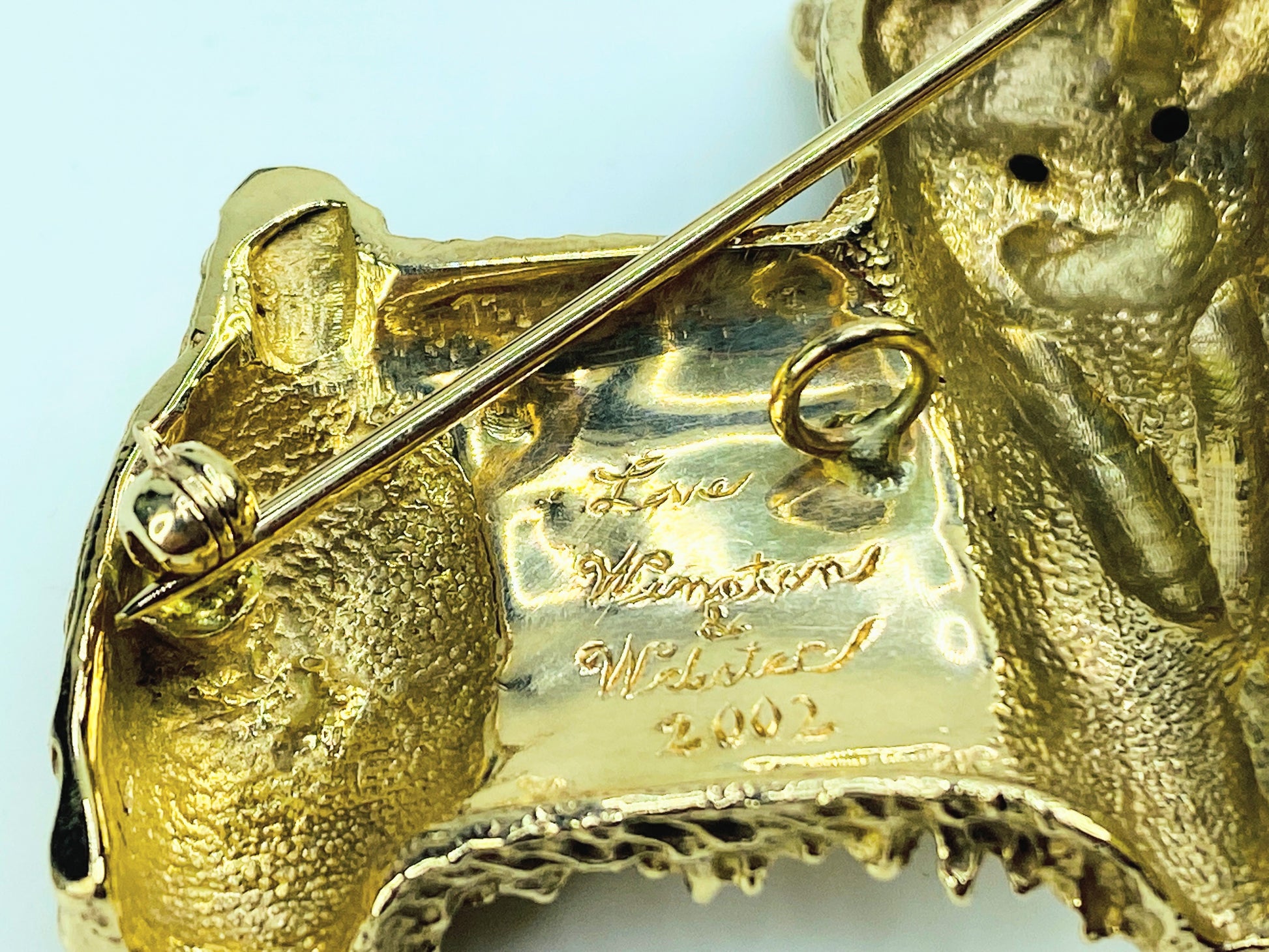Custom-made 14K yellow gold brooch in the likeness of a Yorkshire Terrier. This boy-dog charm features black enamel accents, striking black diamond eyes, and meticulous detail etching to capture the terrier’s playful expression. The reverse is engraved and equipped with a hinged, locking pin for secure wear. Measures 1 5/8" x 1 5/8" with a total weight of 24.8 grams. There is no hallmark on the piece, but the metal has been tested and confirmed as 14K gold. A matching girl-dog brooch is available in the other listing. This distinctive piece makes a beautiful gift for dog lovers, Yorkie enthusiasts, or collectors and can be worn on a blazer, scarf, or hat.