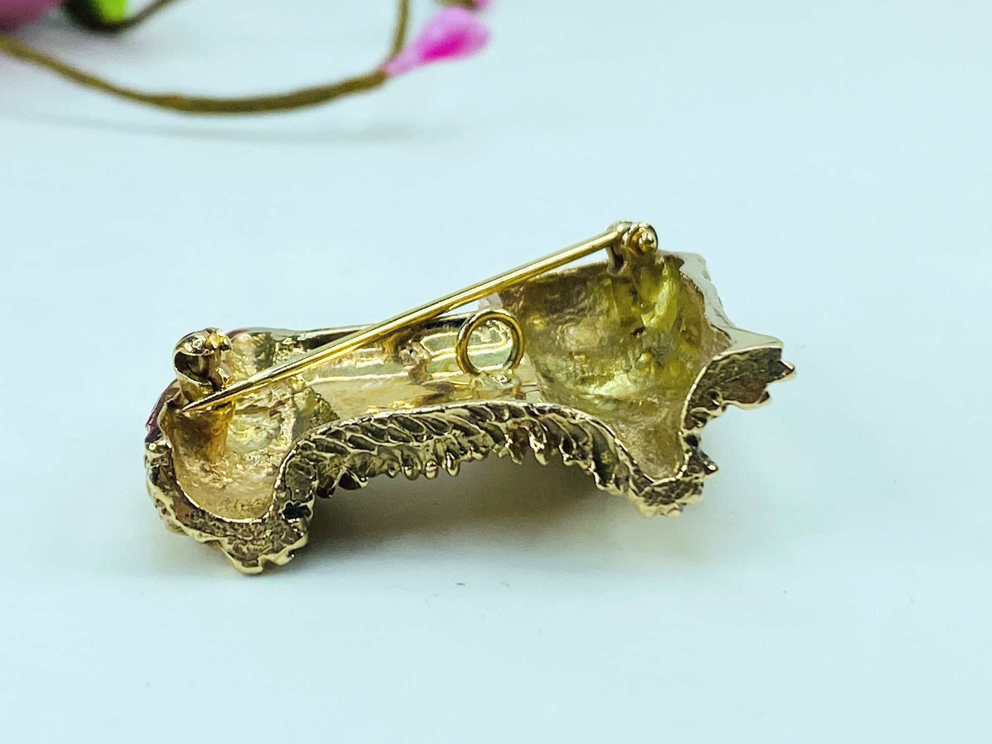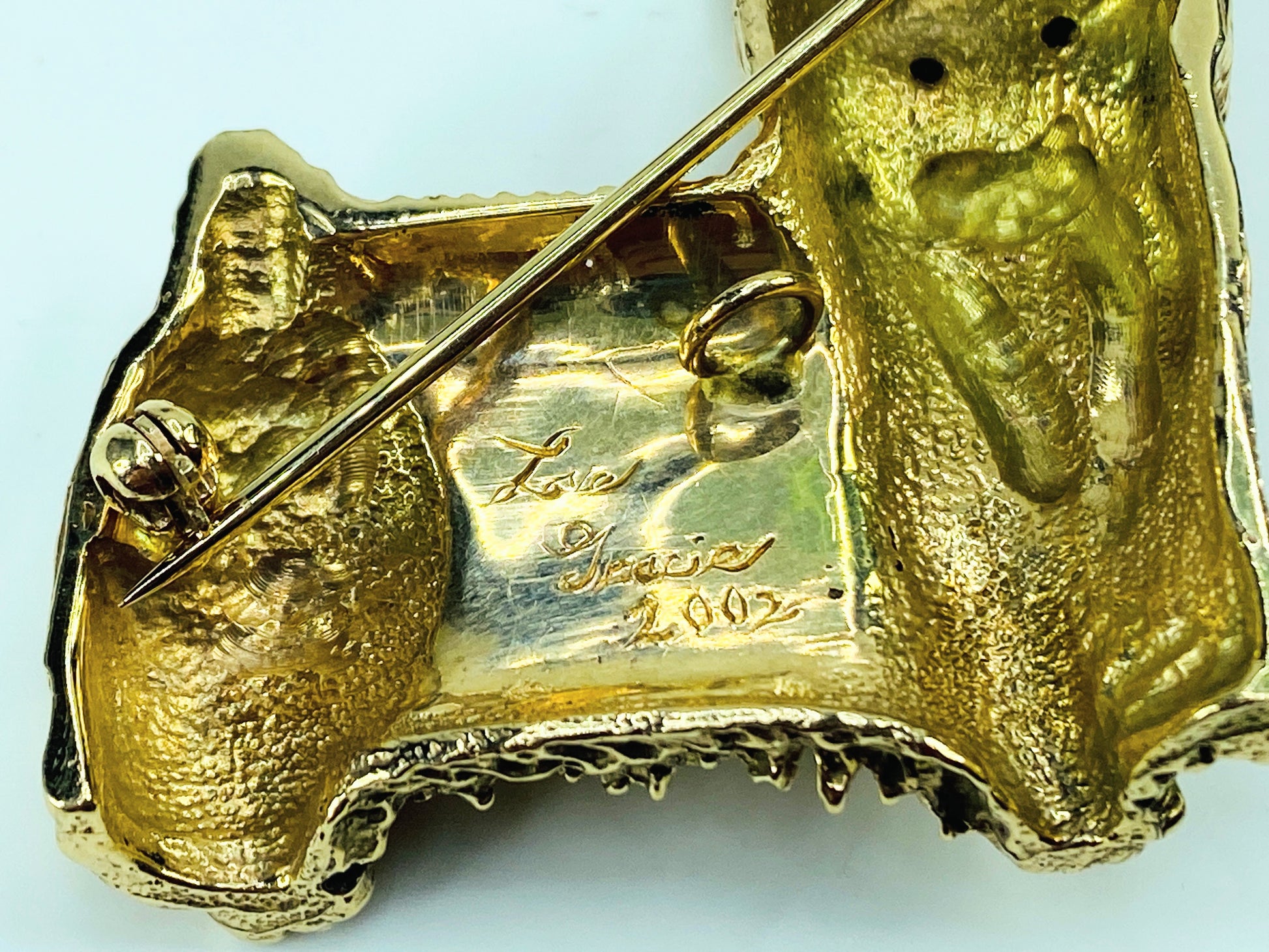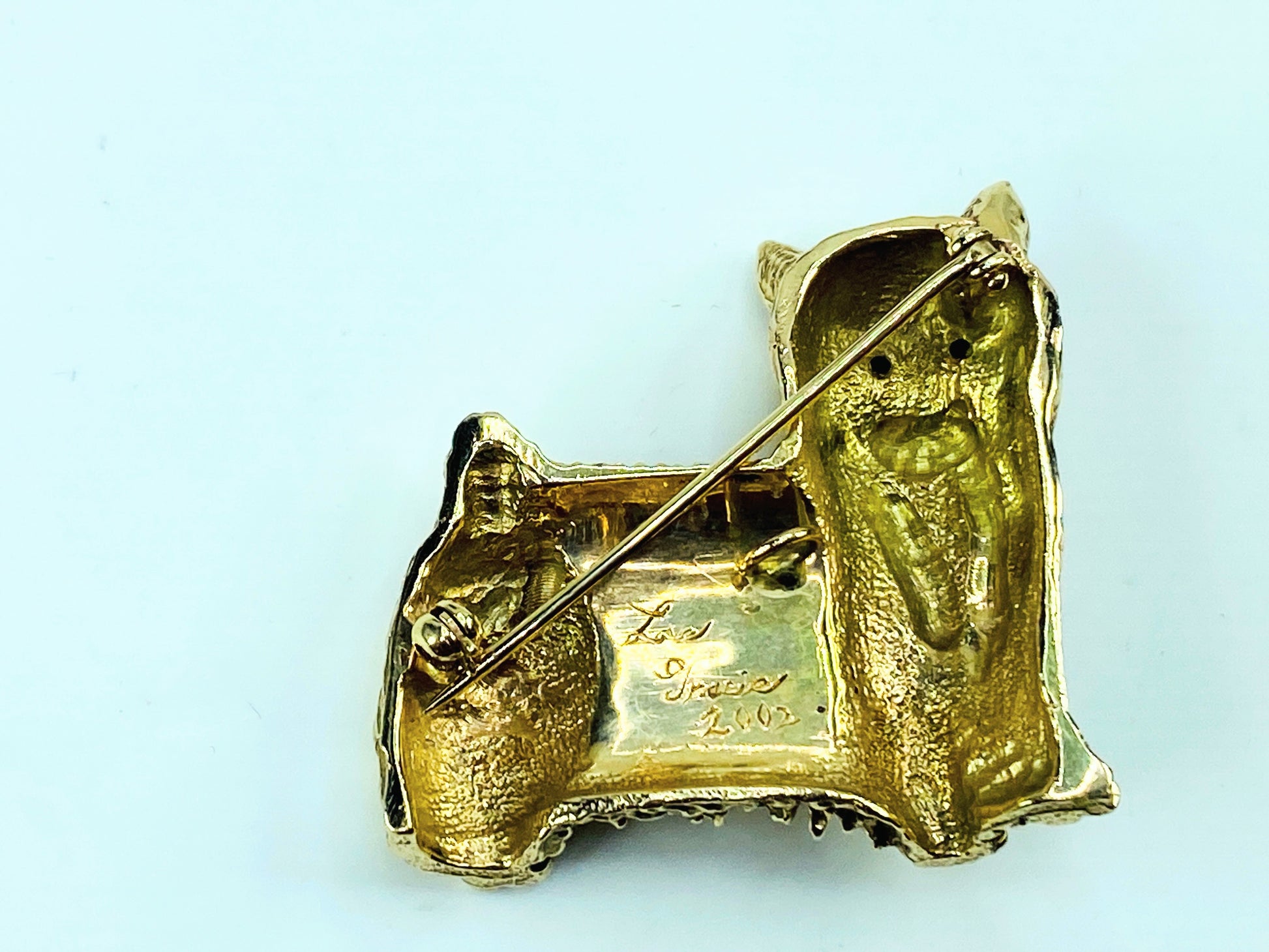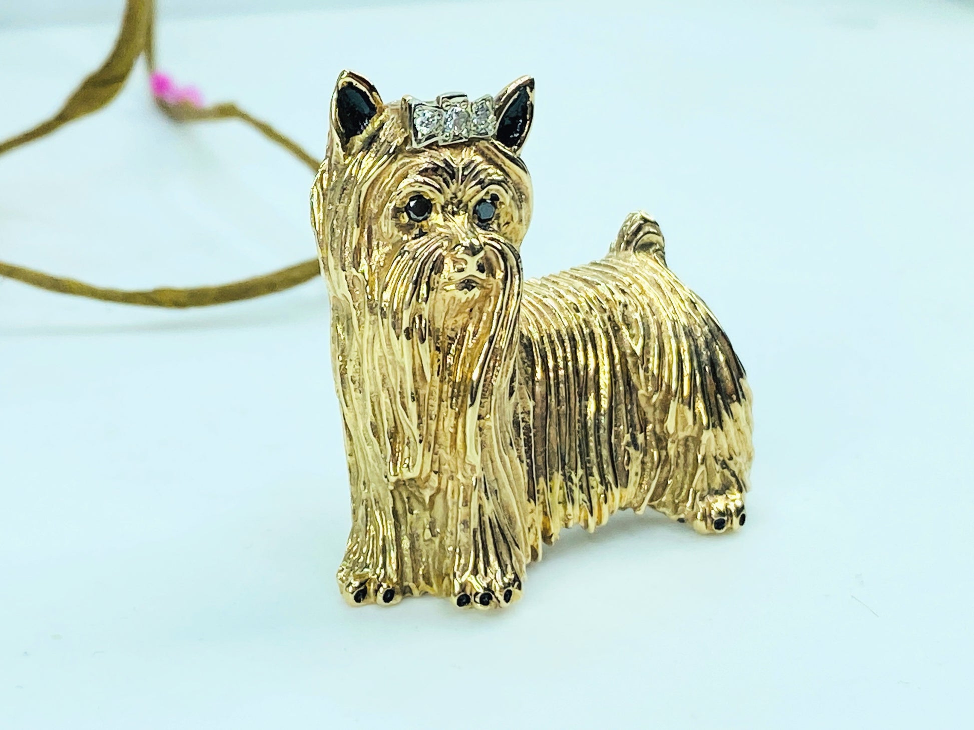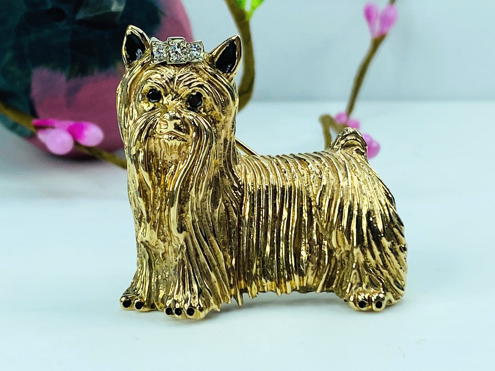 Custom-made 14K yellow gold brooch in the likeness of a Yorkshire Terrier. This boy-dog charm features black enamel accents, striking black diamond eyes, and meticulous detail etching to capture the terrier’s playful expression. The reverse is engraved and equipped with a hinged, locking pin for secure wear. Measures 1 5/8" x 1 5/8" with a total weight of 24.8 grams. There is no hallmark on the piece, but the metal has been tested and confirmed as 14K gold. A matching girl-dog brooch is available in the other listing. This distinctive piece makes a beautiful gift for dog lovers, Yorkie enthusiasts, or collectors and can be worn on a blazer, scarf, or hat.