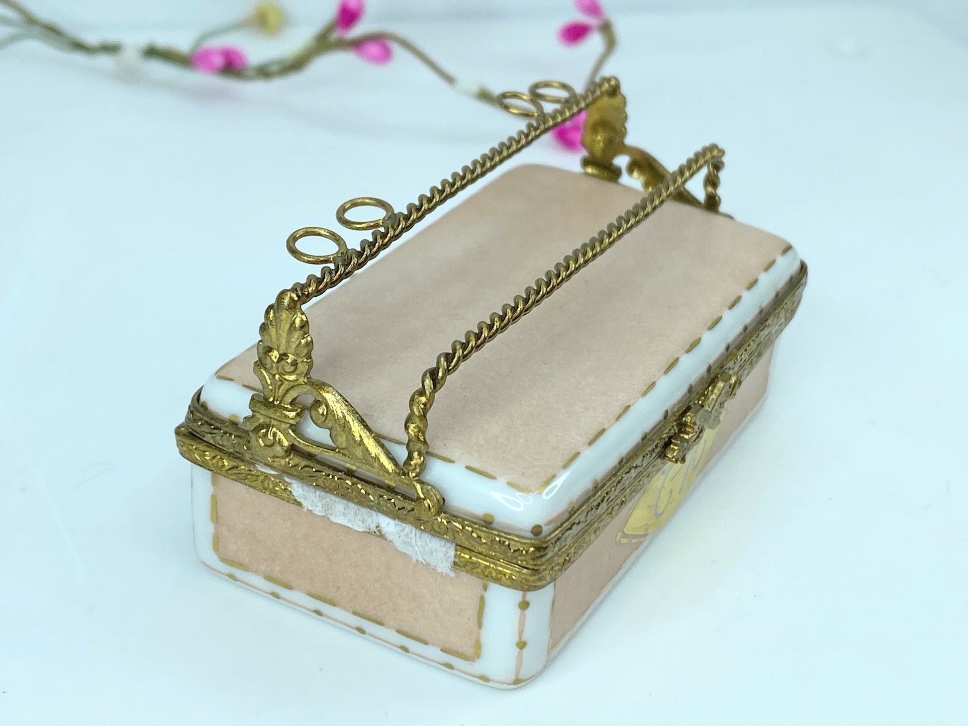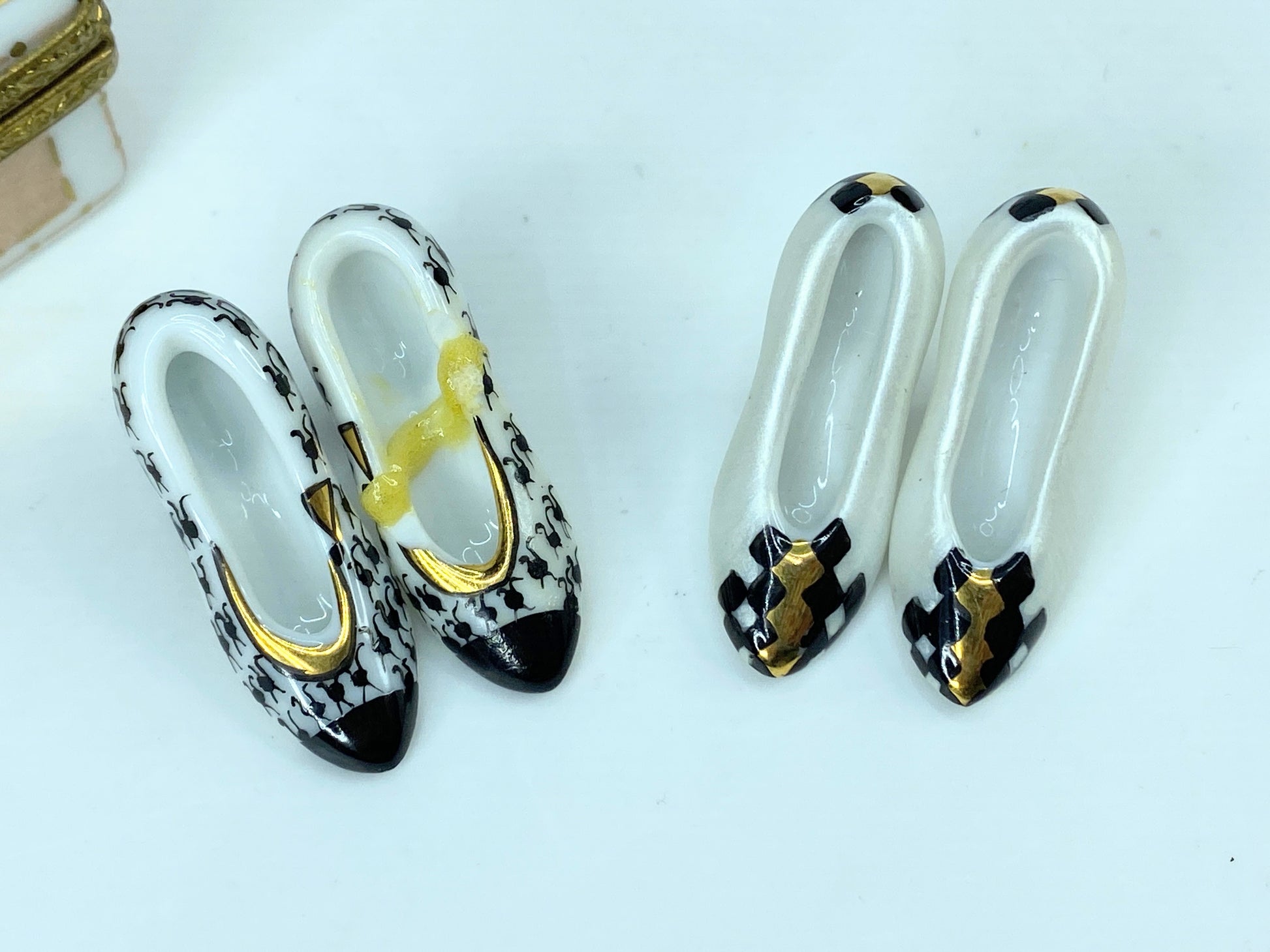 Simply Elegant! If you like shoes - and who doesn't!!! - then this outstanding Shoe Case Limoges box with two pairs of handsome designer shoes is a Must-Have for you! The elegant shoe case is hand-painted in pale pink with 24K Gold designs. A very handsome double rack atop the case holds two pairs of shoes for display. The shoes can also be displayed inside or on the side. Inside is a painted Purse. This very handsome Limoges box is crafted of fine French porcelain and artfully hand-painted by artisans in Limoges, France. The collectible Limoges box is adorned with intricate metalwork and an ornate clasp. Fully marked at the base with the insignia of the artist.