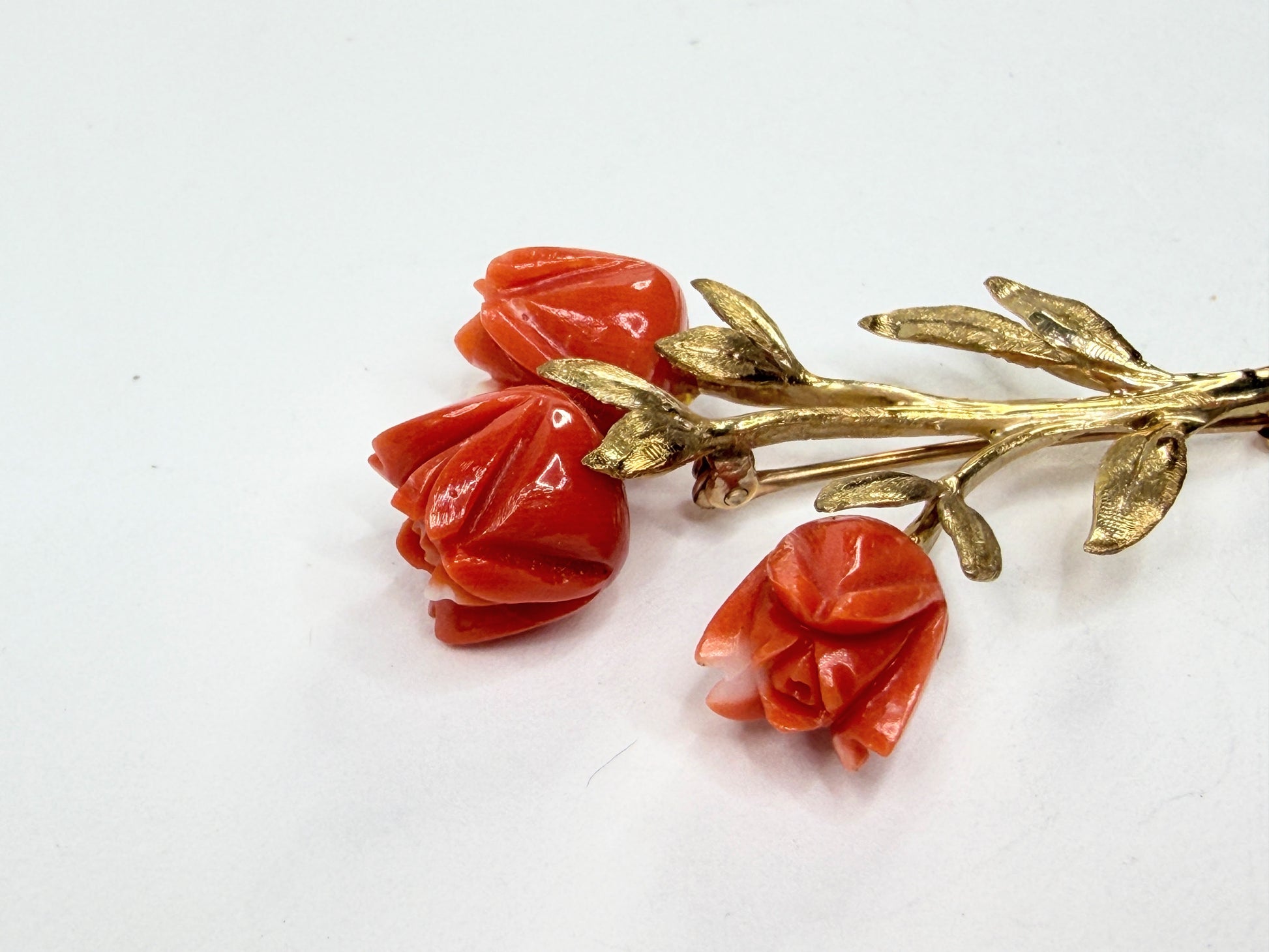 Early 20th century floral brooch crafted in 14K yellow gold, set with three hand-carved natural coral roses. The sculptural gold stem and leaves show fine period workmanship, with softly textured surfaces typical of early-century jewelry. The coral displays a warm salmon-red tone with natural variation and careful carving. This brooch originates from a coordinated early-century set and is offered here individually. Hallmark verified. A refined collector piece with strong visual presence.