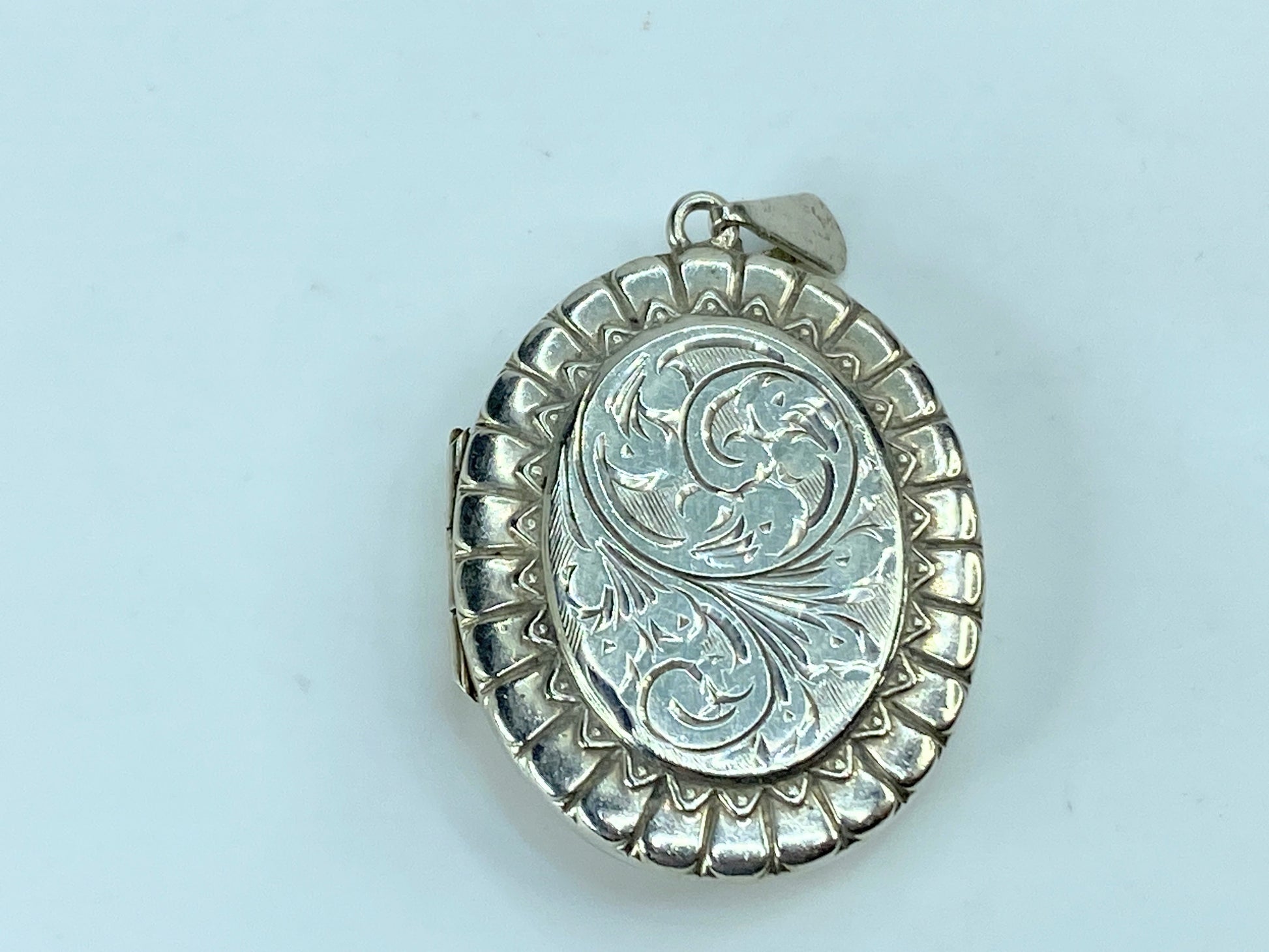 Vintage Engraved Double Photo Locket Pendant Necklace Hallmarked Birmingham 1977…. Vintage silver locket pendant….measures 1 5/8 inches long and 1 1/8” wide and hangs 2”….Engraved pattern on the front, plain back….. In Victorian style with ornate engraving, but it is a revival piece from the 1970s…Weight 9.7 gram, excellent condition