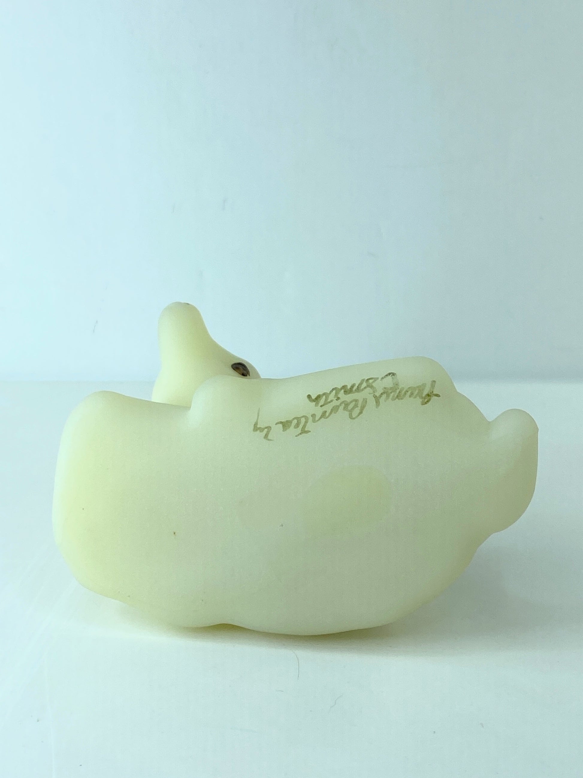 This Fenton custard glass figurine features a stunning deer design with hand-painted pinecones on a yellow glass deer which glows green under UV light. The mid-century modern style and all-over pattern make it a beautiful addition to any collection. This vintage piece is an original studio-crafted item from the United States and is signed by the artist. Perfect for decorative purposes, this figurine is a true work of art and will add a touch of elegance to any room.