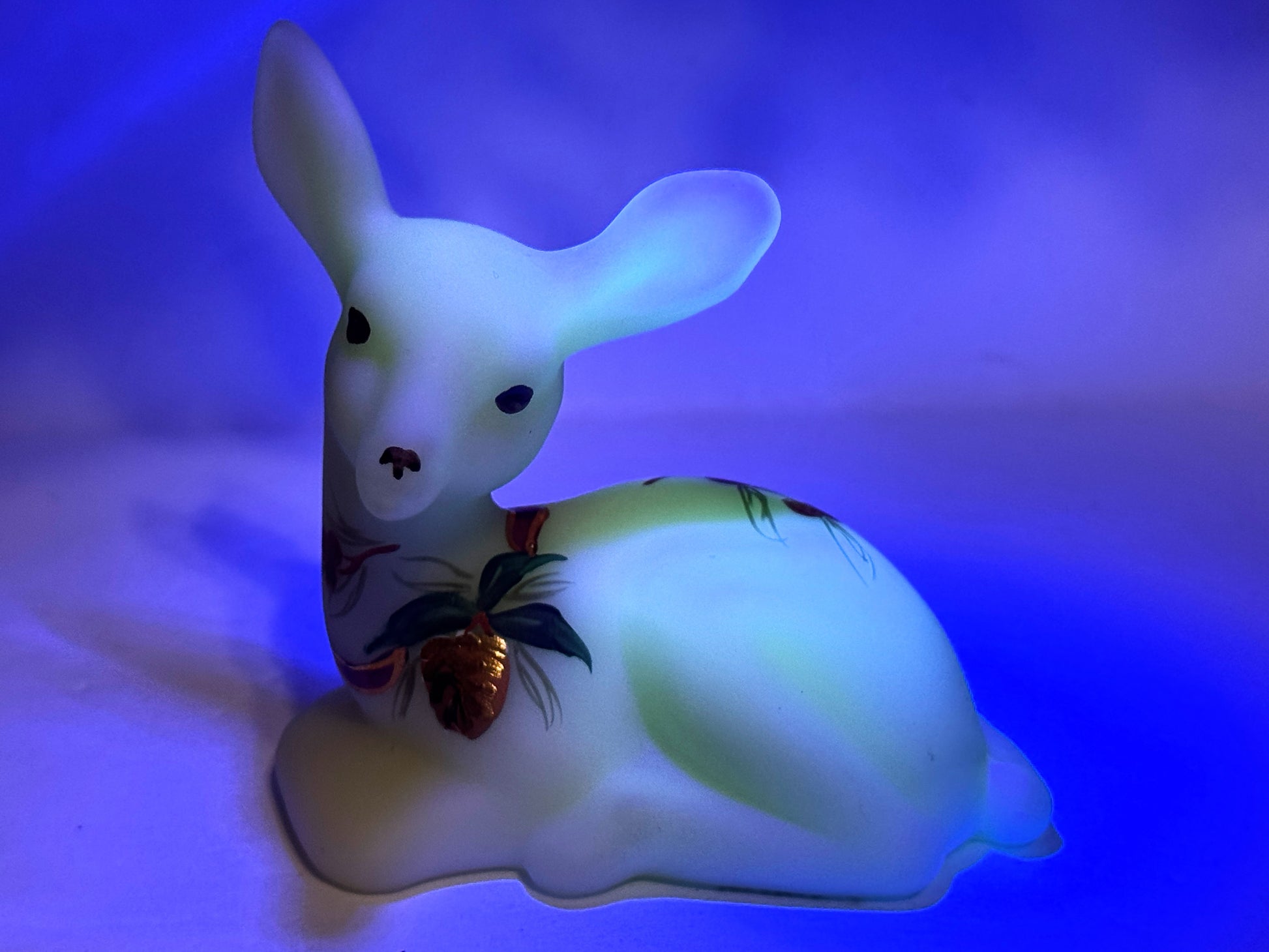 Fenton Custard Uranium Glowy Deer w/ golden pinecone and berry figurine A579
