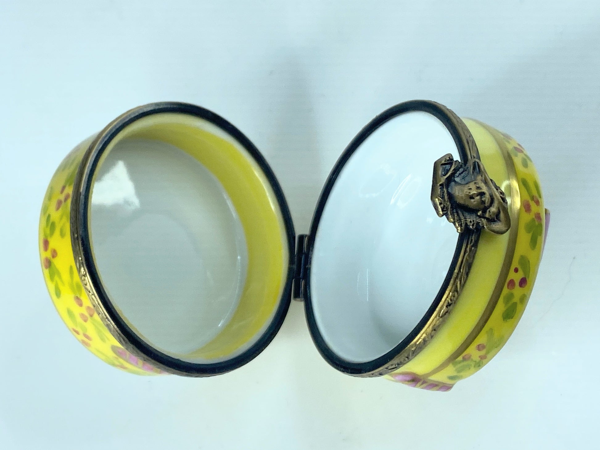 G.R. Yellow Hat Box w/ Pink Ribbon Peint main Limoges Trinket France 1 3/4" A356