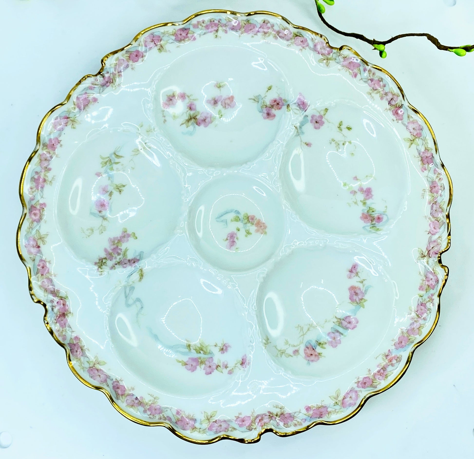 White Porcelain Five-Well Oyster Plate with Center Well, shell-pink Floral Border with blue Accents. The scalloped rim has gold daubs. This antique porcelain plate, made in Limoges France, measures 9". No chips or cracks, slight decal wear in the center.