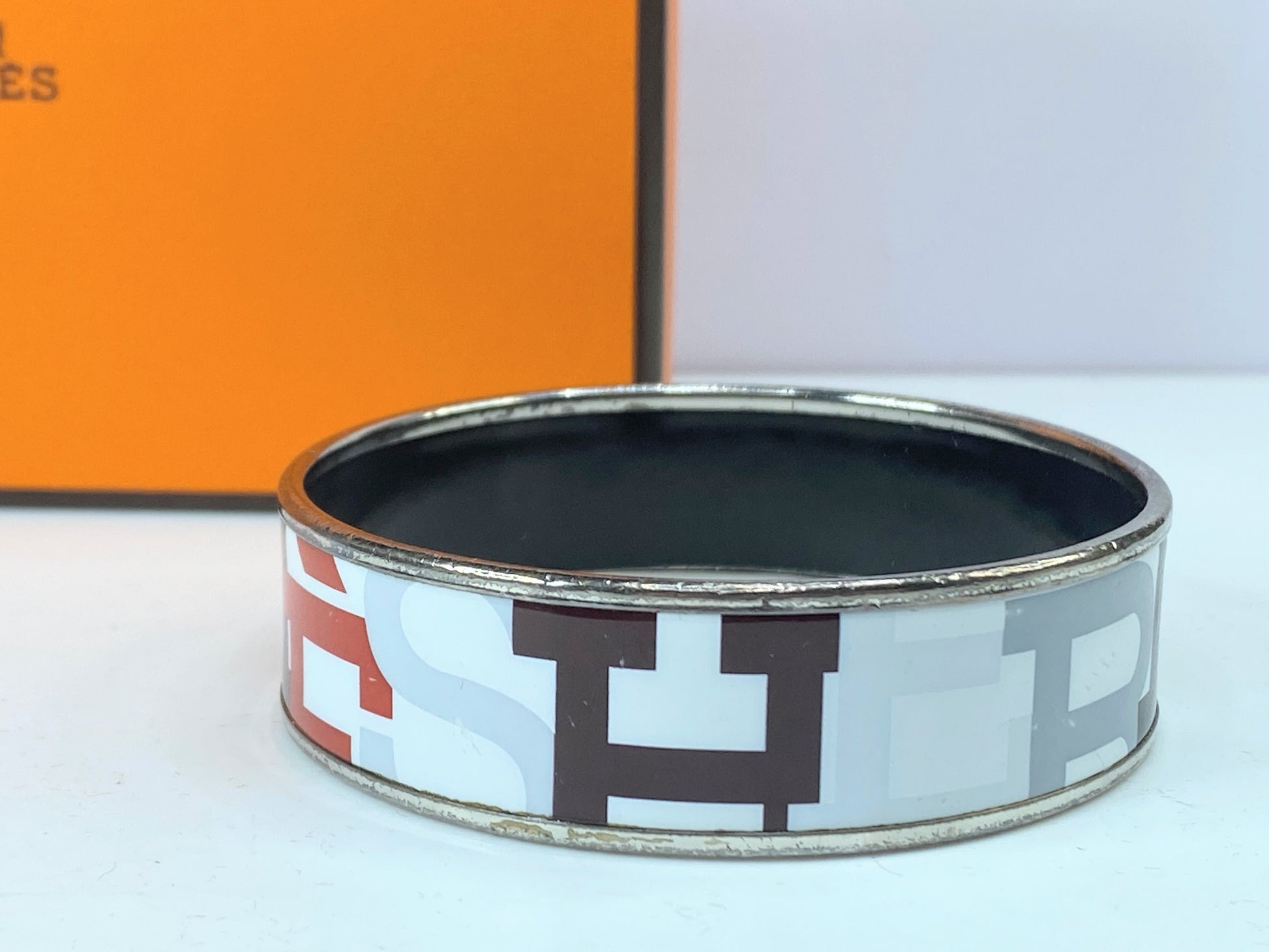 Hermes wide Capitales printed enamel palladium-plated bangle featuring the HERMES logo in white, grey, black, red, and brown on a white background. The bangle is 18 mm wide and 2 mm thick. Fits a 7" wrist size.