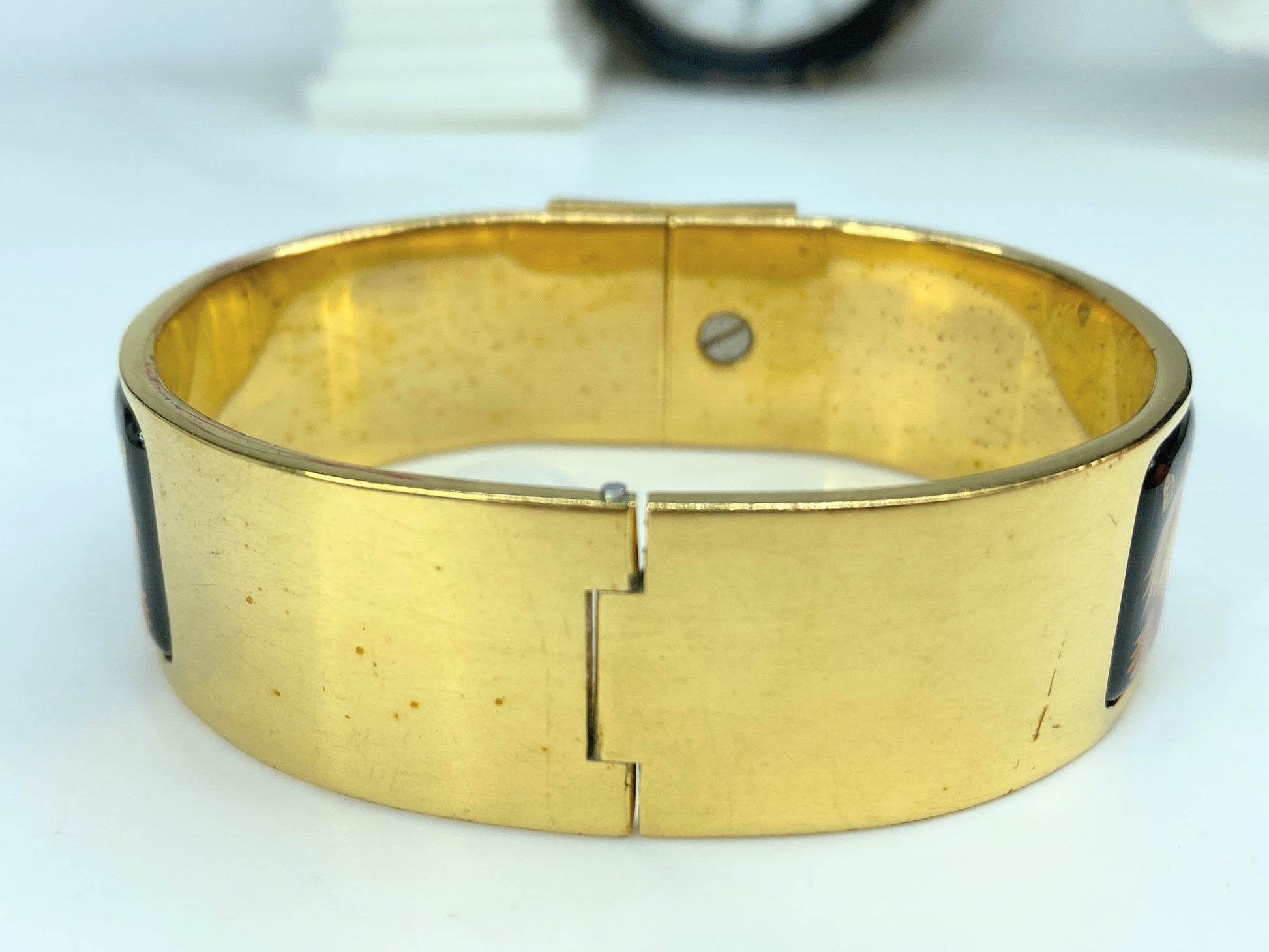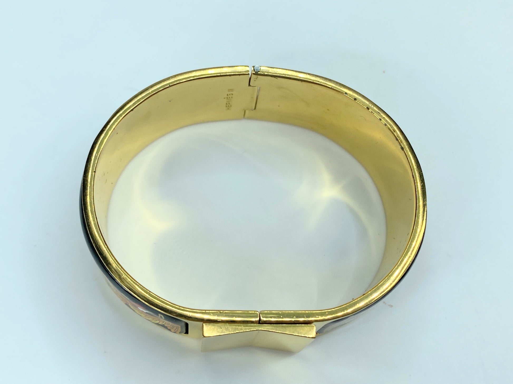 This is authentic. HERMES Vintage Enamel Printed Clic Clac Wide Bracelet GM. The bracelet is plated in gold with a lining of black enamel, bordered by blue, with ostrich fans and a string of pearls and other embellishments. There is a clap on the prominent side. This is an exceptional bracelet with the sophisticated style of Hermes!