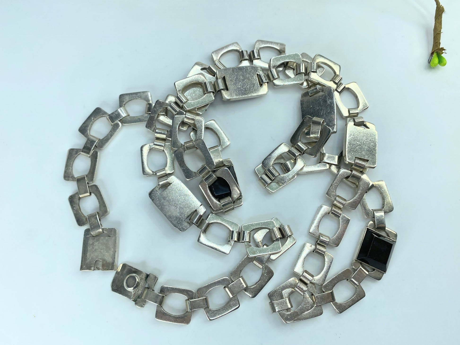 Huffy MEXICO 1970 Taxco Modernist Geometric Necklace 925 Sterling Onyx 37"JR828
