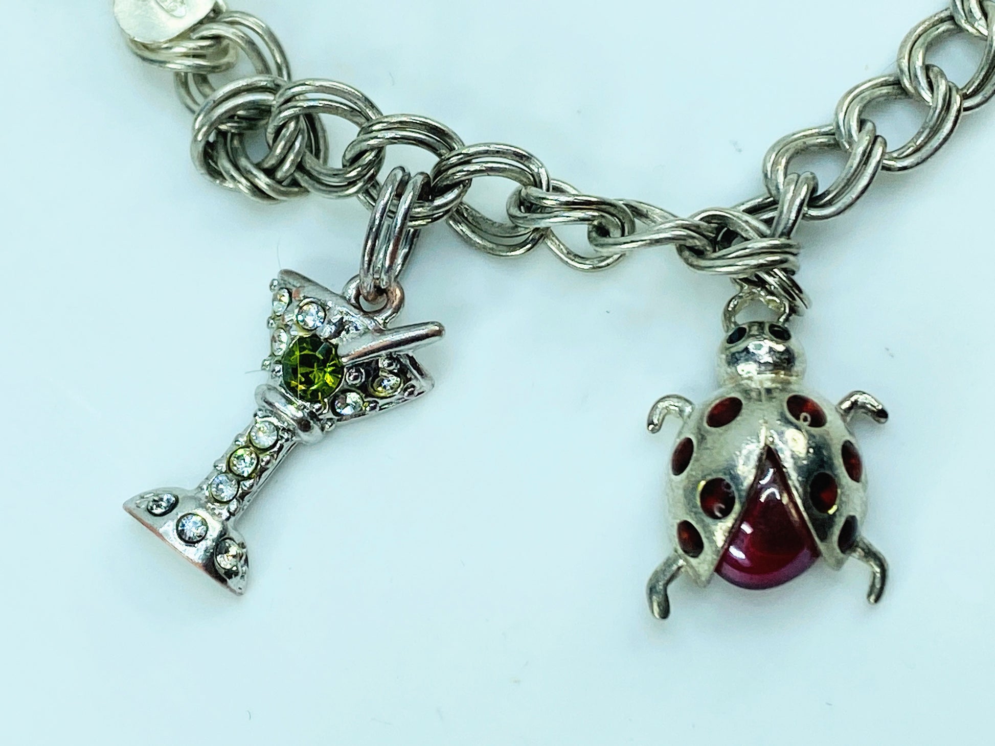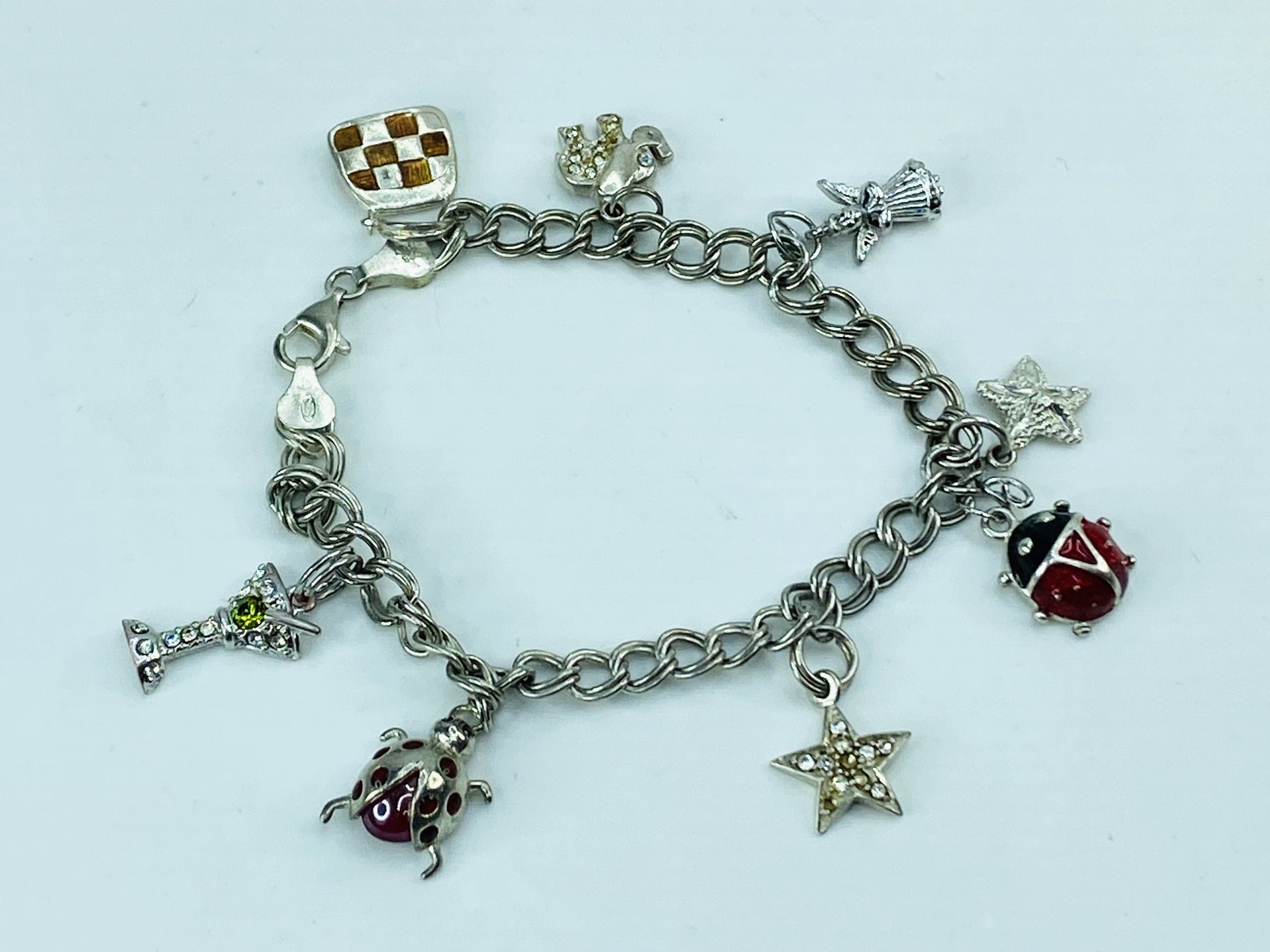- Charms: Lady bag, stars, ladybug, champagne (rhinestone and enamel accents)
