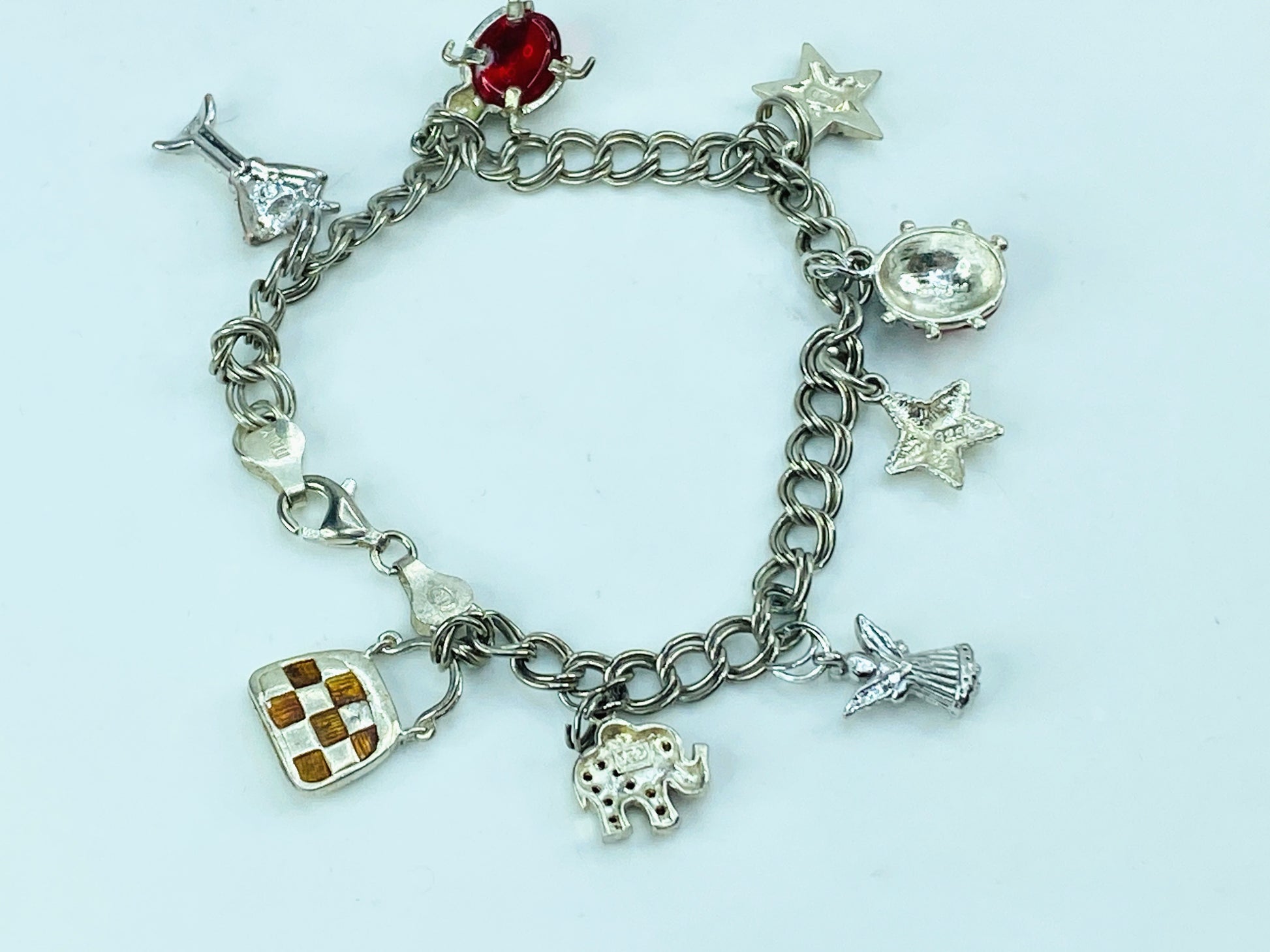 Crafted in Italy from 925 sterling silver, this double-link charm bracelet measures 8.0 inches and weighs 22.3 grams. The four whimsical charms—lady bag, stars, ladybug, and champagne—are adorned with sparkling rhinestones and enamel for color and flair. A timeless piece with a touch of playful charm, it’s ideal for everyday wear or as a thoughtful gift.