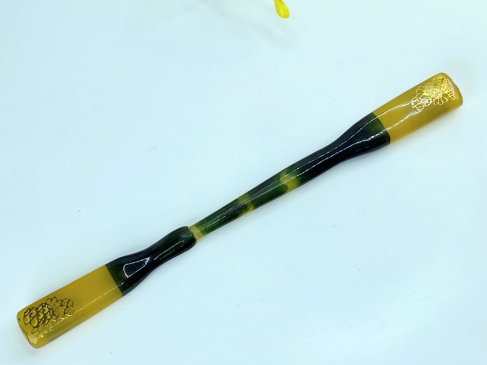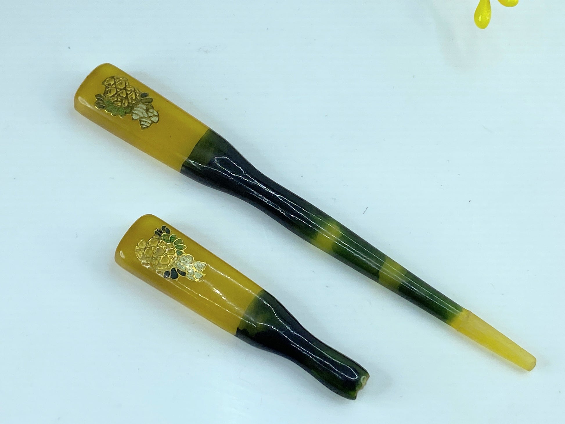 This elegant Koga kanzashi is made of celluloid - a kind of vintage plastic that imitates natural materials. It features ornate gold etching at both ends and a semi-transparent green color in the center. It is of excellent quality and design. It measures 6.5", 13.9 grams