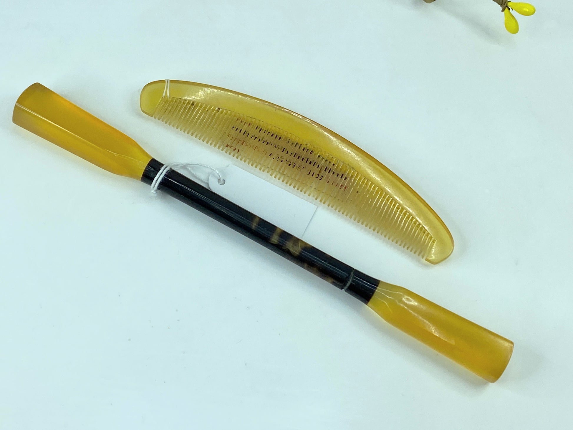 Japanese Kanzashi Kougai set of 2 resin hair ornaments, featuring a delicate design, in excellent condition. 6 3/8" and 4 1/4" x 7/8".