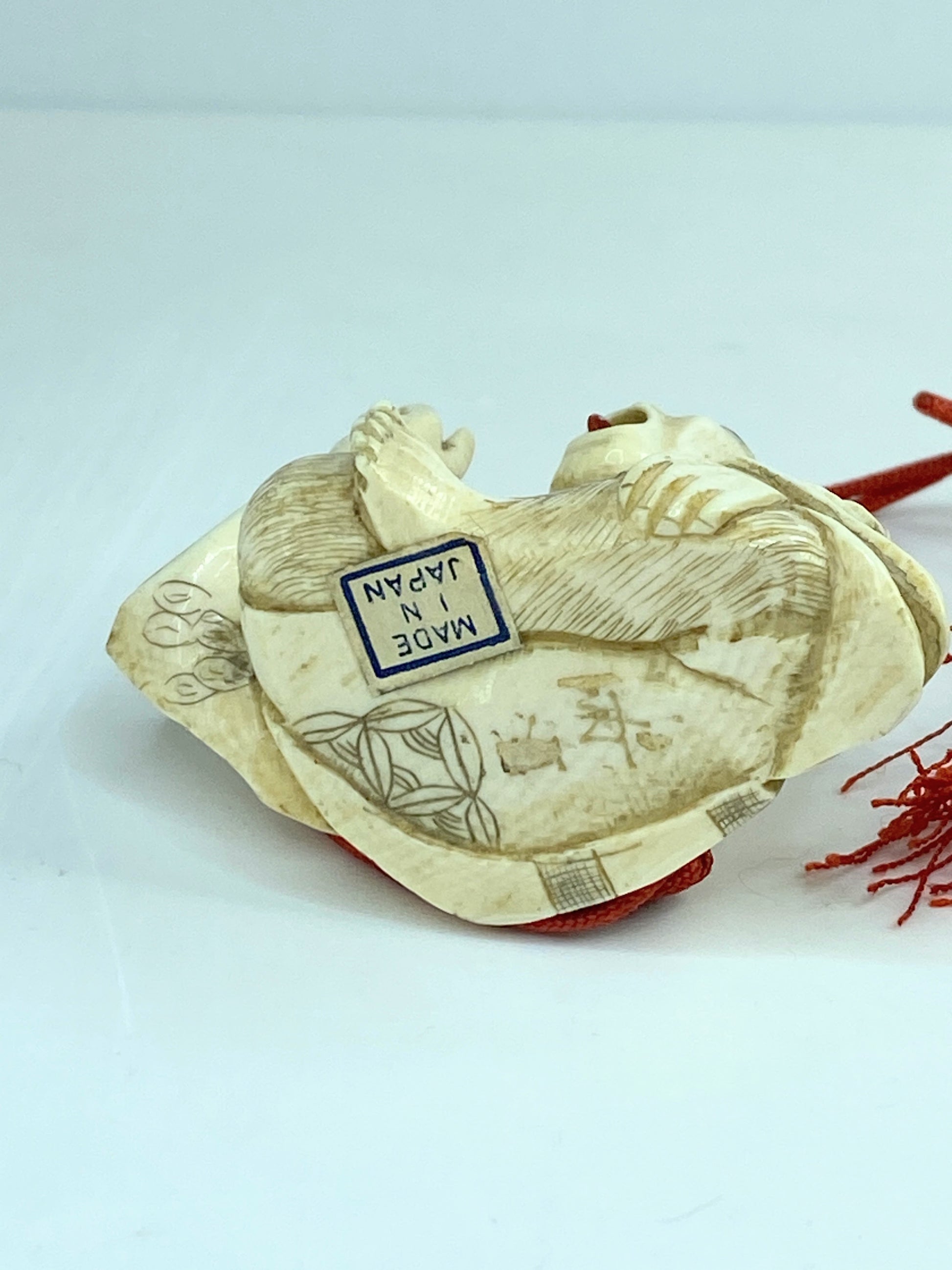 Netsuke Japanese Hand-Carved Polychrome Decorated Figure "Sorcery", depicting a strongman seated on the floor, right hand up with hand sign of "Peace", he has a retractable "scarlet color tongue", the red silk tassel added in a later date, the piece is signed on the bottom from the Meiji period.