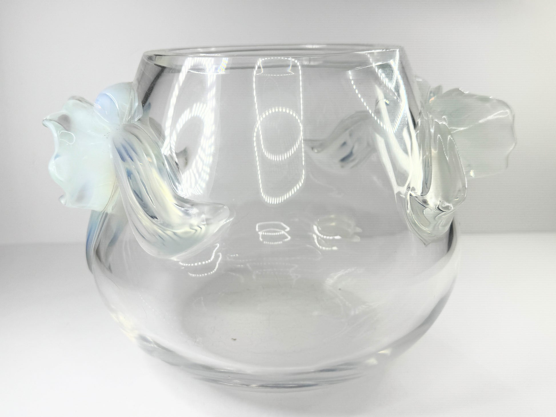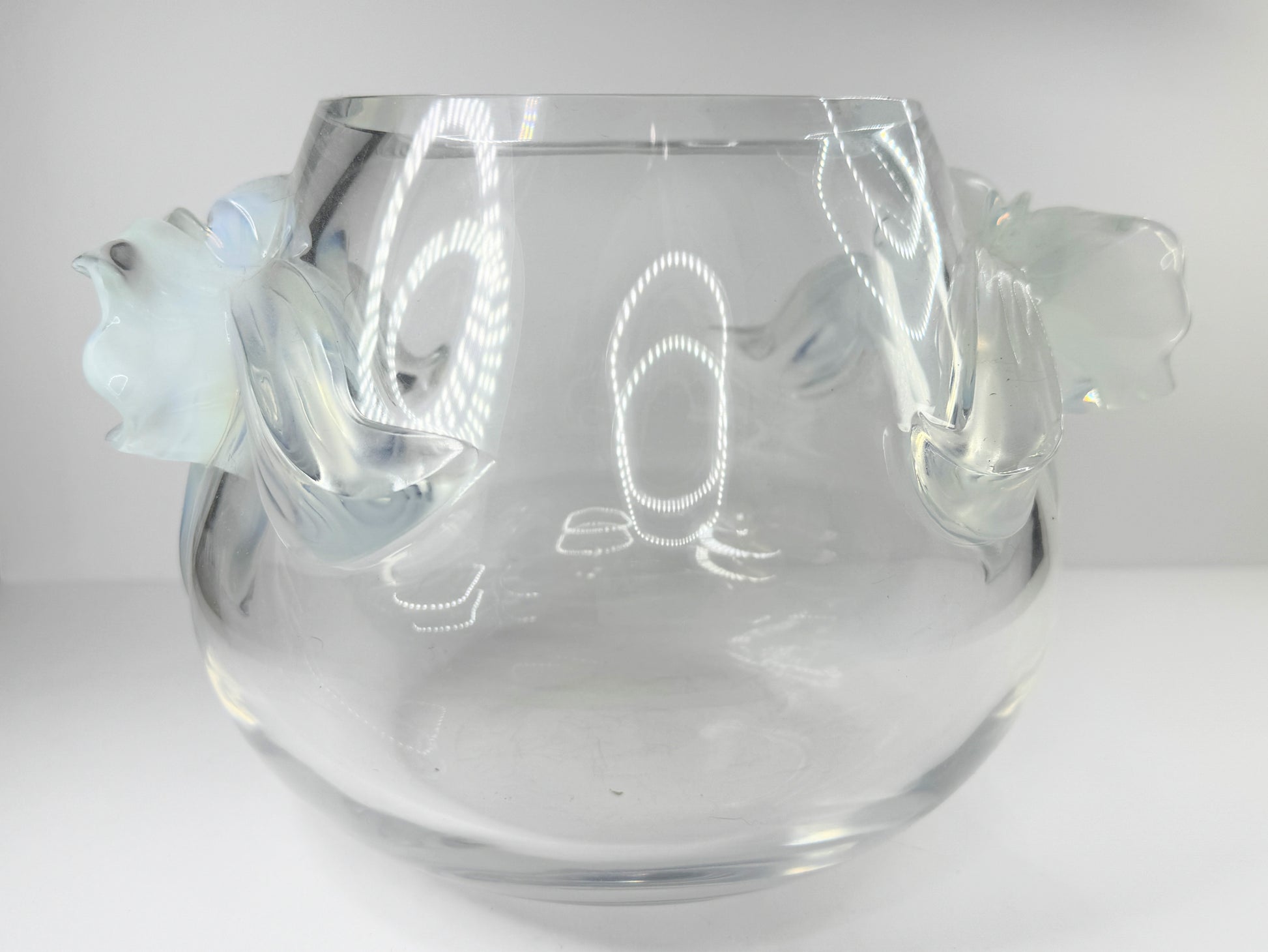 This elegant Lalique Orchidee vase embodies timeless French crystal artistry. The rounded body sits on a substantial base and tapers gracefully toward the mouth, creating a refined silhouette. On opposite sides, two large dimensional orchids rise in relief, rendered in opalescent glass with delicate hints of blue that catch the light from every angle. The piece features clear walls about 0.5 inches thick, contributing a notable heft for its size and a sense of enduring quality. A striking display object that pairs luxury with nature-inspired design, this vase showcases Lalique’s renowned craftsmanship and the distinctive orchid motif.
