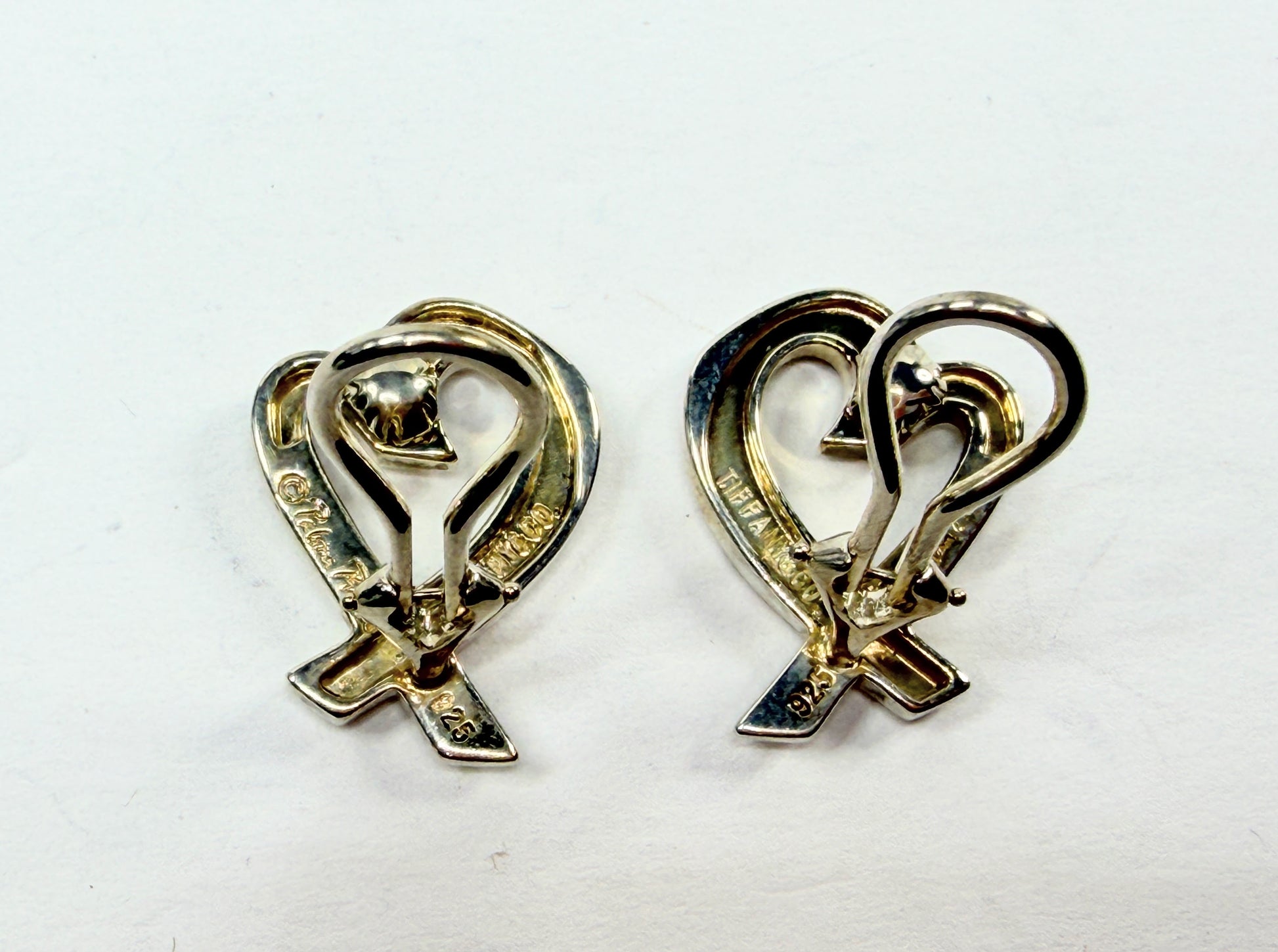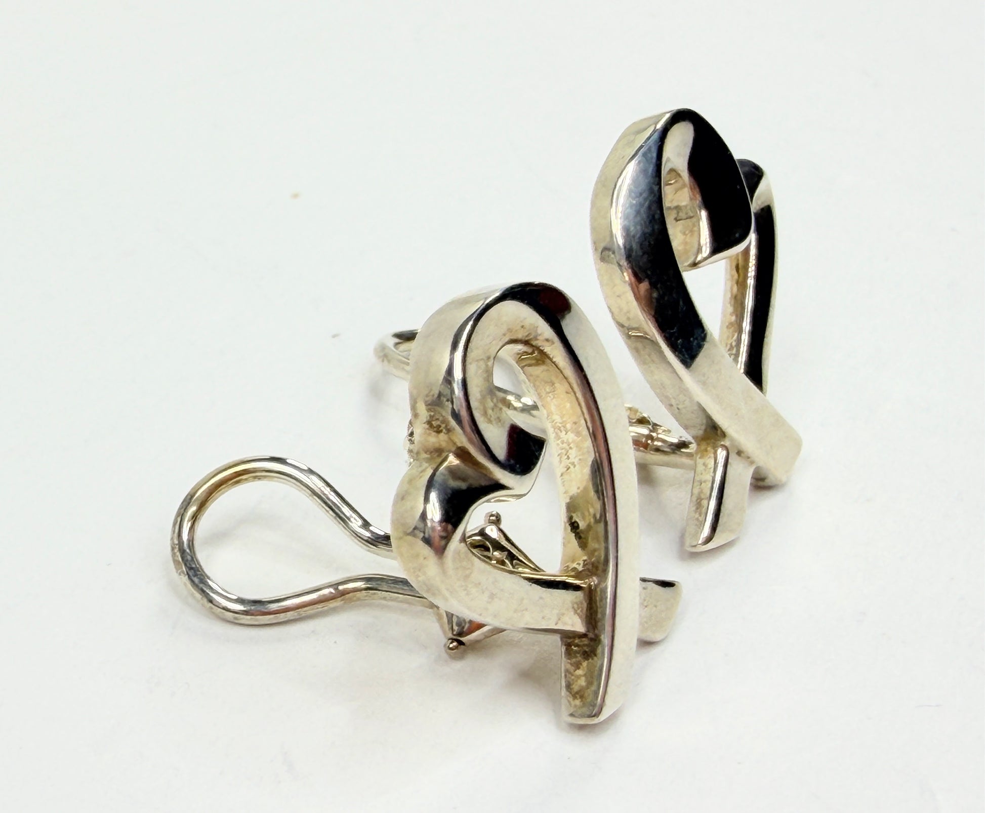 Sculptural Loving Heart earrings designed by Paloma Picasso for Tiffany & Co., crafted in sterling silver with flowing ribbon-like curves that form an open heart silhouette. The design reflects Picasso’s signature expressive style, combining softness and strength through fluid contours and balanced proportions. The polished silver surface enhances the dimensional form, offering a timeless, wearable statement piece from one of Tiffany’s most iconic collections. It comes with a Tiffany box/pouch.