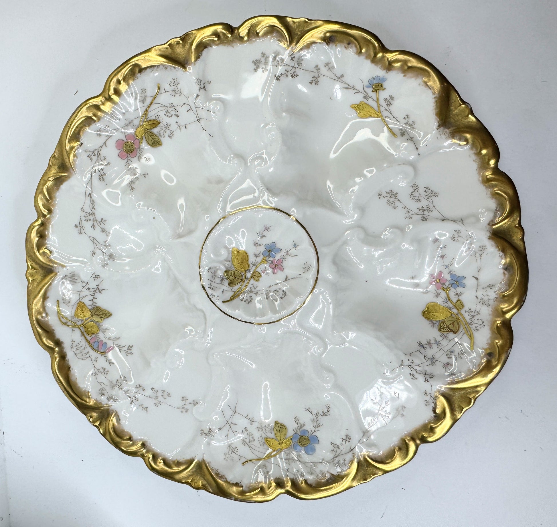 This antique oyster plate has five wells for oysters and a small center well for lemon or sauce. It has a beautiful form and enameled flowers with gold-paste leaves. The scalloped and molded rim is trimmed in gold.