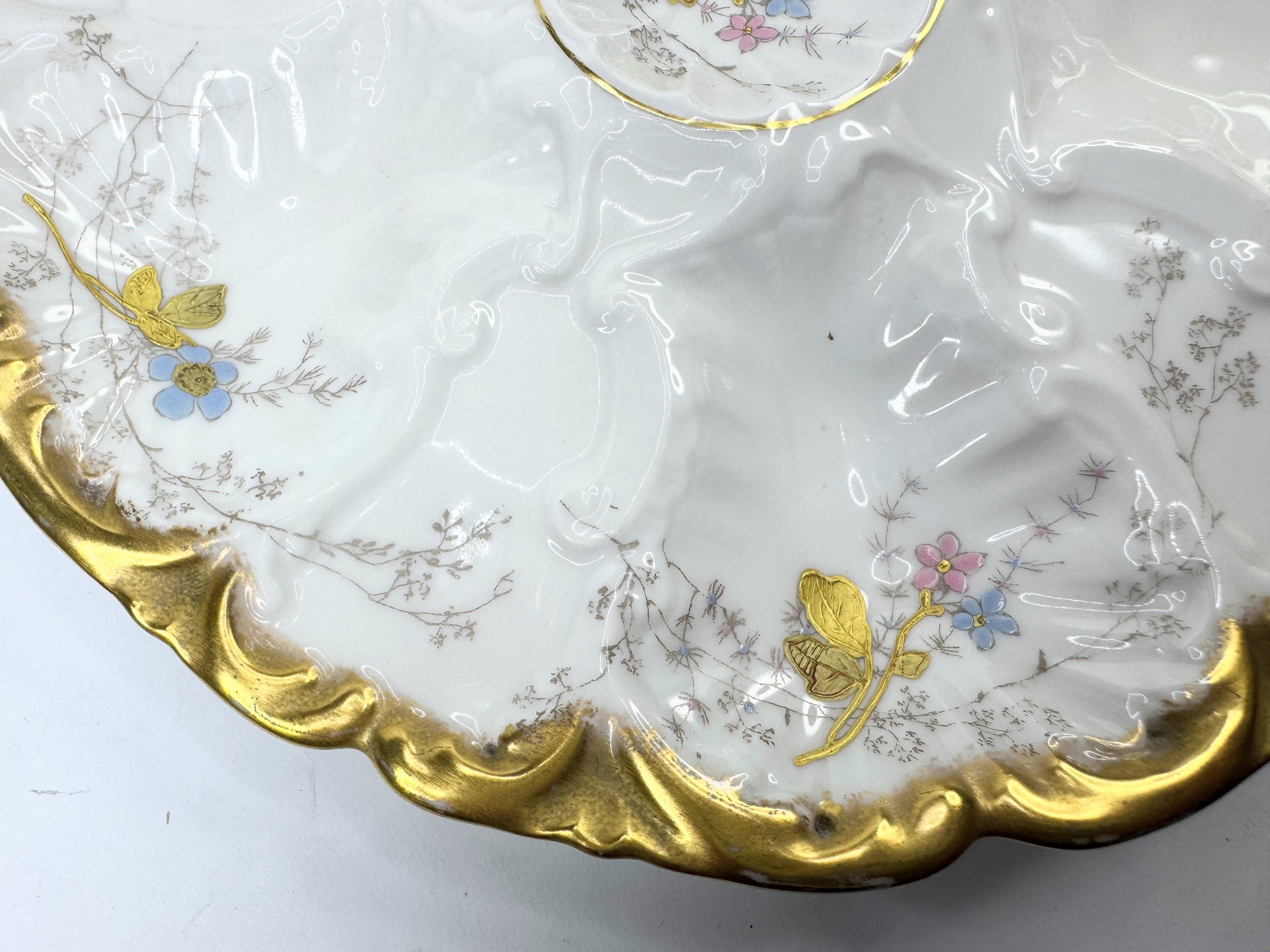 A single-owner private collection of this beautiful antique Limoges porcelain oyster plate. We have a set of four with a different flower pattern and the same design. In another listing, the sale is for the one in the photos.
