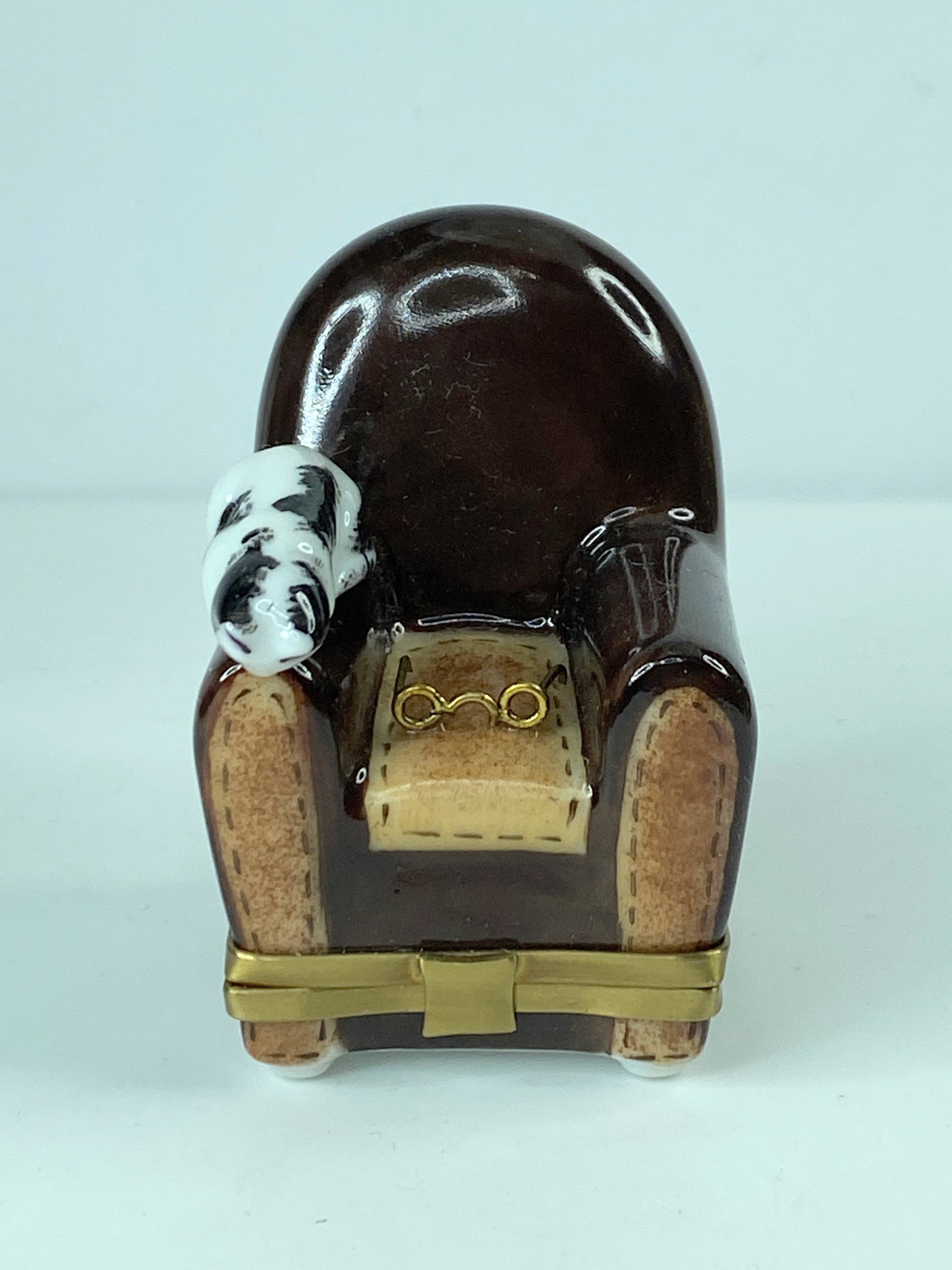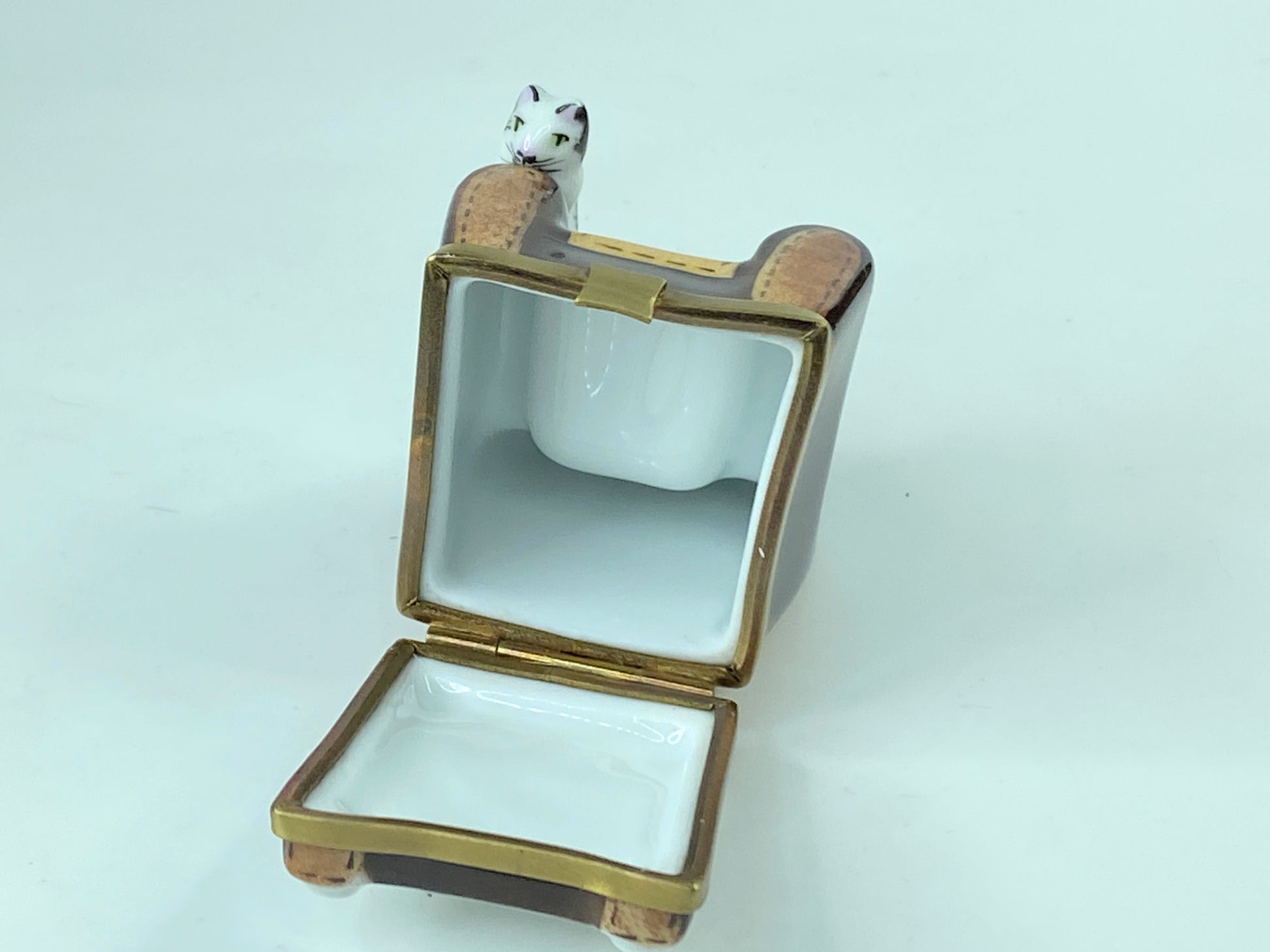 Very collectible and rare Limoges sleeping cat on a chair, trinket box. About 3 inches.