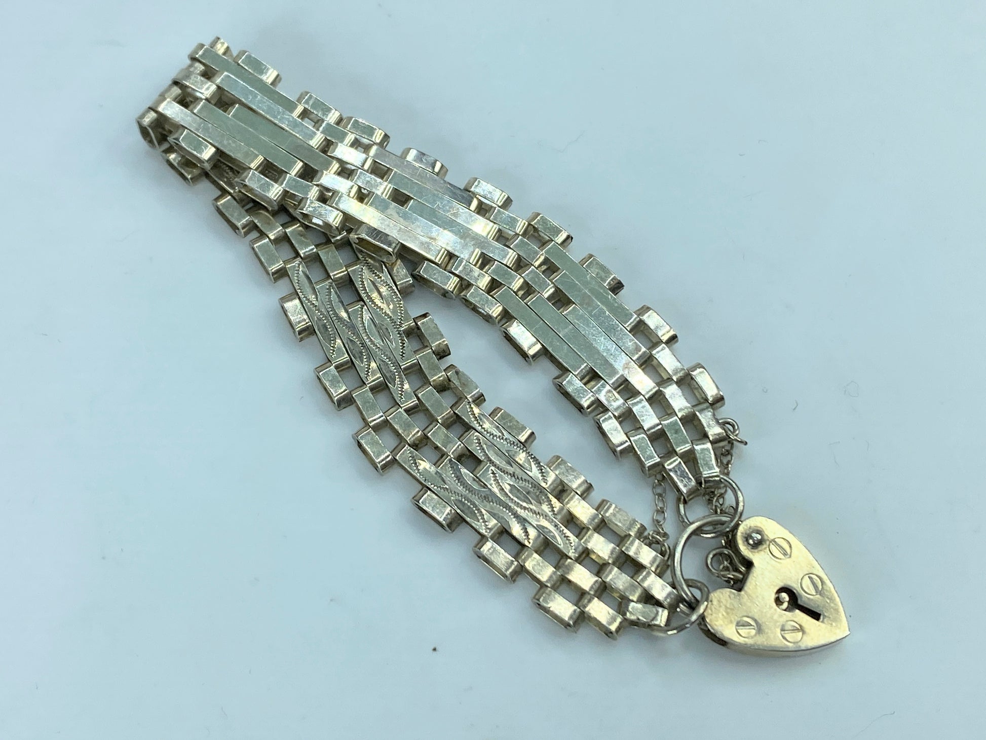 This beautiful vintage bracelet has great style, featuring a four-bar gate design with a padlock closure and safety chain, all fashioned from sterling silver hallmarked London 1979. The padlock able to pull to open and press to lock.