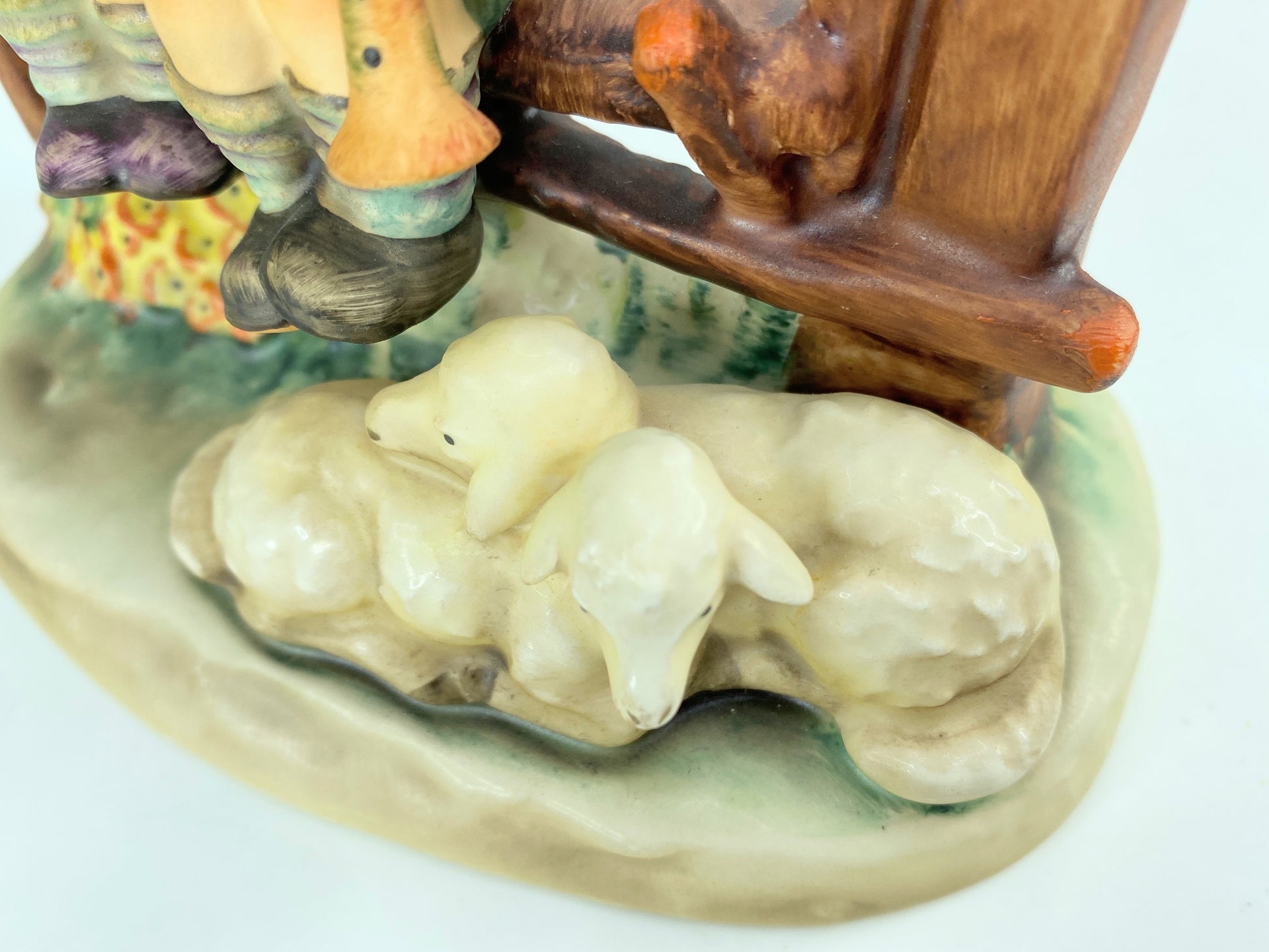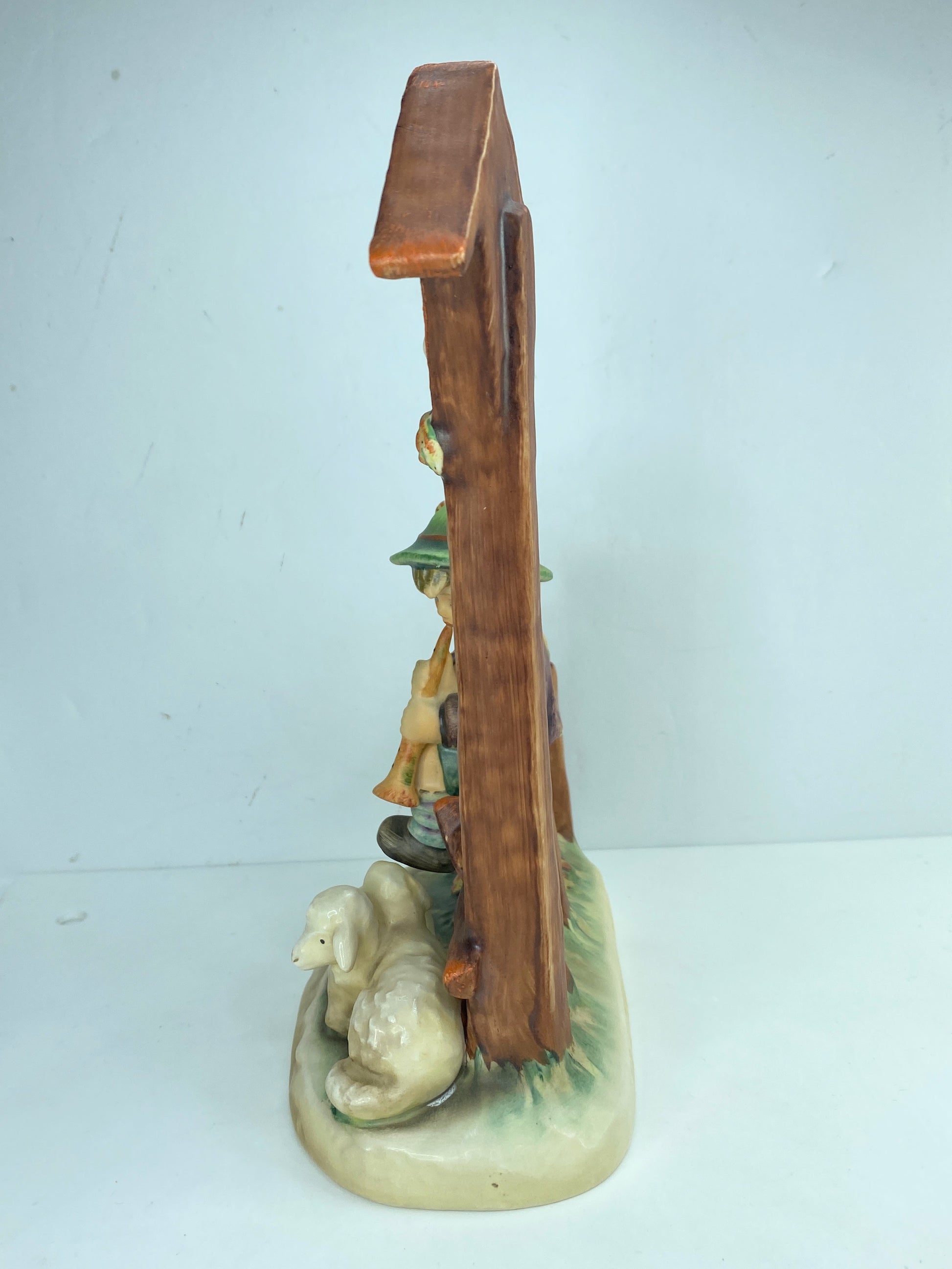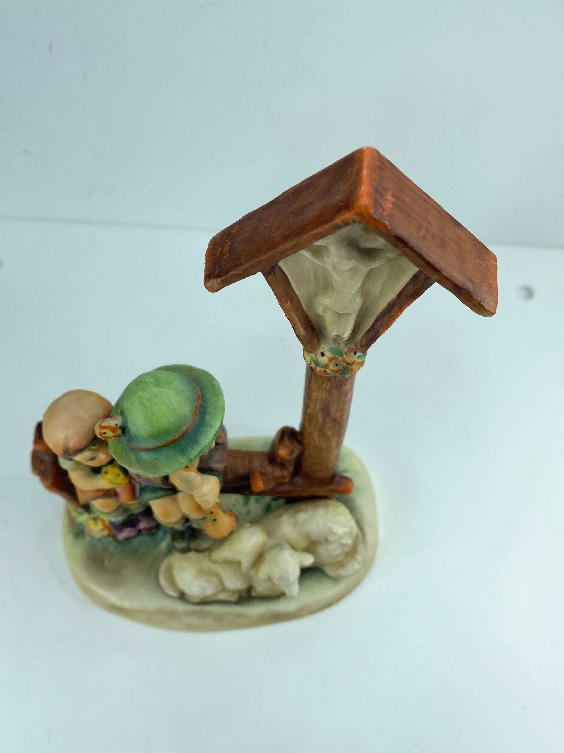 Like all Hummel figurines, this piece takes one back to the days of youth/ a peaceful, contemplative moment of musical meditation. The boy and girl sit on a fence beneath an illuminated crucifix, with two playful lambs at their feet. This figurine is used and in excellent condition, with no repairs, chips, or cracks, and only some light crazing on the bottom and the base edge. It will be delightful in the best classical decor. Approximate dimensions: 7 1/24" x 5" x 2 4/5"S. It is in excellent condition