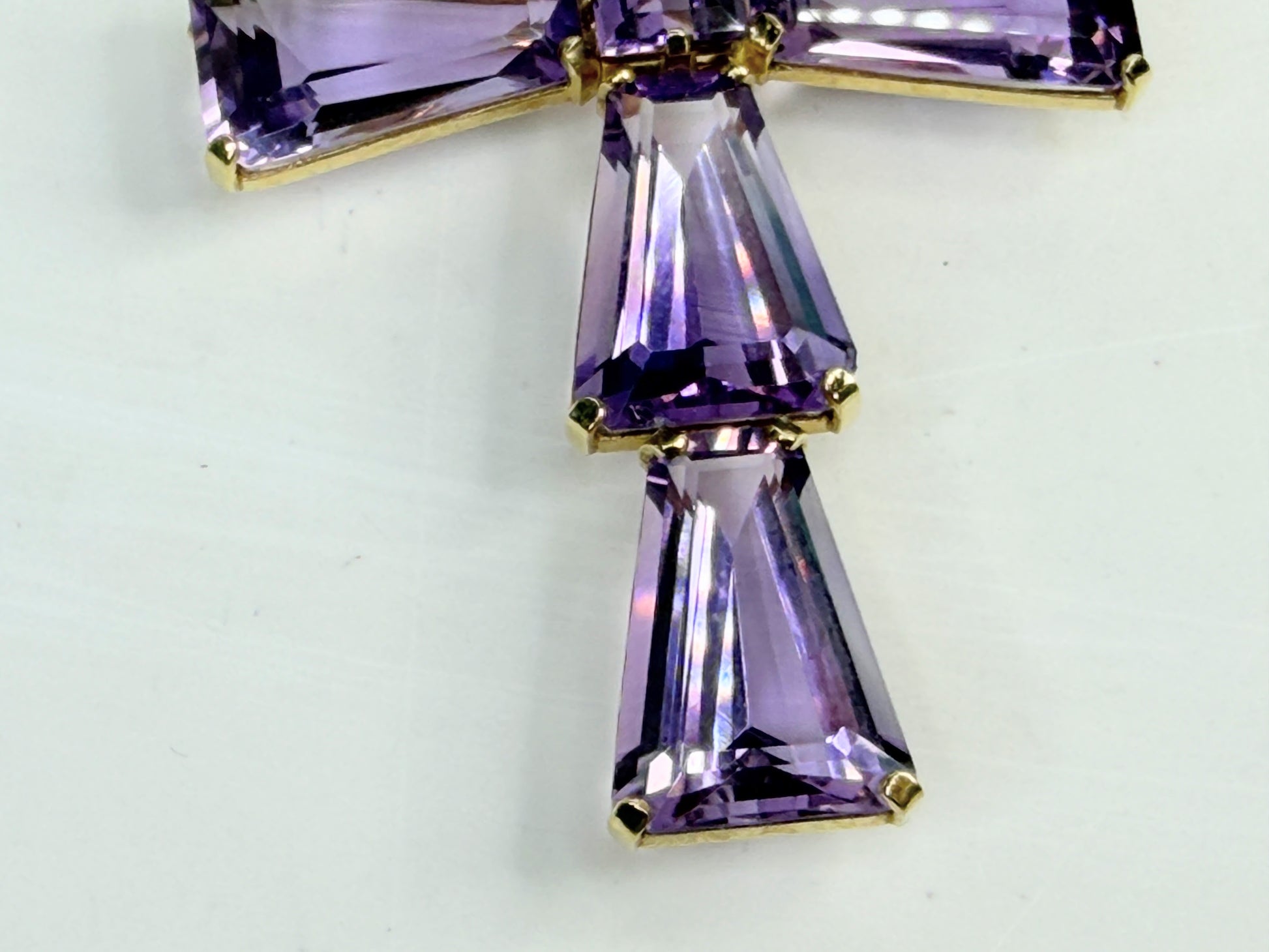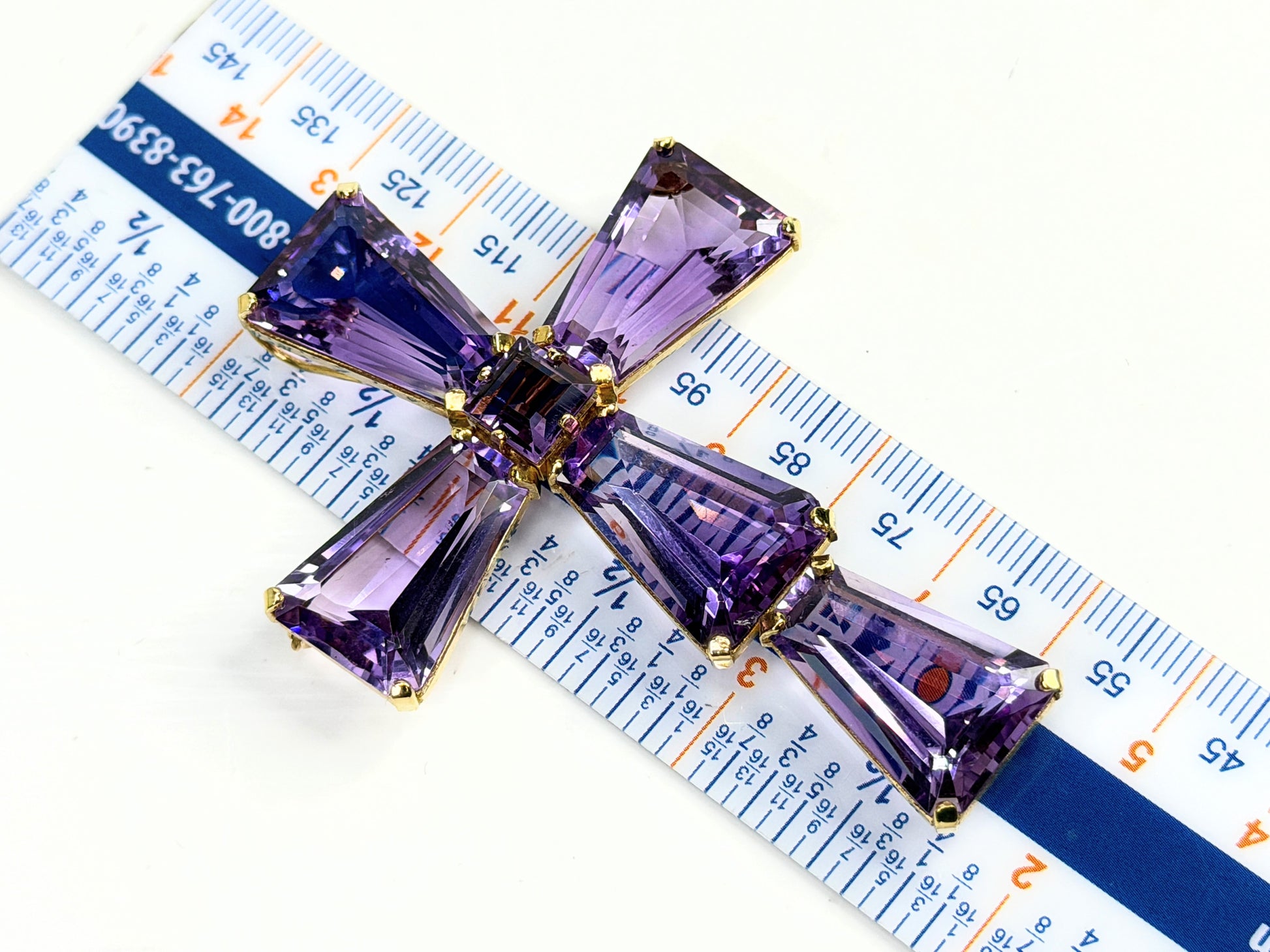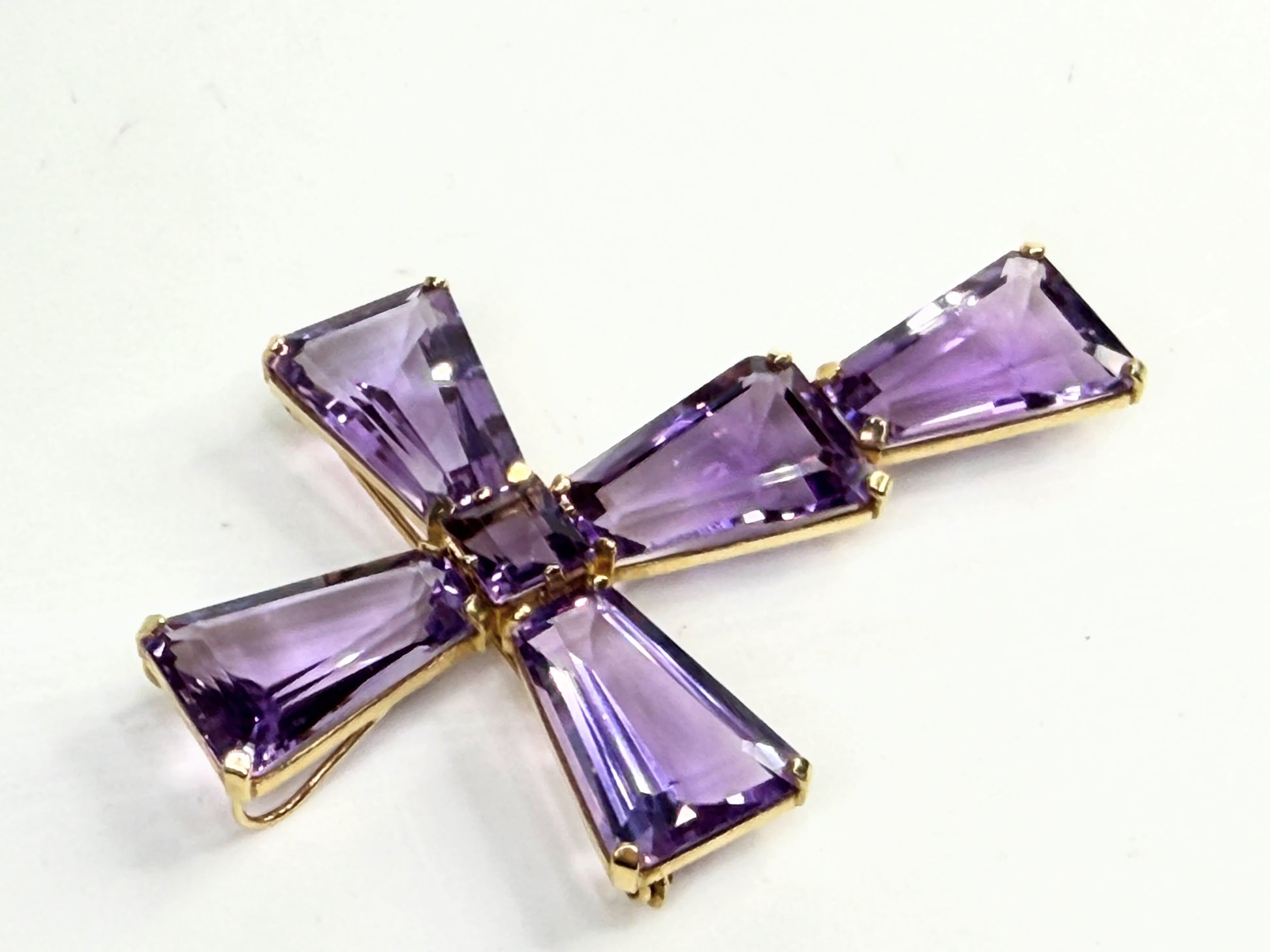This striking mid-century cross is a bold, sculptural composition, handcrafted in solid 14K gold and set with richly saturated amethysts in architectural formation. Five elongated trapezoid-cut amethysts form the arms of the cross, each measuring approximately 21 x 15 x 7 mm, displaying a luminous violet tone with flashes of lavender and deep royal purple as the light moves across their faceted planes. At the center rests an 8 mm princess-cut amethyst, anchoring the design with geometric precision and brilliance.