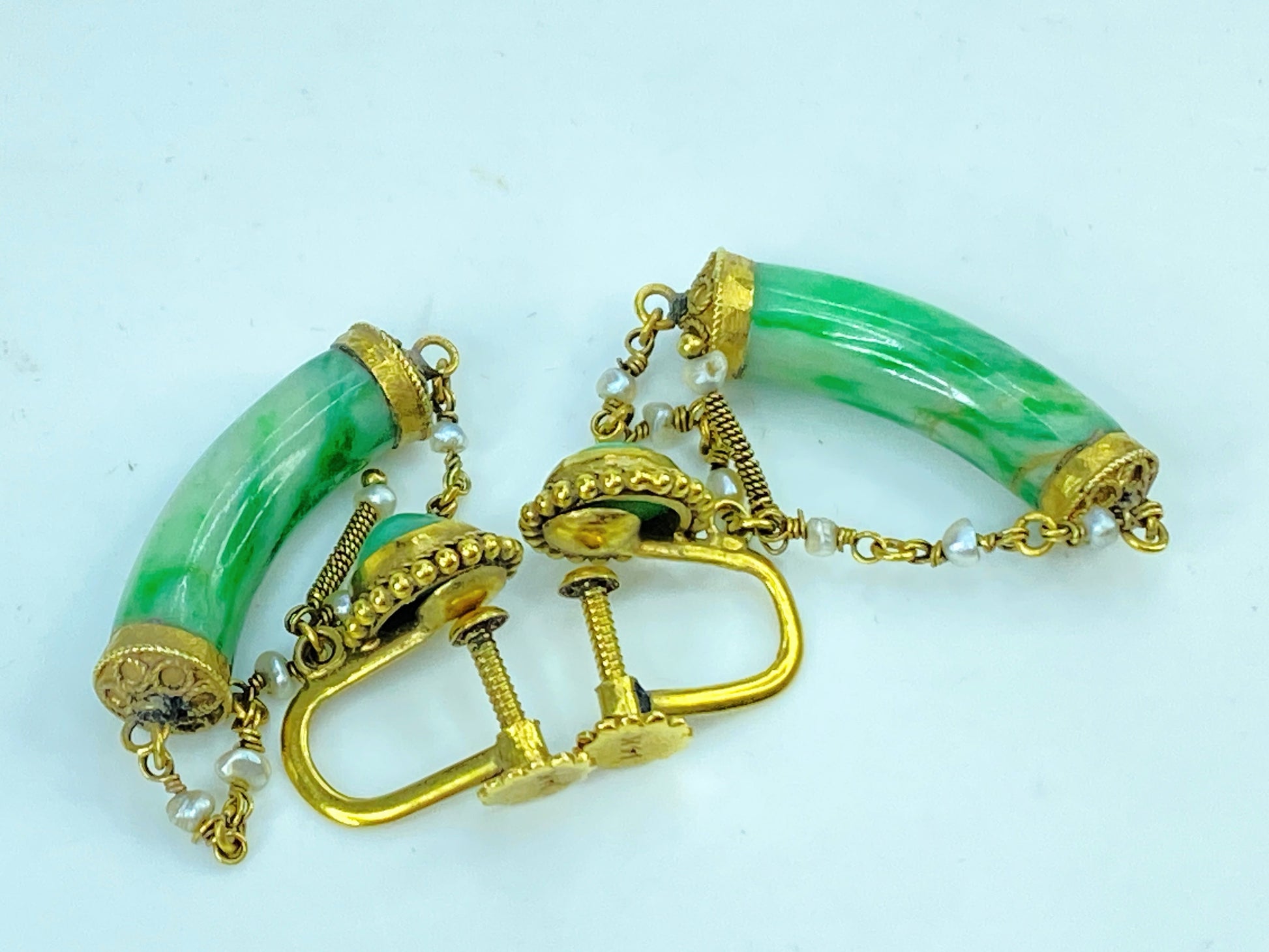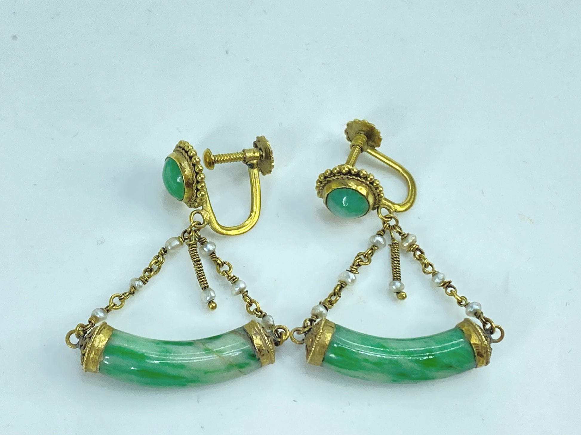 Mid-Century 14K Gold Jadeite & Seed Pearl Screw-Back Dangle Earrings 7.9g