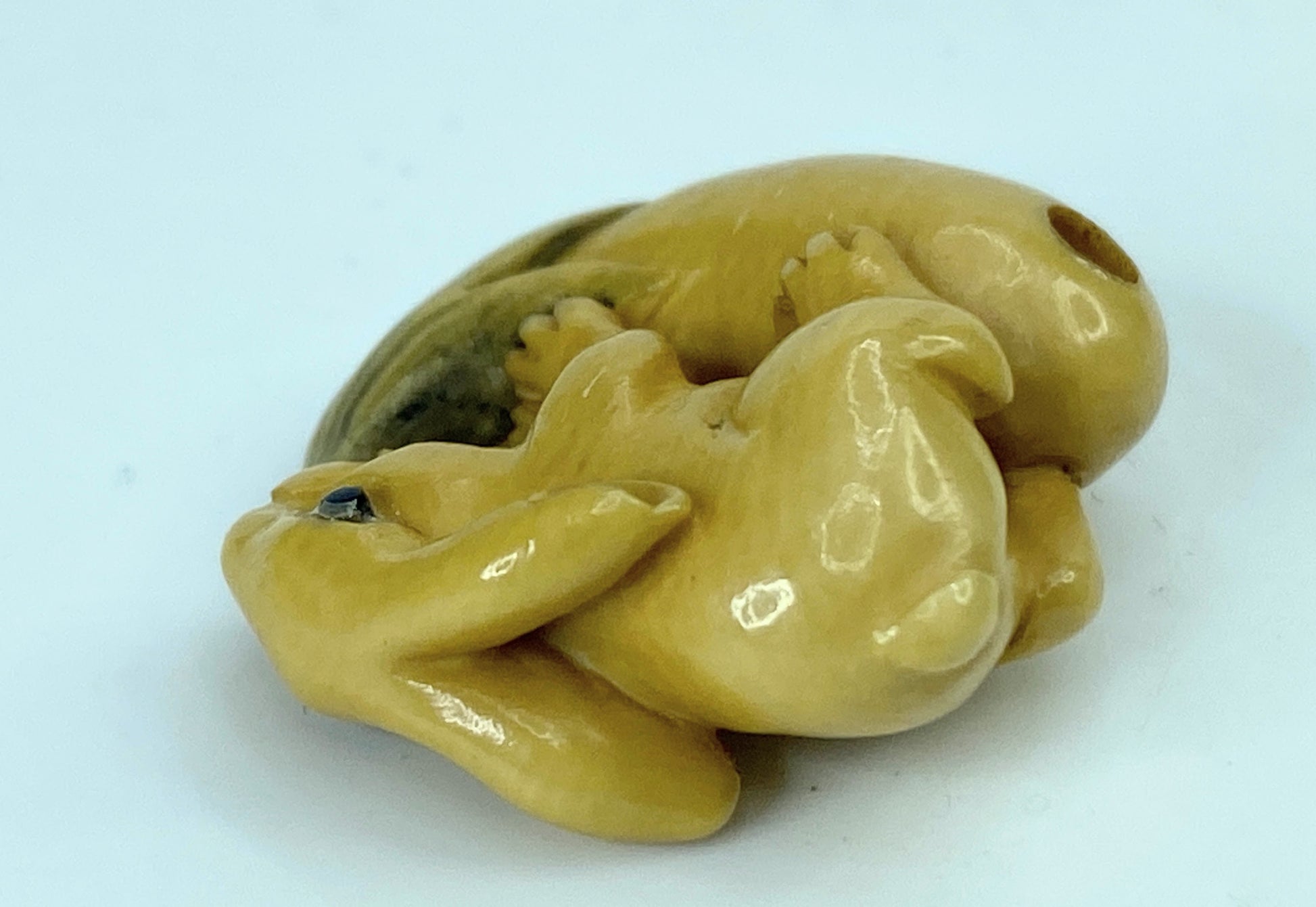 Mid century bone netsuka Rabbit pulling a squash 22.5mm GS646